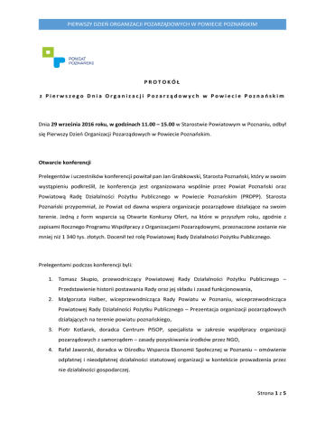 PIERWSZY DZIEŃ ORGANIZACJI POZARZĄDOWYCH W POWIECIE POZNAŃSKIM PROTOKÓŁ z Pierwszego Dnia Organizacji Pozarządowych w Powiecie Poznańskim Dnia 29 września 2016 roku, w godzinach 11.00 – 15.00 w Starostwie Powiatowym w Poznaniu, odbył się Pierwszy Dzień Organizacji Pozarządowych w Powiecie Poznańskim. Otwarcie konferencji Prelegentów i uczestników konferencji powitał pan Jan Grabkowski, Starosta Poznański, który w swoim wystąpieniu podkreślił, że konferencja jest organizowana wspólnie przez Powiat Poznański oraz Powiatową Radę Działalności Pożytku Publicznego w Powiecie Poznańskim (PRDPP). Starosta Poznański przypomniał, że Powiat od dawna wspiera organizacje pozarządowe działające na swoim terenie. Jedną z form wsparcia są Otwarte Konkursy Ofert, na które w przyszłym roku, zgodnie z zapisami Rocznego Programu Współpracy z Organizacjami Pozarządowymi, przeznaczone zostanie nie mniej niż 1 340 tys. złotych. Docenił też rolę Powiatowej Rady Działalności Pożytku Publicznego. Prelegentami podczas konferencji byli: 1. Tomasz Skupio, przewodniczący Powiatowej Rady Działalności Pożytku Publicznego – Przedstawienie historii postawania Rady oraz jej składu i zasad funkcjonowania, 2. Małgorzata Halber, wiceprzewodnicząca Rady Powiatu w Poznaniu, wiceprzewodnicząca Powiatowej Rady Działalności Pożytku Publicznego – Prezentacja organizacji pozarządowych działających na terenie powiatu poznańskiego, 3. Piotr Kotlarek, doradca Centrum PISOP, specjalista w zakresie współpracy organizacji pozarządowych z samorządem – zasady pozyskiwania środków przez NGO, 4. Rafał Jaworski, doradca w Ośrodku Wsparcia Ekonomii Społecznej w Poznaniu – omówienie odpłatnej i nieodpłatnej działalności statutowej organizacji w kontekście prowadzenia przez nie działalności gospodarczej. Strona 1 z 5 PIERWSZY DZIEŃ ORGANIZACJI POZARZĄDOWYCH W POWIECIE POZNAŃSKIM Dyskusje panelowe moderowali: 1. Rafał Jaworski – panel „Ekonomia społeczna i pozyskiwanie środków”, 2. Ewa Buczyńska, regionalistka, współautorka wydawnictw o ziemi swarzędzkiej i Puszczy Zielonce – panel „Kultura i regionalizm”, 3. Jan Mazurczak, prezes Poznańskiej Lokalnej Organizacji Turystycznej – panel „Sport i turystyka”. Na konferencję przybyło 58 przedstawicieli organizacji pozarządowych i jednostek samorządu terytorialnego, którzy po zakończeniu części wspólnej podzielili się na trzy grupy dyskusyjne. Wystąpienie pana Tomasza Skupio W swoim wystąpieniu Przewodniczący Tomasz Skupio przybliżył genezę oraz historię powstania Powiatowej Rady Działalności Pożytku Publicznego w Powiecie Poznańskim oraz skład osobowy pierwszej kadencji i zasady jej funkcjonowania. W pierwszej części przedstawił kolejne etapy tworzenia PRDPP, począwszy od złożenia wniosku o jej powołanie aż do jej powstania. Następnie określił ustalone przez ustawodawcę kompetencje Rady oraz tryb i sposób wyłonienia jej członków. Przedstawił także zgromadzonym słuchaczom podstawowe informacje na temat każdego z członków Rady. Wystąpienie pani Małgorzaty Halber Pani Małgorzata Halber w swoim wystąpieniu podkreśliła, że spotkanie przedstawicieli organizacji pozarządowych to pierwszy krok długiej drogi w kierunku wzajemnego poznania i sieciowania NGOsów. Wskazała także na trudności o charakterze geograficznym, z którymi musi borykać się powiat poznański składający się z 17 gmin dookoła miasta Poznań. Często w związku z tym przedstawicieli różnych gmin dzieli odległość kilkudziesięciu kilometrów. Pani Halber zauważyła, iż na terenie powiatu poznańskiego działa bardzo duża liczba organizacji pozarządowych o zróżnicowanym profilu aktywności. Niektóre charakteryzowały się długoletnim stażem i szerokim spektrum działania, inne powstały niedawno i skierowane są do wąskiej grupy odbiorców. Celem istnienia części organizacji jest wspieranie innych osób, zaś część powstała w celu Strona 2 z 5 PIERWSZY DZIEŃ ORGANIZACJI POZARZĄDOWYCH W POWIECIE POZNAŃSKIM ułatwienia realizacji pasji ich członków. Przedstawiciele obu wymienionych typów podmiotów zdecydowali się uczestniczyć w Pierwszym Dniu Organizacji Pozarządowych Powiatu Poznańskiego. Wzajemna prezentacja uczestników Istotnym punktem konferencji było wzajemne poznanie się przedstawicieli organizacji pozarządowych przybyłych do Starostwa Powiatowego w Poznaniu. W tym celu każdy z uczestników przedstawił reprezentowaną przez siebie organizację i przybliżył profil jej działania. Prelekcja pana Piotra Kotlarka Pan Piotr Kotlarek w swojej prelekcji przedstawił reprezentowaną przez siebie organizację PISOP a także główne pola jej aktywności. Przybliżył też słuchaczom kwestie zarządzania i planowania strategicznego oraz pozyskiwania środków na działalność organizacji pozarządowych. Wśród podstawowych źródeł finansowania organizacji wskazał pozyskiwanie dotacji ze środków publicznych i prywatnych, odpisy 1% podatku od osób fizycznych na rzecz organizacji pożytku publicznego oraz dochody z działalności odpłatnej pożytku publicznego i działalności gospodarczej. Wskazał także na kwestie związane z pozyskiwaniem składek członkowskich, darowizn i przeprowadzania zbiórek publicznych. Prelekcja pana Rafała Jaworskiego Rafał Jaworski w swoim wystąpieniu rozwinął temat rozróżnienia nieodpłatnej i odpłatnej działalności pożytku publicznego od działalności gospodarczej prowadzonej przez organizacje pozarządowe. Przedstawił także kwestie uruchamiania i funkcjonowania przedsiębiorstw społecznych oraz możliwości uzyskania wsparcia finansowego dla tego typu podmiotów. Panele tematyczne - panel „Ekonomia społeczna i pozyskiwanie środków” Moderatorem panelu „Ekonomia społeczna i pozyskiwanie środków”, był pan Rafał Jaworski. W pierwszej części panelu prowadzący 