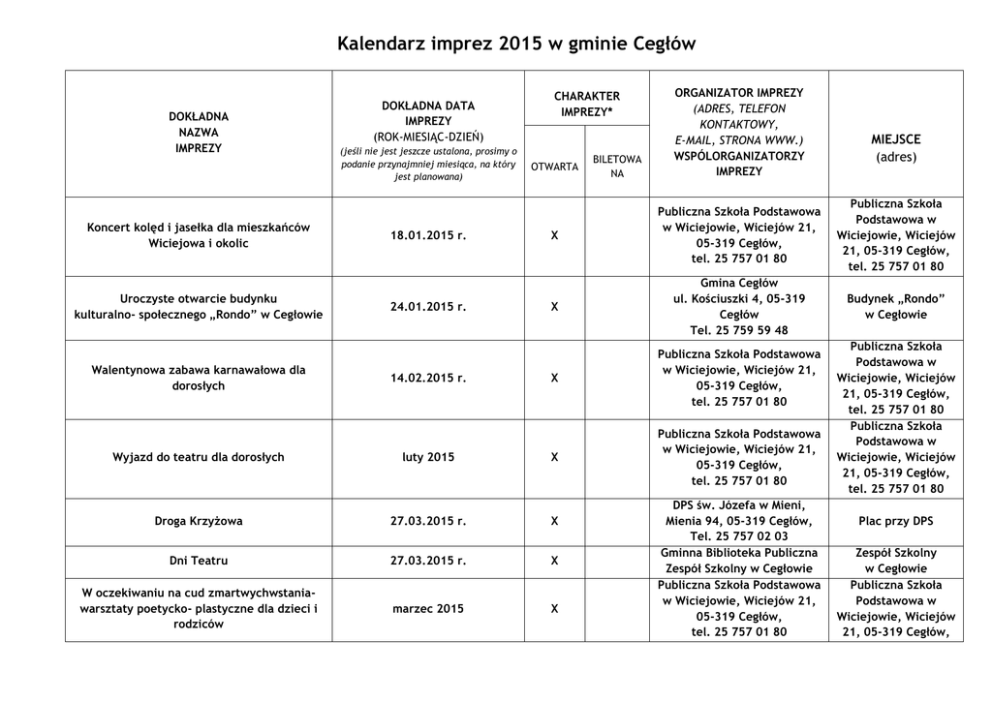 Kalendarz imprez 2015 w gminie Cegłów DOKŁADNA NAZWA IMPREZY Koncert kolęd i jasełka dla mieszkańców Wiciejowa i okolic Uroczyste otwarcie budynku kulturalno- społecznego „Rondo” w Cegłowie Walentynowa zabawa karnawałowa dla dorosłych DOKŁADNA DATA IMPREZY (ROK-MIESIĄC-DZIEŃ) (jeśli nie jest jeszcze ustalona, prosimy o podanie przynajmniej miesiąca, na który jest planowana) 18.01.2015 r. 24.01.2015 r. 14.02.2015 r. CHARAKTER IMPREZY* OTWARTA BILETOWA NA ORGANIZATOR IMPREZY (ADRES, TELEFON KONTAKTOWY, E-MAIL, STRONA WWW.) WSPÓLORGANIZATORZY IMPREZY MIEJSCE (adres) X Publiczna Szkoła Podstawowa w Wiciejowie, Wiciejów 21, 05-319 Cegłów, tel. 25 757 01 80 Publiczna Szkoła Podstawowa w Wiciejowie, Wiciejów 21, 05-319 Cegłów, tel. 25 757 01 80 X Gmina Cegłów ul. Kościuszki 4, 05-319 Cegłów Tel. 25 759 59 48 Budynek „Rondo” w Cegłowie X Publiczna Szkoła Podstawowa w Wiciejowie, Wiciejów 21, 05-319 Cegłów, tel. 25 757 01 80 Publiczna Szkoła Podstawowa w Wiciejowie, Wiciejów 21, 05-319 Cegłów, tel. 25 757 01 80 Wyjazd do teatru dla dorosłych luty 2015 X Droga Krzyżowa 27.03.2015 r. X Dni Teatru 27.03.2015 r. X W oczekiwaniu na cud zmartwychwstaniawarsztaty poetycko- plastyczne dla dzieci i rodziców marzec 2015 X DPS św. Józefa w Mieni, Mienia 94, 05-319 Cegłów, Tel. 25 757 02 03 Gminna Biblioteka Publiczna Zespół Szkolny w Cegłowie Publiczna Szkoła Podstawowa w Wiciejowie, Wiciejów 21, 05-319 Cegłów, tel. 25 757 01 80 Publiczna Szkoła Podstawowa w Wiciejowie, Wiciejów 21, 05-319 Cegłów, tel. 25 757 01 80 Publiczna Szkoła Podstawowa w Wiciejowie, Wiciejów 21, 05-319 Cegłów, tel. 25 757 01 80 Plac przy DPS Zespół Szkolny w Cegłowie Publiczna Szkoła Podstawowa w Wiciejowie, Wiciejów 21, 05-319 Cegłów, Święto książki – zajęcia literackie dla najmłodszych 23.04.2015 r. X Gminna Biblioteka Publiczna Cegłów, Piłsudskiego 22; 257570181 Dzień Ziemi/ Piknik EOG kwiecień/maj 2015 X Gmina Cegłów Rocznica Konstytucji 3 Maja 1791 03.05.2015 r. X Dni Bibliotek: zajęcia literackie, spotkanie autorskie 8 – 16 maja 2015 r. X Rodzinny rajd rowerowy maj 2015 X Integracja przedszkoli z terenu Powiatu Mińskiego maj 2015 X Dzień otwarty w DPS św. Józefa w Mieni 24.05.2015 r. Święto Rodziny – spotkanie emerytów 27.05.2015 r. Gmina Cegłów Ul. Kościuszki 4; 25-7595948 Gminna Biblioteka Publiczna Cegłów, Piłsudskiego 22; 257570181 Gmina Cegłów, Kościuszki 4; 25-759 59 48 Stowarzyszenie Rozwoju Wsi Podciernie i Okolic, tel. 503 680 314 DPS św. Józefa w Mieni, Mienia 94, 05-319 Cegłów, Tel. 25 757 02 03 Gminna Biblioteka Publiczna w Cegłowie Zespół Szkolny w Cegłowie Przy Pomniku Niepodległości i sala Gminna Biblioteka Publiczna w Cegłowie Targowisko gminne w Cegłowie Zespół Szkolny w Cegłowie OSP DPS św. Józefa w Mieni X Koło ZERiI Sala OSP Cegłów Publiczna Szkoła Podstawowa w Wiciejowie, Wiciejów 21, 05-319 Cegłów, tel. 25 757 01 80 Kocham Cię Polsko-turniej wiedzy o Polsce dla dzieci i rodziców maj 2015 X Publiczna Szkoła Podstawowa w Wiciejowie, Wiciejów 21, 05-319 Cegłów, tel. 25 757 01 80 Turniej o Puchar Wójta Gminy Cegłów czerwiec 2015 X Gmina Cegłów, ul. Kościuszki 4 Tel. 25 759 59 48 Boisko „Orlik” w Cegłowie VIII Memoriał im. Marka Spodara lipiec 2015 X Rodzina i przyjaciele „Orlik” w Cegłowie Festyn „Sójka Mazowiecka” 09.08.2015 r. x Piknik integracyjny „Śpiewać każdy może” 27.08.2015 r. X Gmina Cegłów Ul. Kościuszki 4; 25-7595948 DPS św. Józefa w Mieni, Mienia 94, 05-319 Cegłów, Tel. 25 757 02 03 Stadion w Cegłowie DPS św. Józefa w Mieni KGW Podciernie, Gmina Cegłów Gminna Biblioteka Publiczna Cegłów, Piłsudskiego 22; 257570181 Zespół Szkolny w Cegłowie ul. Poprzeczna 27, Tel. 25 7570179 Gmina Cegłów Cegłów, Piłsudskiego 22; 257570181 Zespół Szkolny w Cegłowie ul. Poprzeczna 27 ; Tel. 257570179 Dożynki gminne 06.09.2015 r. X Spotkanie z kulturą w Cegłowie: wystawa regionalna, występ kabaretu wrzesień 2015 X Święto Patrona Szkoły wrzesień 2015 X Rajd rowerowy październik 2015 X Święto Edukacji Narodowej 15.10.2015 r. X Święto Seniorów październik 2015 X Koło ZERiI Sala OSP Cegłów Święto Niepodległości 11.11.2015 r. X Gmina Cegłów Ul. Kościuszki 4; 25-7595948 Przy Pomniku Niepodległości i sala OSP IV Cegłowski Bieg Niepodległości 11.11.2015 r. x „Wigilia pod chmurką” 20.12.2015 r. X Stowarzyszenie Biegacz Cegłów Gmina Cegłów, GOPS Ul. Kościuszki 4; 25-7595948 Podciernie Sala OSP Cegłów Zespół Szkolny w Cegłowie Targowisko gminne w Cegłowie Zespół Szkolny w Cegłowie Lasy mieńskie sala OSP i plac strażacki Przez cały rok szkolny w Publicznej Szkole Podstawowej w Wiciejowie trwa akcja „Uwolniona książka”, natomiast w każdy czwartek odbywają się zajęcia komputerowe dla dorosłych.