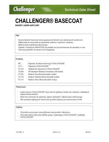 CHALLENGER® BASECOAT BAZOWY LAKIER AKRYLOWY Opis System lakierów bazowych nowej generacji do kolorów uni, metalicznych i perłowych. Odpowiedni do stosowania na samochody osobowe, ciężarowe i autobusy. Skład na bazie kopolimeru akrylowego. Zgodnie z Dyrektywą 2004/42/WE ten produkt nie jest przeznaczony do sprzedaży w celu renowacji pojazdów na terenie Unii Europejskiej. Produkty BC… CLT… CL310 CL650 CL705 CL710 CL715 Pigmenty do lakieru bazowego CHALLENGER® Pigmenty CHALLENGER® Dodatek do trójwarstwy CHALLENGER® HS Hardener Medium (Utwardzacz HS średni) Reducer Fast (Rozcieńczalnik szybki) Reducer Medium (Rozcieńczalnik średni) Reducer Slow (Rozcieńczalnik wolny) Właściwości - Lakier bazowy CHALLENGER® łączy łatwość aplikacji i krótki czas schnięcia z dokładnym dopasowaniem kolorów. Może być stosowany do zaprawek, napraw elementów i lakierowania całościowego. Dla uzyskania najlepszych właściwości powłoki zalecane jest zastosowanie CL650. Podłoża - Wszystkie oczyszczone i przeszlifowane stare powłoki. lakiernicze. Wszystkie lakiery fabryczne (OEM), grunty wypełniające CHALLENGER® i podkłady CHALLENGER®. PL CLBC - 0 Strona 1 z 5 08-2015 CHALLENGER® BASECOAT BAZOWY LAKIER AKRYLOWY PRZYGOTOWANIE PRODUKTU Narzędzia kolorystyczne Znajdź recepturę w oprogramowaniu CHALLENGER®. ® CHALLENGER Proporcja mieszania Proporcje mieszania wzmocniony lakier bazowy Standard Słabe krycie CHALLENGER® Basecoat CL705/CL710/CL715 1 0.8 1 0.5 CHALLENGER® Basecoat CL650 CL705/CL710/CL715 Standard 0.9 0.1 0.8 Słabe krycie 0.9 0.1 0.5 VOC (2004/42/EC) 720-750 g/l Żywotność w 20°C Standard Wzmocniona Lepkość natrysku w 20°C Urządzenia natryskowe DIN 4 FORD 4 AFNOR 4 1:0.8 21-23 s 21-23 s 22-24 s 15-17 s 15-17 s 16-19 s Dysza Odległość (mm) (cm) Pistolety niskociśnieniowe Compliant Górny zbiornik 1.2-1.4 10-15 Dolny zbiornik 1.4-1.6 10-15 Zbior. ciśnieniowy 0.8-1.1 10-15 Pistolety konwencjonalne Górny zbiornik 1.2-1.4 15-20 Dolny zbiornik 1.4-1.6 15-20 Zbior. ciśnieniowy 1.0-1.2 15-20 Ciśnienie natrysku Zgodnie z zaleceniami dostawcy 3-4 3-4 3-4 Ilość warstw 2-3 Czas odparowania Do uzyskania matu między warstwami i przed nałożeniem lakieru bezbarwnego. Dobre do przetarcia ściereczką antystatyczną po 20 min. DFT - grubość Metalik suchej warstwy PL CLBC - 0 Nie stosuje się 8 godz. 1:0.5 10-20 Strona 2 z 5 08-2015 CHALLENGER® BASECOAT BAZOWY LAKIER AKRYLOWY ZALECANE STOSOWANIE Przygotowanie powierzchni 1. 2. 3. 4. 5. 6. 7. Zmyć powierzchnię wodą z mydłem. Spłukać i wysuszyć. Odtłuścić. Wytrzeć do sucha czystą szmatką. Dokonać naprawy zgodnie z rodzajem uszkodzenia. Wyszlifować powierzchnię. a. mechanicznie P320 - P400 (wykończenie P500 da najlepszy efekt); b. na mokro P800 - P1000. Usunąć wszelkie pozostałości po szlifowaniu, przedmuchać sprężonym, wolnym od oleju powietrzem. Odtłuścić. Wytrzeć do sucha czystą ściereczką. Przetrzeć ściereczką antystatyczną. Aplikacja lakieru bezbarwnego Lakier bezbarwny CHALLENGER® musi być nakładany dopiero po uzyskaniu pełnego matu warstwy bazowej CHALLENGER®. Maksymalny czas przed nałożeniem bezbarwnego wynosi 3 dni. Czyszczenie narzędzi Stosować właściwy zmywacz rozcieńczalnikowy do pistoletów. Uwagi - Nie nakładać grubych warstw, spowolnią proces schnięcia. Materiał przed użyciem musi być przechowywany w temperaturze pokojowej (18-25°C). W celu uzyskania większej odporności na uderzenia kamieni oraz lepszej adhezji kohezji, zalecane jest dodanie 10 % CL650 przed rozcieńczeniem. PL CLBC - 0 Strona 3 z 5 08-2015 CHALLENGER® BASECOAT BAZOWY LAKIER AKRYLOWY Dane o produkcie Teoretyczna wydajność: 5-7 m2/l przy zalecanej grubości warstwy (DFT) - gotowego do użycia SPOSOBY NAPRAWY Przygotowanie powierzchni przy zaprawkach i naprawach elementów. 1. 2. 3. 4. Dokonać naprawy zalecanymi poduktami podkładowymi. Wyszlifować miejsca naprawiane zgodnie z zaleceniami. Przygotować całą powierzchnię przeznaczoną do cieniowania przy pomocy drobnej pasty matującej. Dokładnie oczyścić. System wykonania zaprawki i naprawy elementu - Nałożyć 1 warstwę lakieru bazowego CHALLENGER® na zapokładowane miejsce (A). Czas odparowanie 5-10 min. Wytrzeć ściereczką antystatyczną powierzchnię B-C (jeśli to konieczne). - Nałożyć od 2 do 3 warstw. Każdą kolejną warstwę nakładać szerzej niż poprzednią i zawsze pozostawiać na czas odparowania (5 - 10 min) przed nałożeniem następnej warstwy. Przetrzeć ściereczką antystatyczną każdą warstwę w celu wyeliminowania śladów odkurzu wokół warstwy koloru (jeśli konieczne). PL CLBC - 0 Strona 4 z 5 08-2015 CHALLENGER® BASECOAT BAZOWY LAKIER AKRYLOWY Bezpieczeństwo Zapoznać się z Kartami Charakterystyki przed zastosowaniem produktu. Przestrzegać wskazówek zamieszczonych na etykietkach puszek. Wszystkie inne wymienione produkty wchodzące w skład systemu lakierniczego są produktami Challenger®. Właściwości systemu ulegną zmianie kiedy materiał będzie zastosowany w kombinacji z innymi materiałami lub dodatkami nie należącymi do systemu Challenger®, chyba że zostanie to wyraźnie zaznaczone. Produkt przeznaczony jest do stosowania tylko przez profesjonalistów! Informacje zamieszczone w tej dokumentacji zostały przez nas starannie przygotowane. Została ona oparta na naszej najlepszej wiedzy na dzień jej wydania. Instrukcja techniczna służy jedynie celom informacyjnym. Nie ponosimy odpowiedzialności za jej poprawność, dokładność i kompletność. Do obowiązków użytkownika należy sprawdzenie informacji w niej zawartych pod względem aktualności i przystosowania do celów, do których użytkownik zamierza ją wykorzystać. Wartość intelektualna zawarta w informacjach jak patenty, znaki towarowe i prawa autorskie jest chroniona. Wszelkie prawa zastrzeżone. Należy przestrzegać Kart Bezpieczeństwa i wskazówek ostrzegawczych zamieszczonych na o