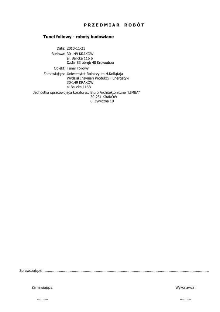 PRZEDMIAR ROBÓT Tunel foliowy - roboty budowlane Data: 2010-11-21 Budowa: 30-149 KRAKÓW al. Balicka 116 b Dz.Nr 83 obręb 48 Krowodrza Obiekt: Tunel Foliowy Zamawiający: Uniwersytet Rolniczy im.H.Kołłątaja Wydział Inzynieri Produkcji i Energetyki 30-149 KRAKÓW al.Balicka 116B Jednostka opracowująca kosztorys: Biuro Architektoniczne "LIMBA" 30-251 KRAKÓW ul.Żywiczna 10 Sprawdzający: ................................................................................................................................................................... Zamawiający: Wykonawca: .......... .......... Zbiór: AR - 001 - Tunel foliowy - kosztorys Tunel foliowy - roboty budowlane Zuzia (C) DataComp 1994-2004 21/11/10 Przedmiar Robót Podstawa nakładu, opis pozycji, wyliczenie ilości robót Ilość Krot. Jedn. 1 ROBOTY ZIEMNE 1 KNR 201/125/2 Ręczne usuniecie warstwy ziemi urodzajnej (humusu), grubość warstwy do 15cm, z przerzutem, humus z darnią R= 0,955 M= 1,000 S= 1,000 1,00*16,00*2 = 0,60*10,60*2 = 32,0 12,72 44,720 m2 Roboty ziemne koparkami podsiębiernymi z transportem urobku samochodami samowyładowczymi do 1km, koparka 0,15m3, grunt kategorii III - ODWÓZ HUMUSU NA TERENIE DZIAŁKI R= 0,955 M= 1,000 S= 1,000 6,708 m3 Wykopy oraz przekopy wykonywane koparkami podsiębiernymi na odkład, koparka 0,15m3, grunt kategorii III R= 0,955 M= 1,000 S= 1,000 17,20*(0,60+0,30+ 0,60)*1,25 = 32,25 (0,60+0,80+16,00+ 0,80+0,60)*(0,60+ 0,80+0,60)*0,95 = 35,72 67,970 m3 -2,16 -6,708 -6,336 52,766 m3 5 KNR 201/212/1 (1) Roboty ziemne koparkami podsiębiernymi z transportem urobku samochodami samowyładowczymi do 1km, w ziemi uprzednio zmagazynowanej w hałdach, koparka 0,15m3, grunt kategorii I-III - ODWÓZ ZIEMI NA SKŁADOWISKO NA 20 ODL.DO 20 KM. R= 0,955 M= 1,000 S= 1,000 67,970-52,766 = 15,204 15,204 m3 15,0204 38,0 m3 186,560 m2 2 KNR 201/205/2 3 KNR 201/217/2 4 KNR 201/230/1 (1) NALOGIA : Zasypywanie wykopów koparko-spycharką 0,15 m3 R= 0,955 M= 1,000 S= 1,000 Całoś wykopu 67,970 = Minus : = chudy beton -2,160 = ławy -6,708 = stopy -6,336 = 67,97 6 KNR 201/214/4 (2) Nakłady uzupełniające do tablic 0201-0213 za każde dalsze rozpoczęte 0,5km odległości transportu, ponad 1km samochodami samowyładowczymi, po drogach utwardzonych, grunt kategorii III-IV, samochód 5-10t R= 0,955 M= 1,000 S= 1,000 7 KNR 201/505/2 Plantowanie powierzchni gruntu rodzimego, ręczne, kategoria gruntu IV R= 0,955 M= 1,000 S= 1,000 10,60*17,60 = 186,56 strona nr 2 Zbiór: AR - 001 - Tunel foliowy - kosztorys Tunel foliowy - roboty budowlane Zuzia (C) DataComp 1994-2004 21/11/10 Podstawa nakładu, opis pozycji, wyliczenie ilości robót Ilość Krot. Jedn. 2 FUNDAMENTY 8 KNR 202/1101/1 (4) L-1 SF-3 Podkłady, betonowe na podłożu gruntowym, beton podawany pompą, zwykły - beton B-10 o gr.10 cm 17,20*0,40*0,10 = 0,688 (0,90*0,90)*0,10*18 = 1,458 2,146 m3 9 KNR 202/604/3 (3) Izolacje przeciwwilgociowe powierzchni poziomych, papą na lepiku na gorąco, 1warstwa - izolacja między chudym betonem , a fundamentami L-1 17,20*0,40 = 6,88 SF-3 (0,90*0,90)*18 = 14,58 21,460 m2 10 KNR 202/202/1 (2) Ławy fundamentowe żelbetowe, prostokątne, szerokość do 0,6m, beton podawany pompą beton B-20 L-1 17,20*0,30*1,30 = 6,708 6,708 m3 11 KNR 202/204/1 (2) Stopy fundamentowe żelbetowe, prostokątne o objętości do 0,5m3, beton podawany pompą beton B-20 SF-3 (0,80*0,80*0,40)*18 = 4,608 (0,40*0,40*0,60)*18 = 1,728 6,336 m3 Izolacje przeciwwilgociowe powłokowe poziome wykonywane na zimno, emulsja asfaltowa, 1warstwa - ABIZOL "R" 17,20*0,30 = 5,16 (0,80*0,80)*18 = 11,52 16,680 m2 Izolacje przeciwwilgociowe powłokowe poziome wykonywane na zimno, emulsja asfaltowa, dodatek za każdą następną warstwę - ABIZOL "P" 16,680 m2 Izolacje przeciwwilgociowe powłokowe bitumiczne pionowe wykonywane na zimno, emulsja asfaltowa, 1warstwa - ABIZOL "R" (0,80+0,80)*2*0,40* 18 = 23,04 (0,40+0,40)*2*0,60* 18 = 17,28 17,20*1,30*2 = 44,72 85,040 m2 Izolacje przeciwwilgociowe powłokowe bitumiczne pionowe wykonywane na zimno, emulsja asfaltowa, dodatek za każdą następną warstwę - ABIZOL "P" 85,040 m2 0,0636 t 17 KNR 202/290/2 (2) Zbrojenie konstrukcji żelbetowych elementów budynków i budowli, pręty stalowe okrągłe żebrowane, Fi 8mm 0,05546 t 18 KNR 202/290/2 (2) Zbrojenie konstrukcji żelbetowych elementów budynków i budowli, pręty stalowe okrągłe żebrowane, Fi 12mm 0,28686 t 12 KNR 202/602/1 L-1 SF-3 13 KNR 202/602/2 14 KNR 202/603/1 SF-3 L-1 15 KNR 202/603/2 3 STAL ZBROJENIOWA 16 KNR 202/290/1 (2) Zbrojenie konstrukcji żelbetowych elementów budynków i budowli, pręty stalowe okrągłe gładkie, Fi 8mm 4 KONSTRUKCJA STALOWA 19 Dostawa na budowę stalowych rygli R-3 wykonanych wg.rysunku konstrukcyjnego K-09 i zabezpieczonych antykorozyjnie wg.Opisu Technicznego ( 2 szt ) 135,20 kg strona nr 3 Zbiór: AR - 001 - Tunel foliowy - kosztorys Tunel foliowy - roboty budowlane Zuzia (C) DataComp 1994-2004 21/11/10 Podstawa nakładu, opis pozycji, wyliczenie ilości robót 20 21 22 23 KNR 205/208/5 Ilość Krot. Jedn. Dostawa na budowę stalowych rygli R-4 wykonanych wg.rysunku konstrukcyjnego K-09 i zabezpieczonych antykorozyjnie wg.Opisu Technicznego ( 3 szt ) 203,90 kg Dostawa na budowę stalowych rygli R-4.1. wykonanych wg.rysunku konstrukcyjnego K-09 i zabezpieczonych antykorozyjnie wg.Opisu Technicznego ( 1 szt ) 68,60 kg Dostawa na budowę stalowych rygli R-5 wykonanych wg.rysunku konstrukcyjnego K-09 i zabezpieczonych antykorozyjnie wg.Opisu Technicznego ( 3 szt ) 186,10 kg ANALOGIA : Montaż konstrukcji stalowych - RYGLE 0,13520+0,20390+ 0,0686+0,18610 = 0,5938 0,594 t 24 Dostawa na budowę stalowych słupów S-4 wykonanych wg.rysunku konstrukcyjnego K-08 i zabezpieczonych antykorozyjnie wg.Opisu Technicznego ( 6 szt ) 380,00 kg 25 Dostawa na budowę stalowych słupów S-4.1 wykonanych wg.rysunku konstrukcyjnego K-08 i zabezpieczonych antykorozyjnie wg.Opisu Technicznego ( 6 szt ) 380,00 kg Dostawa na budowę stalo