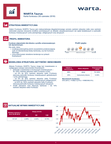 WARTA Taurus Karta funduszu (30 czerwiec 2016) STRATEGIA INWESTYCYJNA Celem Funduszu WARTA Taurus jest maksymalizacja długoterminowego wzrostu wartości aktywów netto oraz wartości Jednostek poprzez lokowanie środków pochodzących ze składek ubezpieczeniowych lub wpłat dodatkowych w jednostki funduszy inwestycyjnych rynku pieniężnego, obligacyjnych oraz akcyjnych PROFIL INWESTORA Fundusz odpowiedni dla klienta o profilu zrównoważonym lub dynamicznym. Profil ryzyka Dla osób, które: oczekują potencjalnej premii zauważalnie przekraczającej zysk ze standardowej lokaty bankowej, czy też funduszu dłużnego chcą wykorzystać określone tendencje na rynkach finansowych MODELOWA STRUKTURA AKTYWÓW I BENCHMARK Aktywa Funduszu WARTA Taurus mogą być inwestowane w następujące rodzaje instrumentów finansowych: jednostki uczestnictwa w funduszach inwestycyjnych – do 100% wartości aktywów netto Funduszu w tym: - od 0% do 30% wartości aktywów netto Funduszu stanowią jednostki funduszy inwestycyjnych gotówkowych i rynku pieniężnego, - od 0% do 30% wartości aktywów netto Funduszu stanowią jednostki funduszy inwestycyjnych obligacyjnych, - od 40% do 100% wartości aktywów netto Funduszu stanowią jednostki funduszy inwestycyjnych akcyjnych środki pieniężne oraz depozyty bankowe – do 10% wartości aktywów netto Funduszu AKTUALNE WYNIKI INWESTYCYJNE Bieżąca wycena z dnia 30-06-2016 127,25 Stopy zwrotu 1M 6M 12M -2,06% -4,52% -9,74% 1 Udział w benchmarku Klasa aktywów Dopuszczalny udział 80% akcje 70-100% 20% Instrumenty dłużne 0-30% Benchmark funduszu: WIG (80%) + PGBI[1+](10%) + WIBID3M(10%) BIEŻĄCA STRUKTURA PORTFELA 5 największych ekspozycji w fundusze akcji udział w portfelu (%) PKO Akcji PLUS 26,25 INVESTOR Akcji 11,25 UNIKORONA Akcje 11,25 UNIAKCJE MIŚ 11,25 SUPERFUND Akcji 11,25 5 największych ekspozycji w funduszach dłużnych 0,50 1,00 9,50 15,00 3,75 PKO Obligacji PLUS 3,00 INVESTOR Obligacji 3,00 PKO Skarbowy 2,50 BPH Obligacji 2 2,25 Fundusze Obligacji Fundusze Obligacji 10,00 70,00 udział w portfelu (%) NN Obligacji Fundusze FunduszeAkcji Akcji 19,00 75,00 Fundusze Pieniężne Fundusze Pieniężne Depozyty Depozyty KOMENTARZ RYNKOWY Na rynkach wzrosła zmienność po decyzji obywateli Wielkiej Brytanii odnośnie opuszczenia Unii Europejskiej. Po początkowych znacznych spadkach akcje odrabiają straty i sytuacja się nieco uspokaja jednak dla większości rozwiniętych rynków akcji czerwiec nie był udany. Na lokalnym rynku do rozwiązania pozostały jeszcze dwie kwestie: kredytów frankowych oraz kolejna faza demontażu OFE, które do tej pory skutecznie przeciwdziałały wzrostom indeksów giełdowych. Głównie z tych powodów udział akcji w portfelu utrzymywany jest wciąż poniżej modelowego poziomu. Niespodziewany wynik referendum w Wielkiej Brytanii wpłynął na wzrost cen bezpiecznych aktywów. W ślad za rynkami bazowymi zaczęły rosnąć również ceny polskich papierów skarbowych (rentowność w segmencie 10 lat obniżyła się do 2,9% z okolic 3,1%). Sytuacja makro nie zmieniła się znacząco w ciągu ostatniego miesiąca, wstępne dane odnośnie inflacji za czerwiec pokazują że wciąż tkwimy w środowisku deflacyjnym (odczyt -0,8% r/r). W tym roku raczej nie należy oczekiwać zmian stóp procentowych, co znajduje odzwierciedlenie w wypowiedziach członków RPP. KONTAKT: Infolinia Warty 502 308 308 (Opłata zgodna z taryfą operatora). NOTA PRAWNA Wszelkie opinie i oceny zawarte w niniejszym opracowaniu wyrażają opinie Ubezpieczyciela w dniu jego wydania. Opracowanie przygotowano dochowując należytej staranności, wykorzystując źródła informacji, które Ubezpieczyciel uważa za wiarygodne i dokładne, jednakże nie istnieje gwarancja, iż są one wyczerpujące i w pełni odzwierciedlają stan faktyczny. Wykresy i diagramy przedstawione w niniejszym opracowaniu mają charakter wyłącznie ilustracyjny, nie są one ani doradztwem inwestycyjnym, ani prognozą. Ubezpieczyciel nie świadczy usług doradztwa inwestycyjnego, ani nie udziela porad inwestycyjnych a informacje nie mają w żadnym wypadku charakteru porady inwestycyjnej. Szczegółowe informacje dotyczące umowy ubezpieczenia znajdują się w Ogólnych Warunkach Ubezpieczenia dostępnych w placówkach Ubezpieczyciela i/lub stronie internetowej www.warta.pl. Przed zawarciem umowy Klient samodzielnie określa poziom akceptowalnego przez siebie ryzyka, potencjalne korzyści oraz straty z nią związane, jak również w szczególności charakterystykę, konsekwencje prawne, podatkowe i księgowe umowy. Powielanie bądź publikowanie niniejszego opracowania lub jego części bez pisemnej zgody Ubezpieczyciela jest zabronione. Niniejszy materiał nie stanowi oferty w rozumieniu art. 66 Kodeksu cywilnego. Towarzystwo Ubezpieczeń na Życie WARTA S.A. wpisane przez Sąd Rejonowy dla M. St. Warszawy do rejestru przedsiębiorców Krajowego Rejestru Sądowego, XII Wydział Gospodarczy Krajowego Rejestru Sądowego, Nr KRS: 0000023648, NIP 113-15-36-859. 2
