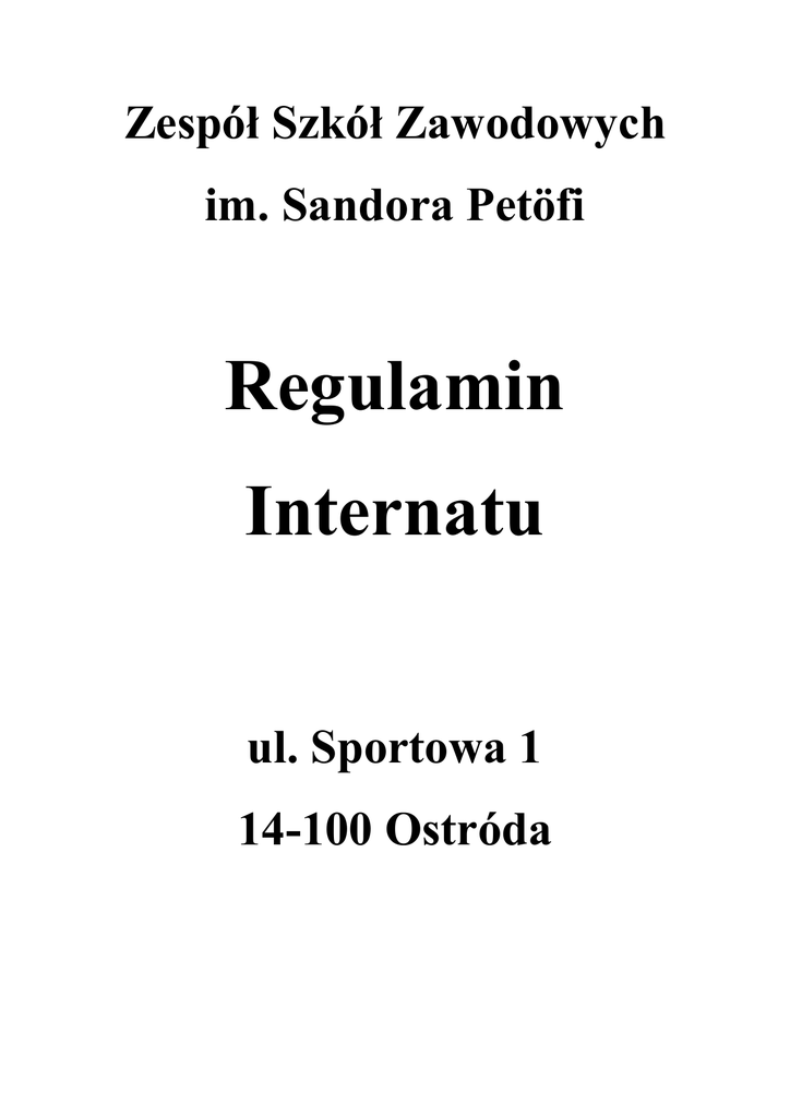 Zespół Szkół Zawodowych im. Sandora Petöfi Regulamin Internatu ul. Sportowa 1 14-100 Ostróda SPIS TREŚCI: Rozdział I Podstawy prawne wydania regulaminu …………………………………….2 Rozdział II Postanowienia ogólne………………………………………………………...2 Rozdział III Cele i zadania internatu……………………………………………………...3 Rozdział IV Organizacja internatu………………………………………………………..4 Rozdział V Wychowankowie……………………………………………………………..6 Rozdział VI Wyróżnienia i nagrody…………………………………………………….....9 Rozdział VII Kary………………………………………………………………………….10 Rozdział VIII Stołówka…………………………………………………………………….10 Rozdział IX Pracownicy internatu………………………………………………………11 Rozdział X Obowiązki wychowawcy……………………………………………………11 Rozdział XI Dokumentacja pracy……………………………………………………….12 Rozdział XII Postanowienia końcowe…………………………………………………….12 Załączniki……………………………………………………………………………………13 Rozdział I PODSTAWY PRAWNE WYDANIA REGULAMINU Podstawę prawną niniejszego regulaminu stanowi: 1. Ustawa z dnia 7.09.1991 r. o Systemie Oświaty, (Dz. U. z 2004r. Nr256 poz.2572 z późniejszymi zmianami) 2. Rozporządzenie Rady Ministrów z 4.08.1993r. w sprawie warunków, form, trybu przyznawania i wypłacania oraz wysokości pomocy materialnej dla uczniów (Dz. U. nr 74 z 19.08.1993r., poz.350), 3. Statut Zespołu Szkół Zawodowych im. Sandora Petöfi 4. Rozporządzenie Ministra Edukacji Narodowej z dnia 21.05.2001r. w sprawie ramowych statutów publicznego przedszkola oraz publicznych szkół (Dz.U. nr 61 poz. 624), 5. Rozporządzenie Ministra Edukacji Narodowej i Sportu z dnia 31 .01.2002r. zmieniające rozporządzenie w sprawie ramowych statutów publicznego przedszkola oraz publicznych szkół (Dz.U. nr 10 poz. 96). Rozdział II POSTANOWIENIA OGÓLNE 1. Internat jest placówką opiekuńczo-wychowawczą, działającą w ramach Zespołu Szkół Zawodowych im. Sandora Petöfi w Ostródzie, zapewniającą opiekę i wychowanie w czasie odbywania nauki poza miejscem zamieszkania. W przypadkach szczególnie uzasadnionych może być przyjęty uczeń zamieszkały w miejscowości będącej siedzibą szkoły, do której uczęszcza. 2. Regulamin określa szczegółowe zasady działalności internatu, tworzy warunki dla rozwijania samorządności wychowanków, partnerstwa i współodpowiedzialności za funkcjonowanie placówki. 3. Regulamin wchodzi w życie z dniem przyjęcia przez Radę Pedagogiczną Zespołu Szkół Zawodowych im. Sandora Petöfi w Ostródzie. 2 Rozdział III CELE I ZADANIA INTERNATU 1. Cele a. Celem internatu jest umożliwienie uczniom realizacji kształcenia i wspomaganie opiekuńczo-wychowawczej roli szkoły i rodziny oraz stwarzanie optymalnych warunków do rozwoju zamiłowań, zainteresowań, i uzdolnień. b. Internat zapewnia wychowankom stałą opiekę i realizację procesów wychowawczych w czasie odbywania przez nich nauki poza miejscem stałego zamieszkania. c. Podstawowym zadaniem realizowanym przez zespół wychowawców w poszczególnych grupach jest dążenie do pełnego usamodzielnienia wychowanków i przygotowanie ich do dorosłego życia z uwzględnieniem godności osobistej, autonomii, poczucia własnej wartości i twórczej aktywności poprzez przekazywania zdobytej wiedzy i doświadczenia. 2. Zadania a. Zapewnienie wychowankom zakwaterowania i pełnego wyżywienia wg stawki ustalonej przez Organ Prowadzący (Starostwo Powiatowe Ostróda) b. Zapewnienie właściwych warunków sanitarno-higienicznych. c. Zapewnienie właściwych warunków do nauki, rozwijania zainteresowań i uzdolnień. d. Stwarzanie warunków do uczestnictwa w kulturze oraz organizowania własnych imprez kulturalnych, sportowych i turystycznych, e. Upowszechnianie różnych form aktywności fizycznej i dbałości o własny stan zdrowia, f. Wdrażanie do samodzielnego wykonywania różnych prac porządkowo gospodarczych, g. Rozwijanie samorządności wychowanków, ich samodzielności i zaradności życiowej, h. Zapewnienie warunków do korzystania z podręcznej biblioteki, pokojów cichej nauki, dostępnych programów telewizyjnych i innych udogodnień socjalnych. 3 Rozdział IV ORGANIZACJA INTERNATU 1. Internat prowadzi całodobową działalność w trakcie trwania zajęć dydaktyczno-wychowawczych w szkole. 2. Tygodniowy wymiar zajęć opiekuńczych i wychowawczych z jedną grupą wychowawczą wynosi 49 godzin zegarowych. Do realizacji opieki wychowawczej w porze nocnej może być zobowiązany każdy pracownik pedagogiczny zatrudniony w placówce. Dyżur nocny trwa od godz. 22.00 do godz. 6.00. 3. Podstawową komórkę organizacyjną internatu stanowi grupa wychowawcza. 4. Mieszkańcy internatu podzieleni są na grupy wychowawcze z uwzględnieniem wieku, klas i szkół. Liczebność grupy może wynosić do 35 osób. 5. Opiekę wychowawczą nad grupą sprawuje wychowawca. 6. Kierownik internatu, w miarę możliwości kadrowo-organizacyjnych, powierza prowadzenie grupy wychowawcom przez cały okres pobytu wychowanków w placówce, aż do ukończenia nauki. 7. W sprawach wychowawczych i organizacyjnych internatu współdecydują: - Zespół Wychowawczy Internatu, - Rada Pedagogiczna Szkoły, - Młodzieżowa Rada Internatu. 8. W celu realizacji zadań opiekuńczo-wychowawczych działa „Zespół Wychowawczy Internatu”, w skład którego wchodzą wszyscy pracownicy pedagogiczni internatu. 9. Zespół wychowawczy ma prawo dokonywania analizy działalności opiekuńczo-wychowawczej oraz f