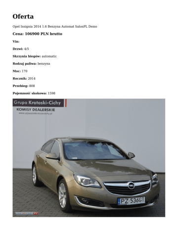 Oferta Opel Insignia 2014 1.6 Benzyna Automat SalonPL Demo Cena: 106900 PLN brutto Vin: Drzwi: 4/5 Skrzynia biegów: automatic Rodzaj paliwa: benzyna Moc: 170 Rocznik: 2014 Przebieg: 808 Pojemność skokowa: 1598 Opis: Auto-Handel-Centrum Krotoski-Cichy Autoryzowany Dealer VW Audi Seat Skoda GWARANCJA POCHODZENIA MOŻLIWOŚĆ SPRAWDZENIA POJAZDU W STACJI OBSŁUGI. MOŻLIWOŚĆ POZOSTAWIENIA SWOJEGO SAMOCHODU UŻYWANEGO W ROZLICZENIU !!!UWAGA!!! * PRZY SKORZYSTANIU Z NASZEJ FORMY FINANSOWANIA - KREDYTU LUB LEASINGU DODATKOWY RABAT * -----------------------------------------------------------------------------------------------------------------------------------------------------Uwaga: Miejsce ekspozycji pojazdu - Grupa Krotoski-Cichy Salon Pojazdów Używanych Wysogotowo, ul. Skórzewska 8 Osoba kontaktowa tel: Maximilian Gera - 609 790 272 Patryk Czerniawski - 601 750 883 Mariusz Kowalewski - 609 795 053 Możliwa jazda próbna po wcześniejszym uzgodnieniu terminu -----------------------------------------------------------------------------------------------------------------------------------------------------OPEL INSIGNIA COSMO 1.6 TURBO 170KM Cena katalogowa nowego pojazdu 154 800 zł brutto Samochód kupiony w polskim salonie OPEL Pojazd posiada gwarancję fabryczną do 10.2016 Przebieg: 808km Silnik benzynowy: 1.6 Turbo 170KM Automatyczna skrzynia biegów z łopatkami do zmiany biegów przy kierownicy Samochód posiada komplet książek serwisowych Pojazd bezwypadkowy Wyposażenie: Pakiet Kierowcy: - Czujniki parkowania przód i tył - Reflektory bi-ksenonowe AFL Pakiet Premium: - System multimedialny IntelliLink 900 Navi - Dotykowy panel sterowania w konsoli środkowej - System dźwiękowy BOSE - Wyświetlacz wskaźników kierowcy DIC 8" Pakiet Wnętrze OPC: - Ciemna podsufitka - Sportowe pedały aluminiowe - Kierownica OPC pokryta perforowaną skórą Pakiet Flotowy Cosmo: - Alarm - Elektryczna regulacja fotela kierowcy - Gniazdko elektryczne 230V w konsoli podłogowej - Rolety bocznych tylnych okien - Welurowe dywaniki Pakiet Asystent Kierowcy 2: - Kamera przednia Opel Eye - Tempomat adaptacyjny - Izotermiczna szyba przednia odbijająca promienie słoneczne - Wskaźnik odległości do pojazdu poprzedzającego - System ostrzegania przed kolizją czołową - System ostrzegania o niezamierzonej zmianie pasa ruchu - System rozpoznawania znaków drogowych - System aktywnej regulacji zasięgu świateł - System automatycznego hamowania. Pakiet Oświetlenia Wnętrza Zestaw "dobrej widoczności": - Automatyczne sterowanie światłami z czujnikiem oświetlenia - Czujnik deszczu - Światłoczułe lusterko wewnętrzne Antena dachowa typu "płetwa rekina" Przyciemniane szyby tylne boczne oraz tylna Reflektory przeciwmgielne Tapicerka skórzana, perforowana - Sportowe fotele przegnie AGR - Podgrzewane fotele przednie - Regulacja długości siedzisk foteli przednich Regulacja fotela kierowcy: wzdłużna, wysokości, pochylenia oparcia, podparcia lędźwiowego, nachylenia siedziska elektryczne Adaptacyjne zawieszenie Flex Ride Odtwarzacz CD/MP3 Kamera cofania Podgrzewana kierownica Klimatyzacja sterowana elektronicznie, dwustrefowa z automatycznym czujnikiem recyrkulacji Nawiewy powietrza w drugim rzędzie foteli Czujniki ciśnienia w kołach ABS - System zapobiegający blokowaniu się kół podczas hamowania ESP - Program kontroli stabilności jazdy Poduszki powietrzne przednie, boczne przednie oraz kurtynowe Koła aluminiowe 18" Zapasowe koło dojazdowe i inne -----------------------------------------------------------------------------------------------------------------------------------------------------Oferujemy kompleksową obsługę sprzedaży ratalnej na bardzo dogodnych warunkach - w celu bliższego zapoznania się z aktualną ofertą finansowania prosimy o kontakt : Katarzyna Świątkiewicz - 609 562 980 Oferujemy ubezpieczenia samochodowe z wiodących na rynku ubezpieczalni - możliwość zakupu pakietu ubezpieczeniowego na miejscu. Oferujemy możliwość jazdy próbnej przed zakupem oraz usługę inspekcji pojazdu. Przyjmujemy również w rozliczeniu każdy pojazd. -----------------------------------------------------------------------------------------------------------------------------------------------------Ogłoszenie ma charakter informacyjny i stanowi zaproszenie do zawarcia umowy (art. 71 Kodeksu cywilnego); nie stanowi natomiast oferty handlowej w rozumieniu art. 66 § 1 Kodeksu cywilnego. W celu sprawdzenia zgodności oferty oraz uzyskania wszelkich informacji prosimy kontaktować się z handlowcem d.s. samochodów używanych Auto możesz zobaczyć:
