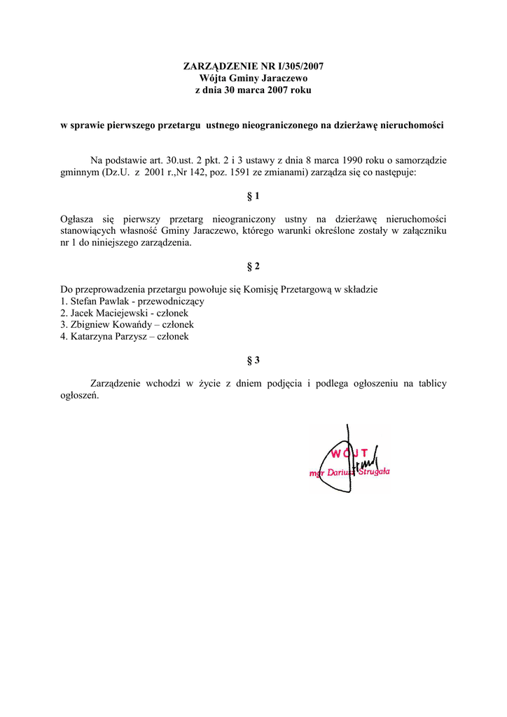 ZARZĄDZENIE NR I/305/2007 Wójta Gminy Jaraczewo z dnia 30