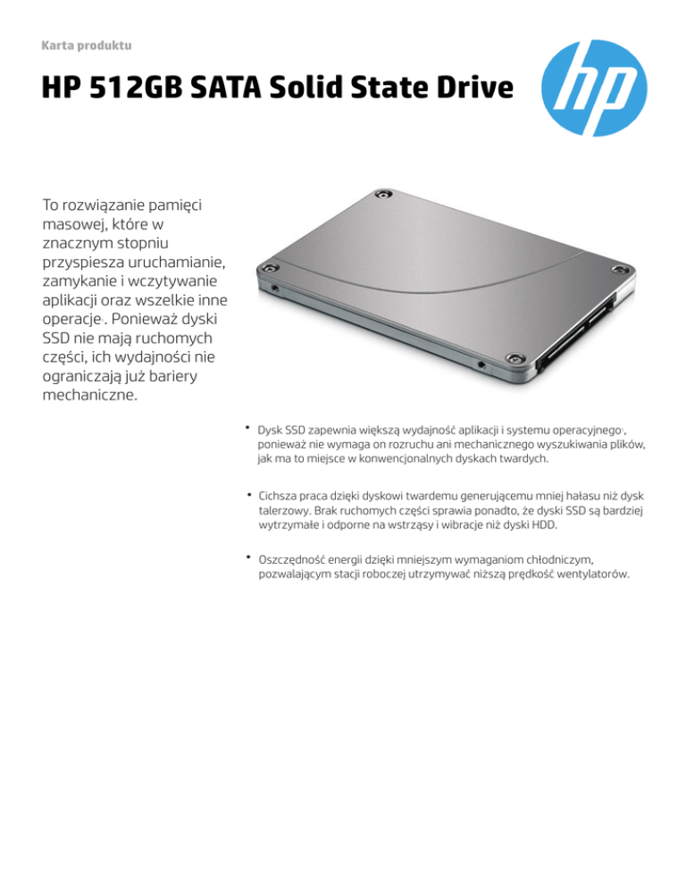 Karta produktu HP 512GB SATA Solid State Drive To rozwiązanie pamięci masowej, które w znacznym stopniu przyspiesza uruchamianie, zamykanie i wczytywanie aplikacji oraz wszelkie inne operacje . Ponieważ dyski SSD nie mają ruchomych części, ich wydajności nie ograniczają już bariery mechaniczne. 1 ● Dysk SSD zapewnia większą wydajność aplikacji i systemu operacyjnego , ponieważ nie wymaga on rozruchu ani mechanicznego wyszukiwania plików, jak ma to miejsce w konwencjonalnych dyskach twardych. ● Cichsza praca dzięki dyskowi twardemu generującemu mniej hałasu niż dysk talerzowy. Brak ruchomych części sprawia ponadto, że dyski SSD są bardziej wytrzymałe i odporne na wstrząsy i wibracje niż dyski HDD. ● Oszczędność energii dzięki mniejszym wymaganiom chłodniczym, pozwalającym stacji roboczej utrzymywać niższą prędkość wentylatorów. 1 Karta produktu HP 512GB SATA Solid State Drive Zgodność Z210SFF, Z210CMT, Z220SFF, Z220CMT, Z1 AIO, Z600, Z600RDIMM, Z400, Z400-6DIMM, Z1Gen2, Z230SFF, Z230TWR, Z800, Z420, Z620 i Z820 Wymiary Bez opakowania: 6,36 x 0,7 cm Gwarancja Karta graficzna HP SSD jest objęta roczną ograniczoną gwarancją lub pozostałą gwarancją stacji roboczej HP (maks. 3 lata, zależnie od tego, który okres jest dłuższy). Pomoc techniczna jest dostępna 24 godziny na dobę — przez telefon lub w formie forów pomocy technicznej online. Obowiązują pewne ograniczenia i wyłączenia. Informacje dodatkowe P/N: D8F30AA Kod UPC/EAN: 887758280003 Kraj pochodzenia Chiny Zawartość opakowania Napęd SSD 512 GB SATA , 4 x przewody SATA, adapter nośnika 2,5" – 3,5", dokument z instrukcją instalacji, ulotka gwarancyjna HP. Produkt może być inny niż widoczny na zdjęciach. © 2014 Hewlett-Packard Development Company L.P. Niniejsze informacje mogą ulec zmianie bez powiadomienia. Dostępność określonych funkcji zależy od modelu. Jedyne gwarancje, jakich udziela HP na produkty i usługi, są określone w oświadczeniach gwarancyjnych dostarczanych wraz z takimi produktami i usługami. Niniejszy dokument nie może być interpretowany jako dodatkowa gwarancja. HP nie ponosi odpowiedzialności za błędy techniczne lub redakcyjne oraz braki występujące w niniejszym dokumencie. 4AA5-5407PLE, 11/14