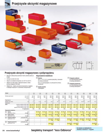 Przejrzyste skrzynki magazynowe 4 7 8 A b b+D a+C 9+B 6 8 5 7+D 4+C 3+B 2 od zł opakowanie 1 159,– Przejrzyste skrzynki magazynowe z polipropylenu Skrzynki o takiej samej szerokości można ustawiać jedną na drugiej • Uchwyty z przodu lub z tyłu • Odporne na działanie temperatur od –20 °C do +80 °C • Odporne na wiele olejów, większość kwasów i zasad (proszę zasięgnąć informacji) • Gładkie dno – idealny warunek do stosowania w regałach, w dźwigach okrężnych i na odcinkach transportowych Artykuł A B Etykiety Do 1 – 6, 8, a, b z przezroczystą folią, z obrzeżem do zmiany oznakowań. Do 7 i 9 samoprzylepne, na arkuszach do zmiany oznakowań. Szybki przednie Z pleksiglasu. C Przegrody wzdłużne Do indywidualnego podziału. Z szarego polipropylenu. D Przegrody poprzeczne Do indywidualnego podziału. Z szarego polipropylenu. 1 2 3 4 5 6 7 8 9 a b Wymiary (patrz szkic) A / a mm B / b mm C mm 96 / 58 105 / 90 45 170 / 125 105 / 100 75 250 / 175 148 / 142 130 300 / 225 230 / 224 150 350 / 275 206 / 200 150 350 / 275 206 / 200 200 400 / 325 230 / 224 150 500 / 425 230 / 224 150 500 / 425 310 / 304 200 500 / 425 310 / 304 250 600 / 525 230 / 224 150 Pojemność ok. Nośność / obc. stosu Opakowanie Kolor l kg 0,2 2/5 20 1 5 / 20 20 3,7 10 / 50 32 8 15 / 75 12 8,8 15 / 75 16 11 15 / 75 8 11 15 / 75 8 14 15 / 75 15 25 20 / 100 8 33 20 / 100 8 17 15 / 75 10 czerwony, podobny do RAL 3000 niebieski, podobny do RAL 5003 pastelowy żółty, podobny do RAL 1034 zł / opakowanie Wyposażenie dodatkowe 604 146-FN 604 147-FN 604 148-FN 604 149-FN 604 150-FN 604 152-FN 604 153-FN 604 154-FN 604 155-FN 604 169-FN 604 170-FN 604 171-FN 604 156-FN 604 157-FN 604 158-FN 604 159-FN 604 161-FN 604 162-FN 604 172-FN 604 173-FN 604 174-FN 604 175-FN 604 176-FN 604 177-FN 604 163-FN 604 164-FN 604 165-FN 604 166-FN 604 167-FN 604 168-FN 604 179-FN 604 180-FN 604 181-FN 159,– 201,– 615,– 448,– 557,– 357,– 378,– 750,– 541,– 609,– 601,– A Etykiety Opakowanie 100 szt. nr. zł / opak. – – 604 303-FN 604 304-FN 604 307-FN 604 306-FN 604 306-FN 604 308-FN 604 307-FN 604 308-FN 604 311-FN 604 307-FN B Szybki przednie Opakowanie 10 szt. nr. zł / opak. – – 604 280-FN 604 281-FN 604 284-FN 604 282-FN 941 177-FN 604 284-FN 604 284-FN 174,– 604 287FN 604 288-FN 604 284-FN C Przegrody wzdłużne Opakowanie 10 szt. na skrzynkę maks. – – – 1 1 – 1 1 1 1 1 – – – – – 604 292-FN 212,– – – 604 294-FN 604 295-FN 604 296-FN 604 297-FN 604 298-FN na skrzynkę maks. – – – – – 604 293-FN Przegrody poprzeczne Opakowanie 10 szt. – – – – – 2 – – 2 3 – – 4 604 299-FN – – – – 604 299-FN 604 299-FN – – – – 604 299-FN D 141910 Wyposażenie dodatkowe 266 www.kaiserkraft.pl nr. zł / opak. nr. zł / opak. 51,– 98,– 76,– 99,– 76,– 174,– 180,– 152,– 76,– 140,– 76,– 140,– 47,– 174,– 221,– 152,– bezpłatny transport “loco Odbiorca” 76,– 232,– 152,– 47,– 331,– 103,– 223,– 316,– 76,– 174,– 278,– Nr artykułu na niebieskim tle Dostawa w terminie 2 – 3 tygodni 152,– 141910 •