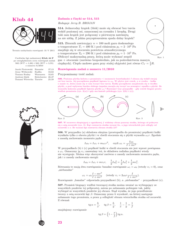 Klub 44 Zadania z f izyki nr 514, 515 Redaguje Jerzy B. BROJAN 514. Jednorodny krążek (blok) może się obracać bez tarcia wokół poziomej osi, oznaczonej na rysunku 1 kropką. Drugi taki sam krążek jest połączony z pierwszym nawiniętą na nie nitką. Z jakim przyspieszeniem spada dolny krążek? Termin nadsyłania rozwiązań: 31 V 2011 Czołówka ligi zadaniowej Klub 44 F po uwzględnieniu ocen rozwiązań zadań 502 (W T = 1,00) i 503 (W T = 3,55) z numeru 9/2010 Jacek Piotrowski Jerzy Witkowski Tomasz Rudny Andrzej Idzik Tomasz Wietecha Rzeszów Radlin Warszawa Bolesławiec Tarnów 37,13 33,82 32,65 26,47 25,39 515. Zbiornik zawierający n = 100 moli gazu doskonałego o temperaturze T1 = 400 K i pod ciśnieniem p1 = 2 · 105 Pa znajduje się w otoczeniu powietrza atmosferycznego o temperaturze T0 = 290 K i pod ciśnieniem p0 = 1 · 105 Pa. Obliczyć maksymalną pracę, którą może wykonać zespół gaz + otoczenie (zarówno bezpośrednio, jak za pośrednictwem maszyn cieplnych). Ciepło molowe gazu przy stałej objętości jest równe CV = 25 R. Rys. 1 Rozwiązania zadań z numeru 11/2010 Przypominamy treść zadań: 506. Pozioma płytka kołowa o promieniu r i momencie bezwładności I obraca się wokół swojej osi bez tarcia. Jej początkowa prędkość kątowa to ω0 . W płytce jest rowek, a w rowku – kulka o masie m, która może się w nim toczyć bez tarcia. Kulka początkowo znajdowała się w środku płytki, a pod wpływem bardzo słabego impulsu zaczęła się toczyć na zewnątrz i spadła z płytki. Ile wynosiła końcowa prędkość kątowa płytki ω1 ? Rozważyć trzy przypadki – gdy rowek biegnie prosto wzdłuż promienia (rys. 2(a)) i gdy ma kształt półokręgu (rys. 2(b) i (c)). Rys. 2 Rys. 3 507. W soczewce skupiającej o ogniskowej f widzimy obraz pozorny stożka, którego oś pokrywa się z osią soczewki (rys. 3). Kąt rozwarcia stożka wynosi 2α, a jego wierzchołek jest odległy od soczewki o x. Ile wynosi kąt rozwarcia obrazu stożka 2β? 506. W przypadku (a) składowa okrężna (prostopadła do promienia) prędkości kulki wynikała tylko z obrotu płytki i w chwili stoczenia się z płytki wynosiła ω1 r. Zgodnie z zasadą zachowania momentu pędu Iω0 Iω0 = Iω1 + mω1 r2 , czyli ω1 = . I + mr2 W przypadkach (b) i (c) prędkość kulki w chwili stoczenia nie jest wprost powiązana z ω1 . Oznaczmy ją v1 ; zauważmy też, że składowa radialna prędkości wtedy nie występuje. Można więc skorzystać zarówno z zasady zachowania momentu pędu, jak i z zasady zachowania energii: 1 1 1 2 Iω0 = Iω12 + mv12 . Iω0 = Iω1 + mv1 r, 2 2 2 Równania te mają dwa rozwiązania: banalne rozwiązanie ω1 = ω0 (wtedy v1 = 0), oraz „niebanalne” I − mr2 I ω1 = ω0 (wtedy v1 = 2ω0 r ). I + mr2 I + mr2 Rozwiązanie „banalne” odpowiada przypadkowi (b), a „niebanalne” – przypadkowi (c). 507. Promień biegnący wzdłuż tworzącej stożka można uważać za wybiegający ze wszystkich punktów tej półprostej, zatem po załamaniu pobiegnie tak, jakby wybiegał ze wszystkich punktów jej obrazu. Stąd wynika, że jego przedłużenie tworzy z osią soczewki kąt β. Oznaczmy przez h wysokość, na której następuje załamanie tego promienia, a przez y odległość obrazu wierzchołka stożka od soczewki. Z równań h 1 1 1 h tg β = , − = tg α = , x y x y f znajdujemy rozwiązanie x tg β = 1 − tg α. f 23