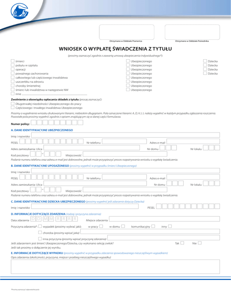 Otrzymano w Oddziale Pramerica Otrzymano w Oddziale Pośrednika WNIOSEK O WYPŁATĘ ŚWIADCZENIA Z TYTUŁU (prosimy zaznaczyć zgodnie z zawartą umową ubezpieczenia indywidualnego*): śmierci pobytu w szpitalu operacji poważnego zachorowania całkowitego lub częściowego inwalidztwa uszczerbku na zdrowiu choroby śmiertelnej śmierci lub inwalidztwa w następstwie NW inne ......................................................................................................................... Ubezpieczonego Ubezpieczonego Ubezpieczonego Ubezpieczonego Ubezpieczonego Ubezpieczonego Ubezpieczonego Ubezpieczonego Dziecka Dziecka Dziecka Dziecka Zwolnienie z obowiązku opłacania składek z tytułu (proszę zaznaczyć): Długotrwałej niezdolności Ubezpieczonego do pracy Częściowego i trwałego inwalidztwa Ubezpieczonego Prosimy o wypełnienie wniosku drukowanymi literami, niebieskim długopisem. Pola oznaczone literami: A, D, H, I, L należy wypełnić w każdym przypadku zgłaszania roszczenia. Pozostałe pola prosimy wypełnić zgodnie z opisem znajdującym się w danej części formularza. Numer polisy: A. DANE IDENTYFIKACYJNE UBEZPIECZONEGO Imię i nazwisko Nr telefonu PESEL Adres e-mail Adres zamieszkania: Ulica Nr domu Nr lokalu – Kod pocztowy Miejscowość Podanie numeru telefonu oraz adresu e-mail jest dobrowolne, jednak może przyspieszyć proces rozpatrywania wniosku o wypłatę świadczenia. B. DANE IDENTYFIKACYJNE UPOSAŻONEGO (prosimy wypełnić w przypadku śmierci Ubezpieczonego) Imię i nazwisko Nr telefonu PESEL Adres e-mail Adres zamieszkania: Ulica Nr domu Nr lokalu – Kod pocztowy Miejscowość Podanie numeru telefonu oraz adresu e-mail jest dobrowolne, jednak może przyspieszyć proces rozpatrywania wniosku o wypłatę świadczenia. C. DANE IDENTYFIKACYJNE DZIECKA UBEZPIECZONEGO (prosimy wypełnić jeśli zdarzenie dotyczy Dziecka) Imię i nazwisko PESEL D. INFORMACJE DOTYCZĄCE ZDARZENIA (rodzaj i przyczyna zdarzenia) Data zdarzenia D D M M R R R R Przyczyna zdarzenia*: wypadek (prosimy wybrać jaki): Miejsce zdarzenia w pracy w domu komunikacyjny inny choroba (prosimy wpisać jaka) inna przyczyna (prosimy wpisać przyczynę zdarzenia) Jeśli zdarzeniem jest śmierć Ubezpieczonego/Dziecka, czy wykonano sekcję zwłok? Jeśli tak prosimy o dołączenie jej wyniku. E. INFORMACJE DOTYCZĄCE WYPADKU (prosimy wypełnić w przypadku zdarzenia spowodowanego nieszczęśliwym wypadkiem) Opis zdarzenia (okoliczności, przyczyna, miejsce i przebieg nieszczęśliwego wypadku) *Prosimy zaznaczyć odpowiednie pola Tak Nie Kto i gdzie udzielił pierwszej pomocy lekarskiej bezpośrednio po wypadku Czy został sporządzony protokół powypadkowy (dotyczy wypadku w pracy)? Czy leczenie zostało zakończone? Tak Czy rehabilitacja została zakończona? Tak Okres zwolnienia lekarskiego: od Tak Nie Nie Jeśli nie, przewidywana data zakończenia Nie Jeśli nie, przewidywana data zakończenia D D MM R R R R do Czy Ubezpieczony w trakcie wypadku był pod wpływem alkoholu, środków odurzających lub innych substancji toksycznych? D D MM R R R R D D MM R R R R D D MM R R R R Tak Nie Czy w sprawie zdarzenia toczy się postępowanie wyjaśniające, prowadzone przez policję, prokuraturę, sąd? Tak Nie Jeśli tak, prosimy o podanie adresów jednostek policji/prokuratury/sądu prowadzących postępowanie, a także o dołączenie posiadanych dokumentów dotyczących sprawy oraz podanie numeru sprawy (zgodnie z wykazem dokumentów określonych w punkcie L). F. INFORMACJE DOTYCZĄCE CHOROBY (prosimy wypełnić w przypadku zdarzenia spowodowanego chorobą) D D MM R R R R Data rozpoznania stanu chorobowego będącego przyczyną zgłaszanego zdarzenia: Czy zgłaszana choroba (operacja/poważne zachorowanie) związana jest z chorobą/obrażeniami ciała rozpoznanymi i leczonymi przed zawarciem umowy ubezpieczenia? Tak Nie Prosimy o dołączenie historii choroby z przebiegu leczenia. Krótki opis przebiegu dotychczasowego leczenia: G. INFORMACJE DOTYCZĄCE LECZENIA I HOSPITALIZACJI (dotyczy nieszczęśliwego wypadku i choroby) Prosimy o wskazanie danych lekarzy prowadzących leczenie oraz danych adresowych placówek medycznych (pełne nazwy i adresy), w których Ubezpieczony/Dziecko byli badani lub leczeni w związku ze zgłaszanym zdarzeniem (nieszczęśliwym wypadkiem lub chorobą). Prosimy o wskazanie danych lekarza oraz adresu przychodni lekarza rodzinnego, w której zarejestrowany jest Ubezpieczony/Dziecko Pobyty na przepustkach (jeżeli Ubezpieczony/Dziecko podczas pobytu w szpitalu korzystali z przepustek, prosimy wpisać okresy wszystkich przepustek – należy wypełnić w przypadku pobytu w szpitalu): od od D D MM R R R R D D MM R R R R do do D D MM R R R R D D MM R R R R ; od ; od D D MM R R R R D D MM R R R R do do D D MM R R R R D D MM R R R R H. DANE DOTYCZĄCE SPOSOBU WYPŁATY ŚWIADCZENIA (prosimy o wpisanie sposobu wypłaty świadczenia) Przelew na rachunek bankowy (rekomendowana forma wypłaty świadczenia ze względu na bezpieczeństwo oraz szybki termin realizacji świadczenia) Właściciel rachunku Numer rachunku Adres zamieszkania właściciela rachunku (jeśli właściciel rachunku nie jest osobą uprawnioną do świadczenia): Ulica Kod pocztowy – Nr domu Nr lokalu Nr domu Nr lokalu Miejscowość Przekaz pocztowy na adres Imię i nazwisko adresata Adres: Ulica Kod pocztowy – Miejscowość I. OŚWIADCZENIA Oświadczam, zgodnie z moją najlepszą wiedzą i przekonaniem, że wszystkie odpowiedzi oraz informacje zawarte we wniosku są wyczerpujące, prawdziwe i prawidłowo zapisane. Wyrażam zgodę na to, aby w celach związanych z prowadzeniem działalności ubezpieczeniowej Pramerica Życie Towarzystwo Ubezpieczeń i Reasekuracji SA (Pramerica Życie TUiR SA) z siedzibą w Warszawie, al. Jana Pawła II 17 dokonywała przetwarzania moich danych osobowych. Zgadzam się, aby Pramerica Życie TUiR SA przekazała te dane za granicę firmie reasekuracyjnej, jeśli będzie to 