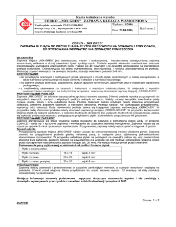 Karta techniczna wyrobu CERKO -„MIX GRES” ZAPRAWA KLEJĄCA WZMOCNIONA Wyrób spełnia wymagania PN-EN-12004:2002 dla kleju klasy C1T , Wyrób posiada ATEST PZH Krajowa Deklaracja Zgodności nr 1/12/Z/2005 Wydanie: 1/2006 Data: 28.04.2006 Ilość stron: 2 CERKO - „MIX GRES” ZAPRAWA KLEJĄCA DO PRZYKLEJANIA PŁYTEK GRESOWYCH NA ŚCIANACH I PODŁOGACH, DO STOSOWANIA WEWNĄTRZ I NA ZEWNĄTRZ POMIESZCZEŃ WŁASNOŚCI Zaprawa klejąca „MIX-GRES” jest nietoksyczną, mrozo- i wodoodporną, bezskurczową uelastycznioną zaprawą wzmocnioną włóknami o dużej zawartości żywic syntetycznych. Posiada wysokie własności mechaniczne znacznie przekraczające wymagania odpowiednich norm. Nadaje się do wewnątrz i na zewnątrz pomieszczeń na standardowe podłoża budowlane. Charakteryzuje się dobrą wytrzymałością, elastycznością i wysoką przyczepnością do podłoża. Można jej używać wewnątrz i na zewnątrz budynku, stosując warstwę o grubości 2÷8 mm. ZASTOSOWANIE • do przyklejania ściennych i podłogowych płytek gresowych i innych płytek ceramicznych o niskiej nasiąkliwości, a także kamienia syntetycznego na bazie cementu i okładzin z kamienia naturalnego; • na stabilne podłoża betonowe, gazobetonie, płytach gipsowo-kartonowych, gipsowych oraz w systemach ogrzewania podłogowego; • z możliwością stosowania na tarasach i balkonach o niedużym nasłonecznieniu. W miejscach o wysokim nasłonecznieniu narażonych na dużą różnicę temperatur zaleca się stosowanie zaprawy klejącej „CERKO-FLEX”; PRZYGOTOWANIE PODŁOŻA Zaprawa „MIX-GRES” (w zakresie dopuszczalnej grubości warstwy zaprawy 2-8mm) posiada wysoką przyczepność do wszystkich zwartych, suchych i wilgotnych podłoży wolnych od kurzu. Należy usunąć wszystkie ewentualne pasty myjące, mydła, smary i inne substancje tłuste. Powłoki malarskie dobrze przyległe należy starannie przygotować (odtłuścić, zmatowić papierem ściernym, a następnie odkurzyć). Podłoża typowe, nie wymagające przygotowania, wystarczy tylko odkurzyć. Duże nierówności podłoża zaleca się korygować zaprawą wyrównującą „CERKO-ZW”. W przypadku dużej chłonności podłoża należy stosować preparat gruntujący „CERKO-GRUNT”. W przypadku konieczności klejenia płytek na słabych podłożach, o nośności trudnej do określenia (np. pylących, trudnych do oczyszczenia), zaleca się wykonać próbę przyczepności, polegającą na przyklejeniu płytki i sprawdzeniu połączenia po 48 godzinach. PRZYGOTOWANIE ZAPRAWY Zaprawę przygotowuje się przez wsypanie suchej mieszanki do naczynia z odmierzoną ilością wody (w proporcji 0,26÷0,27 l wody na 1 kg suchej zaprawy) i wymieszanie do uzyskania jednolitej konsystencji. Zaprawa nadaje się do użycia po upływie 5 minut i ponownym wymieszaniu. Przygotowaną zaprawę należy wykorzystać w ciągu ok. 4 godzin. Sposób użycia: Przygotowaną zaprawę klejącą „MIX-GRES” należy używać do cienkowarstwowej metody układania płytek. Zaprawę nanosić na przygotowane podłoże gładką metalową pacą, a następnie pacą ząbkowaną jednokierunkowo równomiernie rozprowadzić. W przypadku układania płytek na podłogach na zewnątrz zaleca się, aby powierzchnia sklejenia była całkowita. Zaprawę nanosić na powierzchnię nie większą niż jest możliwe jednoczesne ułożenie płytek przed wystąpieniem naskórkowania zaprawy klejącej (ok. 20 min). Nie należy moczyć płytek przed klejeniem! Zastosowanie pacy ząbkowanej w zależności od profilu i formatu płytek: Płytki o niskim profilu: Płytki rozmiaru 15 x 15 ząbki 4 mm Płytki rozmiaru 20 x 20 ząbki 6 mm Płytki rozmiaru powyżej 20 x 20 ząbki 8 mm Przechowywanie: Zaprawę należy przewozić i przechowywać w szczelnie zamkniętych workach, w suchych warunkach (najlepiej na paletach). Chronić przed wilgocią. Okres przydatności do użycia zaprawy wynosi 12 miesięcy od daty produkcji umieszczonej na opakowaniu. Niniejsze informacje stanowią podstawowe wytyczne, dotyczące stosowania wyrobu i nie zwalniają z obowiązku wykonywania prac zgodnie z zasadami sztuki budowlanej i przepisami BHP. Strona 1 z 2 ZUŻYCIE Karta techniczna wyrobu CERKO -„MIX GRES” ZAPRAWA KLEJĄCA WZMOCNIONA Wyrób spełnia wymagania PN-EN-12004:2002 dla kleju klasy C1T , Wyrób posiada ATEST PZH Krajowa Deklaracja Zgodności nr 1/12/Z/2005 Wydanie: 1/2006 Data: 28.04.2006 Ilość stron: 2 Średnio zużywa się 1,5 kg zaprawy na 1 m², na każdy 1 mm grubości warstwy sklejenia. W praktyce zużycie zależne jest od stopnia równości podłoża i rodzaju zastosowanych płytek. Przybliżone zużycie zaprawy dla wybranych rodzajów płytek: Przybliżone Wielkość Grubość Rodzaj płytki zużycie zębów pacy warstwy sklejenia (w kg/m²) Płytki małego formatu (15x15cm) 4,0 mm ok. 3,0 ÷ 4,0 mm 3,8 ÷ 6,5 Płytki małego i średniego formatu (20x20cm) 6,0 mm ok. 4,0 ÷ 6,0 mm 4,2 ÷ 8,0 Płytki dużego formatu (pow. 25x25cm) 8,0 mm ok. 5,0 ÷ 8,0 mm 5,25 ÷ 9,0 NARZĘDZIA Wolnoobrotowa wiertarka z mieszadłem, gładka i ząbkowana paca stalowa. Narzędzia należy czyścić czystą wodą, bezpośrednio po użyciu. Trudne do usunięcia resztki związanej zaprawy zmywa się środkiem CERKO-REX. OPAKOWANIA Worki papierowe 25 kg. 1 Paleta = 1050 kg (42 szt x 25 kg). PRZECHOWYWANIE I TRANSPORT Zaprawę należy przewozić i przechowywać w szczelnie zamkniętych workach, w suchych warunkach (najlepiej na paletach). Chronić przed wilgocią. Okres przechowywania zaprawy w warunkach zgodnych z podanymi wymaganiami wynosi do 12 miesięcy od daty produkcji umieszczonej na opakowaniu. UWAGA! Produkt drażniący zawierający cement. Należy stosować odpowiednie środki ochrony oczu, dróg oddechowych i skóry. Chronić przed dziećmi. Nie wdychać pyłu. Może powodować uczulenie w kontakcie ze skórą. Produkt działa drażniąco na oczy, drogi oddechowe i skórę. Zanieczyszczone oczy przemyć n