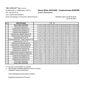 "BK GROUP" Sp. z o.o. Nowa Wieś AUCHAN - Częstochowa RAKÓW przez Wrzosowa 93-490 Łódź, ul. Pabianicka 119/131 NIP 729-267-04-25 Linia autobusowa bezpłatna Rozkład ważny od 04.03.2016 do 03.03.2021 Osoba zarządzająca Transportem: Michał Parzęcki Lp 1 2 3 4 5 6 7 8 9 10 11 12 13 14 15 16 17 18 19 20 21 22 PRZYSTANKI Nowa Wieś AUCHAN Wrzosowa Katowicka Częstochowa Fabryczna 01 Częstochowa Kolejowa 01 Częstochowa Bugajska 01 Częstochowa Stadion Raków 02 Częstochowa Stary Raków 02 Częstochowa Prusa 02 Częstochowa Plac Orląt Lwowskich 03 Częstochowa P.Z.U. 01 Częstochowa Kasztanowa 01 Częstochowa Orkana Szkoła 02 Częstochowa Wrzosowiak 02 Częstochowa Sportowa 02 Częstochowa Jesienna 01 Częstochowa Jesienna Szkoła 02 Częstochowa Bohaterów Katynia 01 Częstochowa Bugajska 03 Częstochowa Kolejowa 02 Częstochowa Fabryczna 02 Wrzosowa Katowicka Nowa Wieś AUCHAN 1-7, X 9:30 10:40 13:00 13:45 14:30 15:15 16:00 16:45 17:30 19:00 ## 9:34 10:44 13:04 13:49 14:34 15:19 16:04 16:49 17:34 19:04 ## 9:37 10:47 13:07 13:52 14:37 15:22 16:07 16:52 17:37 19:07 ## 9:39 10:49 13:09 13:54 14:39 15:24 16:09 16:54 17:39 19:09 ## 9:42 10:52 13:12 13:57 14:42 15:27 16:12 16:57 17:42 19:12 ## 9:44 10:54 13:14 13:59 14:44 15:29 16:14 16:59 17:44 19:14 ## 9:46 10:56 13:16 14:01 14:46 15:31 16:16 17:01 17:46 19:16 ## 9:47 10:57 13:17 14:02 14:47 15:32 16:17 17:02 17:47 19:17 ## 8:55 8:56 8:59 9:00 9:02 9:03 9:04 9:48 10:58 13:18 14:03 14:48 15:33 16:18 17:03 17:48 19:18 ## 9:50 11:00 13:20 14:05 14:50 15:35 16:20 17:05 17:50 19:20 ## 9:51 11:01 13:21 14:06 14:51 15:36 16:21 17:06 17:51 19:21 ## 9:54 11:04 13:24 14:09 14:54 15:39 16:24 17:09 17:54 19:24 ## 9:55 11:05 13:25 14:10 14:55 15:40 16:25 17:10 17:55 19:25 ## 9:57 11:07 13:27 14:12 14:57 15:42 16:27 17:12 17:57 19:27 ## 9:58 11:08 13:28 14:13 14:58 15:43 16:28 17:13 17:58 19:28 ## 9:59 11:09 13:29 14:14 14:59 15:44 16:29 17:14 17:59 19:29 9:05 10:00 11:10 13:30 14:15 15:00 15:45 16:30 17:15 18:00 19:30 ## 9:07 10:02 11:12 13:32 14:17 15:02 15:47 16:32 17:17 18:02 19:32 ## 9:09 10:04 11:14 13:34 14:19 15:04 15:49 16:34 17:19 18:04 19:34 ## 9:10 10:05 11:15 13:35 14:20 15:05 15:50 16:35 17:20 18:05 19:35 ## 9:12 10:07 11:17 13:37 14:22 15:07 15:52 16:37 17:22 18:07 19:37 ## 9:15 10:10 11:20 13:40 14:25 15:10 15:55 16:40 17:25 18:10 19:40 ## 1-7 Kursuje od poniedziałku do niedzieli X Nie kursuje w święta ustawowo wolne od pracy . Odległość między przystankami Linia obsługiwana przez jeden autobus Prędkość techniczna 37,0 km/h