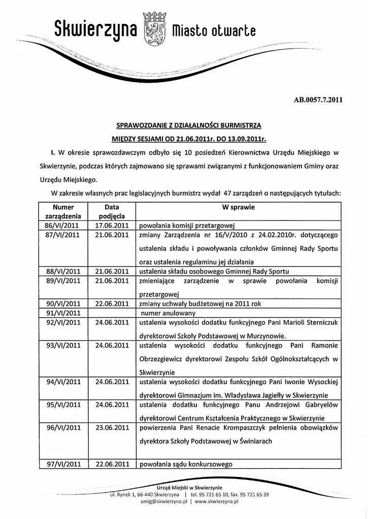 Skwierzyna miasto otwarte AB.0057.7.2011 SPRAWOZDANIE Z DZIAŁALNOŚCI BURMISTRZA MIEDZY SESJAMI OD 21.0G.20llr. DO 13.09.2011r. I. W okresie sprawozdawczym odbyło się 10 posiedzeń Kierownictwa Urzędu Miejskiego w Skwierzynie, podczas których zajmowano się sprawami związanymi z funkcjonowaniem Gminy oraz Urzędu Miejskiego. W zakresie własnych prac legislacyjnych burmistrz wydał 47 zarządzeń o następujących tytułach: Numer Data zarządzenia podjęcia 8G/V1/2011 87/V1/2011 17.0G.2011 21.0G.2011 W sprawie powołania komisji przetargowej zmiany Zarządzenia nr 1G/V/2010 z 24.02.2010r. dotyczącego ustalenia składu i powoływania członków Gminnej Rady Sportu oraz ustalenia regulaminu jej działania 88/V1/2011 89/V1/2011 21.0G.2011 21.0G.2011 ustalenia składu osobowego Gminnej Rady Sportu 90/V1/2011 91/V1/2011 92/V1/2011 22.0G.2011 zmiany uchwały budżetowej na 2011 rok zarządzenie zmieniające w sprawie powołania komisji przetargowej numer anulowany 24.0G.2011 ustalenia wysokości dodatku funkcyjnego Pani Marioli Sterniczuk dyrektorowi Szkoły Podstawowej w Murzynowie. 93/V1/2011 24.0G.2011 wysokości ustalenia dodatku funkcyjnego Pani Ramonie Obrzezgiewicz dyrektorowi Zespołu Szkół Ogólnokształcących w Skwierzynie 94/V1/2011 24.0G.2011 95/V1/2011 24.0G.2011 ustalenia wysokości dodatku funkcyjnego Pani Iwonie Wysockiej dyrektorowi Gimnazjum im. Władysława Jagiełły wSkwierzynie ustalenia dodatku funkcyjnego Panu Andrzejowi Gabryelów dyrektorowi Centrum Kształcenia Praktycznego wSkwierzynie 9G/V1/2011 23.0G.2011 powierzenia Pani Renacie Krompaszczyk pełnienia obowiązków dyrektora Szkoły Podstawowej w Świniarach 97/V1/2011 22.0G.2011 ----~ ul. Rynek powołania sądu konkursowego Urząd Miejski wSkwierzynie l, 66-440 Skwierzyna I tel. 95 721 65 lO, fax. 95 721 65 39 [email protected] I www.skwierzyna.pl Skwierzyna miasto otwarte 97/V1/2011 22.06.2011 powołania sądu 97A/V1/2011 22.06.2011 powołania konkursowego komisji przetargowej w przetargu nieograniczonym na Budowę boiska sportowego z nawierzchnią syntetyczną 98/V1/2011 14.07.2011 wraz z ogrodzeniem w Trzebiszewie dz. nr 116 podania do publicznej wiadomości wykazu nieruchomości przeznaczonych do sprzedaży w trybie bezprzetargowym 99/V1/2011 100/V1/2011 14.07.2011 sprzedaży 14.07.2011 udzielenia bonifikaty od ceny sprzedaży podania do publicznej wiadomości wykazu nieruchomości lokalu przeznaczonych bezprzetargowym mieszkalnego do zbycia w na rzecz trybie oraz przetargowym wydzierżawienia oraz najemcy w i trybie przetargowym 101/V1/2011 14.07.2011 sprzedaży nieruchomości w trybie bezprzetargowym 102/V1/2011 14.07.2011 sprzedaży nieruchomości w trybie bezprzetargowym 103/V1/2011 14.07.2011 zmieniające zarządzenie w sprawie sprzedaży nieruchomości w trybie bezprzetargowym 104/V1/2011 14.07.2011 zmieniające zarządzenie w sprawie sprzedaży nieruchomości w trybie bezprzetargowym 10S/V1/2011 22.07.2011 powołania składu określenie 106/V1/2011 22.07.2011 Gminnego Zespołu Zarządzania Kryzysowego/ jego organizacji/ siedziby oraz trybu pracy dystrybucji preparatów jodowych w formie tabletek jodowych w ramach działań interwencyjnych w przypadku zdarzenia radiacyjnego na terenie Gminy Skwierzyna 107/V1/2011 22.07.2011 powołania komisji przetargowej w przetargu nieograniczonym na Remont OSP Świniary 108/V1/2011 22.07.2011 powołania Urząd komisji przetargowej Miejski wSkwierzynie - . - - - - - - ul. Rynek l, 66-440 Skwierzyna I tel. 95 721 65 lO, fax. 95 72165 39 [email protected] I www.skwierzyna.pl Skwierzyna 110/V1/2011 12.08.2011 ~ miasto otwarte powołania komisji przetargowej w przetargu nieograniczonym na Rozbudowę budynku OSP Świniary 111/V1/2011 16.08.2011 powołania 112/V1/2011 17.08.2011 zmieniające zarządzenie komisji przetargowej dzierżawnego w sprawie ustalenia wysokości czynszu za umieszczenie reklam na budynkach i gruntach komunalnych na potrzeby komitetów wyborczych do rad gmin, 113/V1/2011 18.08.2011 rad powiatów i sejmików wojewódzkich ustanowienia Urzędnika Wyborczego w Gminie Skwierzyna oraz udzielenia upoważnienia do wykonywania zadań związanych z organizacją 114/V1/2011 22.08.2011 i przeprowadzaniem wyborów i referendów przyznania dodatku motywacyjnego p.o. dyrektora Szkoły Podstawowej w Świniarach 115/V1/2011 22.08.2002 wysokości ustalenia dodatku funkcyjnego Pani Renacie Krompaszczyk p.o. dyrektora Szkoły Podstawowej w Świniarach 116/V1/2011 22.08.2011 powołania "Remont pomieszczeń związane 117/V1/2011 118/V1/2011 25.08.2011 25.08.2011 komisji do odbioru technicznego robót pod z realizacją w budynku 25.08.2011 opieki nad dziećmi w wieku do lat 3 Maluch" podania do publicznej wiadomości wykazu przeznaczonych do wydzierżawienia wyznaczenia osoby zastępującej powołania likwidacji 120/V1/2011 29.08.2011 Edukacyjnego na cele resortowego programu rozwoju instytucji Trzebiszewie podczas jego 119/V1/2011 Zespołu komisji Szkoły powołania Urząd nazwą nieruchomości w trybie bezprzetargowym dyrektora Szkoły Podstawowej w nieobecności zdawczo-odbiorczej do Podstawowej w Trzebiszewie komisji ds. przekazania nieruchomości Miejski wSkwierzynie - - - - - - ul. Rynek l, 66-440 Skwierzyna I tel. 95 721 65 lO, fax. 95 721 65 39 [email protected] I www.skwierzyna.pl przeprowadzenia Skwierzyna 121/V1/2011 30.08.2011 ił' miasto otwarte powierzenia stanowiska Kierownika Klubu Dziecięcego w Skwierzynie 122/V1/2011 29.08.2011 powołania komisji zdawczo-odbiorczej do przeprowadzenia likwidacji Szkoły Podstawowej w Świniarach i przekazania mienia szkoły 123/V1/2011 29.08.2011 powołania komisji zdawczo-odbiorczej do przeprowadzenia likwidacji Szkoły Podstawowej w Świniarach 124/V1/2011 1.09.2011 powierzenia Panu Andrzejowi Gabryelów stanowiska dyrektora Centrum 125/V1/2011 1.09.2011 Kształcenia Praktycznego wSkwierzynie powierzenia Pani Ramonie Obrzezgiewicz obowiązków dyrektora Zespołu Szkół Ogólnokształcących wSkwierzynie 126/