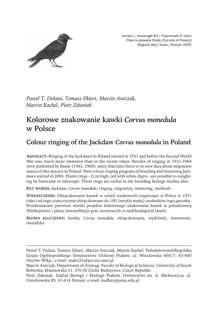Jerzak L., Kavanagh B.P., Tryjanowski P. (red.) Ptaki krukowate Polski [Corvids of Poland] Bogucki Wyd. Nauk., Poznań 2005 Paweł T. Dolata, Tomasz Ekiert, Marcin Antczak, Marcin Rachel, Piotr Zduniak Kolorowe znakowanie kawki Corvus monedula w Polsce Colour ringing of the Jackdaw Corvus monedula in Poland ABSTRACT: Ringing of the Jackdaws in Poland started in 1931 and before the Second World War was much more intensive than in the recent times. Results of ringing in 1931-1964 were published by Busse (1963, 1969); since that time there is no new data about migration status of this species in Poland. New colour ringing program of breeding and wintering Jackdaws started in 2004. Plastic rings - 2 cm high, red with white digits - are possible to resighting by binocular or telescope. These rings are useful in the breeding biology studies also. KEY WORDS: Jackdaw, Corvus monedula, ringing, migration, wintering, methods STRESZCZENIE: Obrączkowanie kawek w celach naukowych rozpoczęto w Polsce w 1931 roku i od tego czasu rocznie obrączkowano do 100 (zwykle mniej) osobników tego gatunku. Przedstawiono pierwsze wyniki projektu kolorowego znakowania kawek w południowej Wielkopolsce i plany intensyfikacji prac terenowych w nadchodzących latach. SŁOWA KLUCZOWE: kawka, Corvus monedula, obrączkowanie, wędrówki, zimowanie, metodyka Paweł T. Dolata, Tomasz Ekiert, Marcin Antczak, Marcin Rachel, Południowowielkopolska Grupa Ogólnopolskiego Towarzystwa Ochrony Ptaków, ul. Wrocławska 60A/7, 63-400 Ostrów Wlkp., e-mail: [email protected] Marcin Antczak, Department of Zoology, Faculty of Biological Sciences, University of South Bohemia, Branisovská 31, 370 05 eské Budějovice, Czech Republic Piotr Zduniak, Zakład Biologii i Ekologii Ptaków, Uniwersytet im. A. Mickiewicza, ul. Umultowska 89, 61-614 Poznań, e-mail: [email protected] 314 Paweł T. Dolata, Tomasz Ekiert, Marcin Antczak, Marcin Rachel, Piotr Zduniak Historia obrączkowania kawek w Polsce Obrączkowanie kawek w celach naukowych rozpoczęto w Polsce w 1931 r., pierwszym roku funkcjonowania krajowej centrali obrączkowania ptaków, kiedy to oznakowano 3 os. tego gatunku (Domaniewski 1933). W krótkim czasie liczba znakowanych osiągnęła znaczne rozmiary. W ostatnich latach przed II wojną światową wyniosła 303 os. w 1938 roku i 392 os. w 1939 roku (Rydzewski 1949a, b). Po wojennej przerwie obrączkowanie kawek wznowiono w 1947 roku (Szczepski 1951). Nie osiągnięto jednak nigdy ilości znakowanych ptaków sprzed wojny. W latach 1955–1962 znakowano rocznie od 51 do 151 kawek, a łączna liczba oznakowanych ptaków w latach 1931–1962 wyniosła 2629 os. (Szczepski 1970, 1976). Dotychczasowe podsumowania Początek lat 60. ubiegłego wieku zakończył pewien okres w obrączkowaniu ptaków, a szczególnie ptaków krukowatych w Polsce. Rok 1962 był ostatnim, za który opublikowano, z opóźnieniem 14 lat, pełen raport z wyników obrączkowania (Szczepski 1976). Zwiększająca się liczba obrączkowanych ptaków i rozpoczęcie w 1960 roku masowej akcji obrączkowania lotnych ptaków chwytanych w sieci ornitologiczne w punktach przelotu na wybrzeżu Bałtyku – prowadzonej do dziś Akcji Bałtyckiej – przynoszą tak duże ilości wiadomości powrotnych, że paradoksalnie utrudniają opracowywanie danych o wszystkich znakowanych gatunkach, a zamieszczanie każdej informacji o ponownym stwierdzeniu (w tym wiadomości miejscowych) stało się niecelowe i praktycznie niemożliwe. W tym okresie materiał z obrączkowania ptaków krukowatych, zebrany w latach 1931–1964, został opracowany, kolejno w skali Polski i całej Europy, przez Bussego (1963, 1969). Określono na jego podstawie m.in., że około 70% polskiej populacji kawki wędruje a ptaki te zimują od Węgier, Czech i Austrii, przez Niemcy i Francję, aż do wybrzeży Atlantyku i podnóży Pirenejów. Pozostałe ok. 30% pozostaje na zimę w kraju, nie oddalając się od miejsca urodzenia (Busse 1963). Poza wędrówkami i miejscami zimowania materiał z obrączkowania kawek wykorzystano też do oceny śmiertelności w poszczególnych grupach wiekowych i w skali roku, średniej długości życia, przywiązania do miejsc wyklucia w kolejnych sezonach (Busse 1963, 1969). Stan obecny Obecnie kawki, ze względu na trudną dostępność ich miejsc lęgowych i małe zainteresowanie tym gatunkiem, znakowane są w Polsce bardzo nielicznie. W 2000 roku oznakowano w Polsce tylko 34 kawki: 1 pisklę i 33 lotne, w 2001 roku 36 os.: 1 pisklę i 35 lotnych, w 2002 roku 34 os.: 26 piskląt i 8 lotnych (dane Zakładu Ornitologii PAN w Gdańsku, www.stornit.gda.pl), a w 2003 roku 60 os.: 28 piskląt i 32 lotne (Mokwa et al. 2004). Było to mniej niż w latach 1931–1939 i 1945–1960, gdy obrączkowano ich średnio ok. 100 rocznie (Busse 1963).W związku z małą ilością obrączkowanych ptaków do Zakładu Ornitologii PAN docierają tylko pojedyncze wiadomości powrotne, nie pozwalające na wyciąganie szerszych wniosków. Kolorowe znakowanie kawki Corvus monedula w Polsce 315 Potrzeba intensyfikacji znakowania Na informacjach Bussego (1963, 1969) nadal opierają się wyniki przedstawiane w najnowszych polskich monografiach ornitologicznych (Kuźniak 2000, Walasz 2000, Tomiałojć & Stawarczyk 2003). Skrócenie wędrówek polskich populacji wielu gatunków ptaków stawia jednak aktualne pytanie, czy i w przypadku kawki większa część naszej populacji nie jest już obecnie osiadła. Zagadnienie to można rozwiązać tylko poprzez intensyfikację znakowania tych ptaków i otrzymywania wiadomości powrotnych. W 2004 roku zainicjowano w Wielkopolsce program badań biologii lęgowej kawek (koordynator P. Zduniak), który ma dostarczyć danych dotyczących: terminów przystępowania do lęgów, wielkości zniesień, sukcesu lęgowego, wielkości i przyczyn strat gniazdowych, dyspersji polęgowej ptaków, terminów i szlaków wędrówek oraz miejsc zimowania. Kolorowe obrączki i ich od