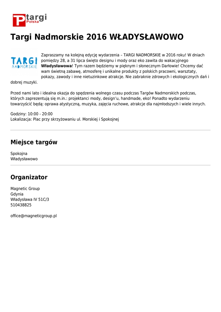 Targi Nadmorskie 2016 WŁADYSŁAWOWO Zapraszamy na kolejną edycję wydarzenia – TARGI NADMORSKIE w 2016 roku! W dniach pomiędzy 28, a 31 lipca święto designu i mody oraz eko zawita do wakacyjnego Władysławowa! Tym razem będziemy w pięknym i słonecznym Darłowie! Chcemy dać wam świetną zabawę, atmosferę i unikalne produkty z polskich pracowni, warsztaty, pokazy, zawody i inne nietuzinkowe atrakcje. Nie zabraknie zdrowych i ekologicznych dań i dobrej muzyki. Przed nami lato i idealna okazja do spędzenia wolnego czasu podczas Targów Nadmorskich podczas, których zaprezentują się m.in.: projektanci mody, design’u, handmade, eko! Ponadto wydarzeniu towarzyścić będą: oprawa atystyczną, muzyka, zajęcia ruchowe, atrakcje dla najmłodszych i wiele innych. Godziny: 10:00 - 20:00 Lokalizacja: Plac przy skrzyżowaniu ul. Morskiej i Spokojnej Miejsce targów Spokojna Władysławowo Organizator Magnetic Group Gdynia Władysława IV 51C/3 510438825 [email protected]