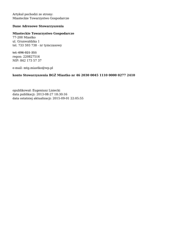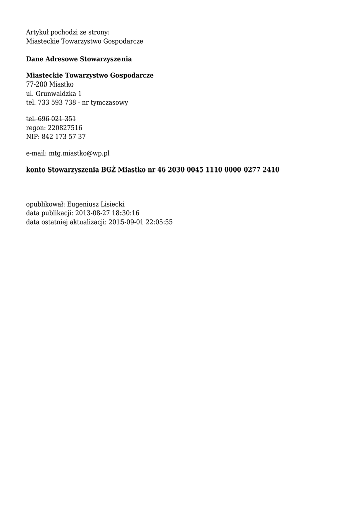 Artykuł pochodzi ze strony: Miasteckie Towarzystwo Gospodarcze Dane Adresowe Stowarzyszenia Miasteckie Towarzystwo Gospodarcze 77-200 Miastko ul. Grunwaldzka 1 tel. 733 593 738 - nr tymczasowy tel. 696 021 351 regon: 220827516 NIP: 842 173 57 37 e-mail: [email protected] konto Stowarzyszenia BGŻ Miastko nr 46 2030 0045 1110 0000 0277 2410 opublikował: Eugeniusz Lisiecki data publikacji: 2013-08-27 18:30:16 data ostatniej aktualizacji: 2015-09-01 22:05:55
