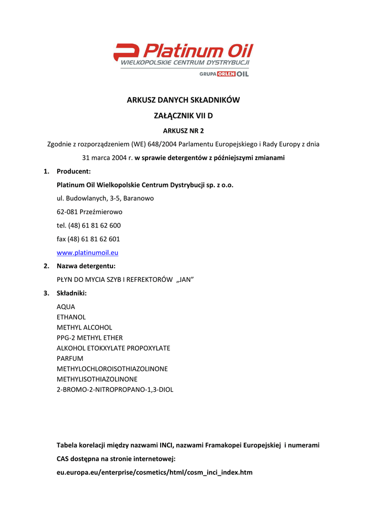 ARKUSZ DANYCH SKŁADNIKÓW ZAŁĄCZNIK VII D ARKUSZ NR 2 Zgodnie z rozporządzeniem (WE) 648/2004 Parlamentu Europejskiego i Rady Europy z dnia 31 marca 2004 r. w sprawie detergentów z późniejszymi zmianami 1. Producent: Platinum Oil Wielkopolskie Centrum Dystrybucji sp. z o.o. ul. Budowlanych, 3-5, Baranowo 62-081 Przeźmierowo tel. (48) 61 81 62 600 fax (48) 61 81 62 601 www.platinumoil.eu 2. Nazwa detergentu: PŁYN DO MYCIA SZYB I REFREKTORÓW „JAN” 3. Składniki: AQUA ETHANOL METHYL ALCOHOL PPG-2 METHYL ETHER ALKOHOL ETOKXYLATE PROPOXYLATE PARFUM METHYLOCHLOROISOTHIAZOLINONE METHYLISOTHIAZOLINONE 2-BROMO-2-NITROPROPANO-1,3-DIOL Tabela korelacji między nazwami INCI, nazwami Framakopei Europejskiej i numerami CAS dostępna na stronie internetowej: eu.europa.eu/enterprise/cosmetics/html/cosm_inci_index.htm