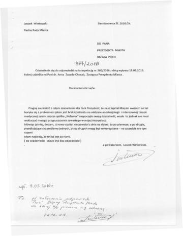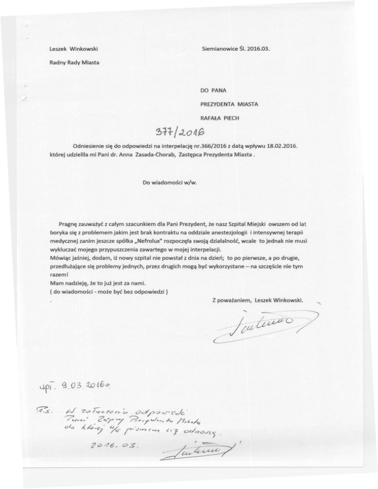 Odniesienie się do odpowiedzi na interpelację której udzieliła mi Pani dr. Anna Zasada-Chorab, nr.366/2016 z datą wpływu 18.02.2016. Zastępca Prezydenta Miasta. Pragnę zauważyć z całym szacunkiem dla Pani Prezydent, że nasz Szpital Miejski boryka się z problemem jakim jest brak kontraktu medycznej zanim jeszcze spółka "Nefrolux" na oddziale anestezjologii owszem od lat i intensywnej terapii rozpoczęła swoją działalność, wcale to jednak nie musi wykluczać mojego przypuszczenia zawartego w mojej interpelacji. Mówiąc jaśniej, dodam, iż nowy szpital nie powstał z dnia na dzień; to po pierwsze, a po drugie, przedłużające się problemy jednych, przez drugich mogą być wykorzystane razem! Mam nadzieję, że to już jest za nami. ( do wiadomości - może być bez odpowiedzi) - na szczęście nie tym _SIE_L..»._MIAN_......,_.•. * _~_o _~_JL_c_i_· ś_'~_Ą_s_~_iE_ _.1.JL_.•.•_.•..•..•. _JL_u_.•..I._JL Szanowny Pan Leszek Wmkowski Radny Rady Miasta Siemianowice Śląskie ODPOWIEDŹ NA INTERPELACJĘ Nr 366/2016 W odpowiedzi na interpelację uprzejmie informuję, iż nie słusmym jest stwierdzenie jakoby powstanie w mieście nowego szpitala pn~ "Nefrolux" miało ujemny wpływ na wysokość dla Szpitala Miejskiego w Siemianowicach Śląskich. Obecnie podpisywane kontraktów na tym samym poziomie i zakresie świadczeń medycznych udzielał w latach ubiegłych, kontIaktu są aneksy do jakie Szpital Miejski zanim spółka "Nefrolux" rozpoczęła swoją działalność. Odrębnym i istotnym problemem jest brak kontraktu na oddziale anes.t~olQgii i intensywnej terapii . medycznej, z którym to Szpital boryka się od wielu lat, podejmując wszelkich starań w celu jego przywrócenia. zarówno w NFZ , jsk również na szczeblu Ministerstwa Zdrowia.. Nal.eży jednak podkreślić, że sytuacja ta nie ma żadnego związku z nowo powstałym podmiotem, a wynika z jedynie ~ niespełnia.nia przez Szpital, niektórych wymogów wynikających z odrębnych przepisów, a niezbędnych do uzyskania kontraktu, co skutkowało zerwaniem ówczesnym Dyrektorem SzPitala Miejskiego Bolesławem kontraktu zawartego pomiędzy Oębarskim i Narodowym Fw.duszem Zdrowia. URZĄD MIASTA ul. Jana Pawła II 10. 41-100 Siemianowice Śląskie e-mail:[email protected]. www.siemianowice.pl