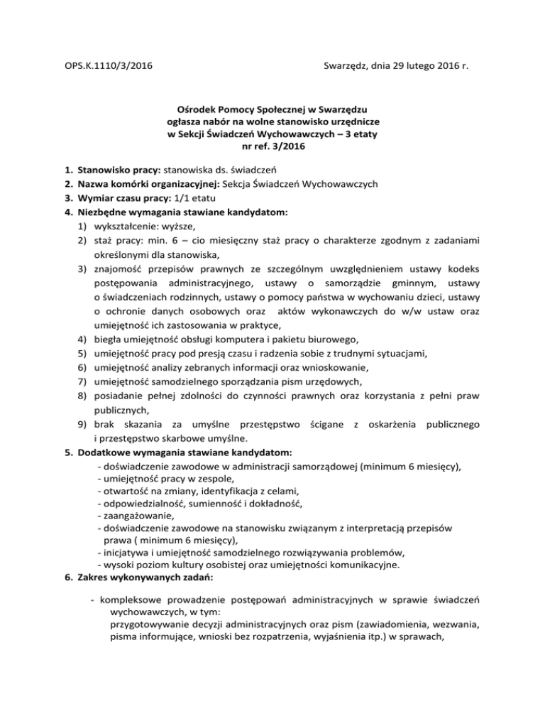 OPS.K.1110/3/2016 Swarzędz, dnia 29 lutego 2016 r. Ośrodek Pomocy Społecznej w Swarzędzu ogłasza nabór na wolne stanowisko urzędnicze w Sekcji Świadczeń Wychowawczych – 3 etaty nr ref. 3/2016 1. 2. 3. 4. Stanowisko pracy: stanowiska ds. świadczeń Nazwa komórki organizacyjnej: Sekcja Świadczeń Wychowawczych Wymiar czasu pracy: 1/1 etatu Niezbędne wymagania stawiane kandydatom: 1) wykształcenie: wyższe, 2) staż pracy: min. 6 – cio miesięczny staż pracy o charakterze zgodnym z zadaniami określonymi dla stanowiska, 3) znajomość przepisów prawnych ze szczególnym uwzględnieniem ustawy kodeks postępowania administracyjnego, ustawy o samorządzie gminnym, ustawy o świadczeniach rodzinnych, ustawy o pomocy państwa w wychowaniu dzieci, ustawy o ochronie danych osobowych oraz aktów wykonawczych do w/w ustaw oraz umiejętność ich zastosowania w praktyce, 4) biegła umiejętność obsługi komputera i pakietu biurowego, 5) umiejętność pracy pod presją czasu i radzenia sobie z trudnymi sytuacjami, 6) umiejętność analizy zebranych informacji oraz wnioskowanie, 7) umiejętność samodzielnego sporządzania pism urzędowych, 8) posiadanie pełnej zdolności do czynności prawnych oraz korzystania z pełni praw publicznych, 9) brak skazania za umyślne przestępstwo ścigane z oskarżenia publicznego i przestępstwo skarbowe umyślne. 5. Dodatkowe wymagania stawiane kandydatom: - doświadczenie zawodowe w administracji samorządowej (minimum 6 miesięcy), - umiejętność pracy w zespole, - otwartość na zmiany, identyfikacja z celami, - odpowiedzialność, sumienność i dokładność, - zaangażowanie, - doświadczenie zawodowe na stanowisku związanym z interpretacją przepisów prawa ( minimum 6 miesięcy), - inicjatywa i umiejętność samodzielnego rozwiązywania problemów, - wysoki poziom kultury osobistej oraz umiejętności komunikacyjne. 6. Zakres wykonywanych zadań: - kompleksowe prowadzenie postępowań administracyjnych w sprawie świadczeń wychowawczych, w tym: przygotowywanie decyzji administracyjnych oraz pism (zawiadomienia, wezwania, pisma informujące, wnioski bez rozpatrzenia, wyjaśnienia itp.) w sprawach, udział w postępowaniu odwoławczym, analiza składanych odwołań, przygotowywanie akt sprawy do Samorządowego Kolegium Odwoławczego (m.in.: kopiowanie akt spraw, potwierdzanie kserokopii za zgodność z oryginałem, przygotowywanie wyjaśnień), wykonywanie prac biurowych związanych z prowadzonymi sprawami - udzielanie informacji o przysługujących świadczeniach zgodnie z ustawą o pomocy państwa w wychowaniu dzieci i KPA, - wydawanie i przyjmowanie wniosków w sprawie przyznania świadczeń – rejestr wniosków, - przygotowanie projektów decyzji dla świadczeniobiorców, - prowadzenie rejestru decyzji, - planowanie potrzeb w zakresie świadczeń wychowawczych, kalkulacja środków finansowych oraz ich zaangażowania w skali miesiąca, - sporządzanie sprawozdań, - współpraca z innymi instytucjami, - przygotowywanie dokumentów do archiwizacji. 7. Informacja o warunkach pracy na danym stanowisku: Pomieszczenie przeznaczone dla stanowiska objętego naborem spełnia wymogi określone przepisami bezpieczeństwa i higieny pracy. Miejsce pracy dostosowane do potrzeb osób niepełnosprawnych. Stanowisko pracy związane z pracą przy komputerze, przemieszczaniem się wewnątrz i na zewnątrz budynku oraz obsługą interesantów (bezpośrednią i telefoniczną). 8. W miesiącu poprzedzającym datę ogłoszenia o naborze wskaźnik zatrudnienia osób niepełnosprawnych w jednostce, w rozumieniu przepisów o rehabilitacji zawodowej i społecznej oraz zatrudnieniu niepełnosprawnych wynosił mniej niż 6%. 9. Wymagane dokumenty: 1) list motywacyjny, 2) CV – z dokładnym opisem przebiegu pracy zawodowej, 3) Kwestionariusz osobowy dla osoby ubiegającej się o zatrudnienie – według wzoru znajdującego się na stronie internetowej Ośrodka Pomocy Społecznej w Swarzędzu w zakładce „Oferty Pracy”/”Praca w OPS” oraz w Ośrodku Pomocy Społecznej w Swarzędzu w pokoju nr 110, 4) Kserokopie świadectw pracy, 5) Kserokopie dokumentów potwierdzających wykształcenie i kwalifikacje zawodowe, 6) Kserokopie dokumentów poświadczające znajomość języka polskiego (dotyczy obywateli Unii Europejskiej oraz obywateli innych państw, którym na podstawie umów międzynarodowych lub przepisów prawa wspólnotowego przysługuje prawo zatrudnienia na terytorium Rzeczypospolitej Polskiej) – zgodnie z art. 11 ust. 2 ustawy o pracownikach samorządowych, 7) Oświadczenie kandydata o braku skazania prawomocnym wyrokiem sądu za umyślne przestępstwo skarbowe (w przypadku zatrudnienia należy przedłożyć zaświadczenie o niekaralności z Krajowego Rejestru Karnego), 8) Oświadczenie o pełnej zdolności do czynności prawnych i korzystaniu z pełni praw publicznych, 9) Inne dokumenty o posiadanych kwalifikacjach i umiejętnościach, 10) Oświadczenie kandydata o wyrażeniu zgody na przetwarzanie danych osobowych zawartych w ofercie, zgodnie z ustawą z dnia 29 sierpnia 1997 r. o ochronie danych osobowych (Dz.U. z 2015 r. poz. 2135) do realizacji procesu naboru na wolne stanowisko pracy, 11) Kopie dokumentów potwierdzających orzeczenie o niepełnosprawności w przypadku gdy kandydat chce skorzystać z uprawnień wynikających z ustawy. 10. Inne informacje Proces rekrutacji obejmuje: I etap: Analizę dokumentów aplikacyjnych pod względem zgodności profilu kandydata z wymaganiami niezbędnymi określonymi w ogłoszeniu o naborze. II etap: Test kwalifikacyjny dotyczący znajomości przepisów wskazanych w wymaganiach niezbędnych. III etap: Rozmowę kwalifikacyjną przed komisją ds. naboru oraz test praktyczny z obsługi komputera. 11. Miejsce i termin złożenia dokumentów Komplet wymaganych dokumentów aplikacyjnych, w zamkniętej kopercie z dopiskiem „nabór na wolne stanowisko ds. świadczeń nr ref. 3/2016” należy złoży