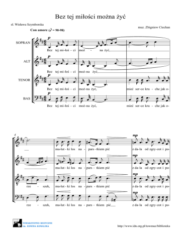 Bez tej miłości można żyć sł. Wisława Szymborska muz. Zbigniew Ciechan Con amore (e = 90-98) ° ## 6 p j r œr SOPRAN & 8 œ œ œ œ œ Bez tej mi - łoś - ci moż ALT - ## 6 p j r K r œr & 8 œ œ™ r œ œ œ œ œ Bez tej mi - łoś - ci moż - na żyć, p TENOR ## 6 r œr œ œj r Kr & 8 œ™ œ œ œ œ ‹ Bez tej mi - łoś - ci moż - na żyć, p Kr ? # 6 œ œ œ ™ œ œ BAS J R œ œ ¢ #8 œ R R Bez tej mi - łoś - ci moż - na żyć, ° ## ˙ ™ & # &# ¢ œ ## œ & œ œ œ™ ‹ rze - szek, ? ## œ rze œ j œ œ™ œ™ ma-lut - ki los na - pars - tkiem pić œ#œ œ™ œ œ™ J - szek, œ œ J na żyć, œ œ ™ œ œ œ #œ ™ œ œj œ™ J J R J 4 œ™ r r œ™ œ œ œœ j j jnœj™ œr œ™ œ œ œ™ # œ œ œ ma-lut - ki los na - pars - tkiem pić j j œ œ œ ™ R œ œJ œ™ œ œJ œ™ œ œ™ œ œ œ J J R J œ ma-lut - ki los na - pars - tkiem pić œ œ j J #œ- ma-lut - ki los na - pars - tkiem pić œœœ œ™ j œ œ œ œ™ R R r r r œ œœ œ œ œR R œ™ J r œ œ œr R mieć ser - ce kru - che jak o- mieć ser - ce kru - che jak o- j j r rr nœ œ™ œ œ ™ œ œ œr J mp z da - la od zgry - zot i po- j j j rrr œ œ ™ œr œ™ œ œ œ mp z da - la od zgry - zot i po- œ œ™ œr œj™ œr œ œr J J R mp z da - la od zgry - zot i po- j j r œ™ œ œ œ nœ œ™ œ J R R R mp z da - la od zgry - zot i po- http://www.idn.org.pl/towmuz/biblioteka ° ## & œ™ 2 œ œ œ œœ œ œœ ™™ œœ œœ œ R R J R R R 8 cie ## & œ™ cie - - œ™ szeń, ¢ cie r r j r r r œ œ œ œ™ œ œ œ œ ™ œ œ œ™ œ™ szeń, ° ## 6 & 8 œR œ ™ 12 p Na ## 6 p ™ & 8 rœ œ ‹ Na z da z da - la od zgry - zot i po - cie - szeń, ∑ œ #œ ™ œ œ™ œ - la. r r j r j œ #œ œ nœ ™ œ #œr œr nœ ™ œ œ œj œ œj 38 œj j j 68 œ œ z da - la. 38 ∑ szeń, Na ## 6 rp & 8 œ œ™ 68 38 j œ j 68 œ œœ z da - la od zgry - zot i po - cie - szeń, #œ ™ #-œ ™ - 38 œ ™ z da - la od zgry - zot i po - cie - szeń. ## & œ œJ œ™ ‹ cie - szeń, ? ## œ ™ œœ ™™ œ œ œ ™™ œœ œ œ™ nœ œ œ j œ œ™ j œ œ™ j œ œ™ ? ## 6 ≈ r r r œ œ œ œ œ ™ 8 œ œ œ R R J œœ ¢ mf Na włas-ną mia-rę znać na - dzie - ję, œ™ œ œ œ œ™ 68 ∑ ˙™ r œr œj r r r œœœ œ œ œ r r œj œr œr œr œ œ œ œ j j œ œ œ œ >œ mf w mro-ku kry-jów-kę so-bie mf w mro-ku kry-jów-kę so-bie u - j œ œ™ wić, f u - wić, o, f w mro-ku kry-jów - kę so-bie u - wić, o, r r j œ œ œ œ™ r r r œ œ œ œ™ > œ œJ http://www.idn.org.pl/towmuz/biblioteka ° ## f & ≈ œR œR œR œR œR œ œJ #œ ™ œ œ 3 r j j r ≈ nœ œ œ œ ™ œ œr œr J 16 o bla - sku próch - na mó - wić "dnie - je," ## f j & ≈ œr œr œr r œr œ œ œ œ o bla - sku próch - na mó - wić "dnie - œ™ o blas - ku słoń - ca nic nie j j œ œ j ≈ r j j œ ™ œr œr r œ™ œ œ œ œ œ je, dnie - je," o blas - ku słoń - ca nic nie r j r ≈ nœ œ œJ œJ ™ œ œ œ R R ## r r r r r r j & œ œ œ œ œ œ œ œ œ™ #œ#œ œ™ ‹ o bla - sku próch - na mó - wić "dnie - je," ? ## œ J ¢ ° ## & œ™ œ œ œ œ #œ j œ œ R R R R bla - sku próch - na mó - wić "dnie - o blas - ku słoń - ca nic nie nœ œ œ j ≈ r j j œ™ œ œ œ #œ ™ nœ œ œ J R R R J je, dnie - je," o blas - ku słoń - ca nic nie #### 19 mó ## & œ™ mó - - œ™ ˙™ ˙™ œ™ œ wić, o r œ œr œ™j œr œr œr œ wić. ## & œ ™ œ œ œ œ™ ‹ mó wić, ¢ ? ## œ™ mó œ™ - wić, œ nic œ o blas - ku słoń - ca nic nie j œ #œ ™ nie mó nœ mó - - œ œR œ™ œ œ œR œ ™ œ œ J R R R blas - ku słoń - ca nic nie mó - j œ œ™ wić. j œ œ™ wić. #### #### wić. œ™ #### http://www.idn.org.pl/towmuz/biblioteka ° ####mf j j j & œ œ œ œ œ œ œ™ 4 22 espressivo j œ œ œ™ Zie - mio oj - czy - sta, zie - mio ####mf j j j & œ œ œ œ™ œ œœ j œ œ œ™ Zie - mio oj - czy - sta, zie - mio #### ™ œ œ œj œ™ œ œ œ œ™ & œ J J ‹ Zie - mio oj - czy - sta, o zie - mio ? #### ™ œ ¢ jas - na, poco cresc. œ œ œ œ œ ≈œ J œ™ R R J J R R j œ œ œ™ poco cresc. r j j ≈ œ œ œ œj™ œr œr r œ jas - na, nie bę-dę po-wa - lo - nym nie bę-dę po-wa - lo - nym j œ œ œ >œJ œ jas - na, nie bę j j j j j j œ œ œ ™ œ œ œ ™ œ œ œ œ™ œ >œ œ ° #### œ ™ œ™ & Oj - czy - sta, o zie - mio, zie - mio jas - na, nie bę #œ œ™ œ œ œ J J R R R poco cresc. - dę po-wa - lo - nym œ œ™j œr œr œr J poco cresc. - dę po-wa - lo - nym drze- wem. j r j j œ œ™ œ ≈ œ œ œ J R R œ œ™ œ œ œ œœ œœ œœ œœ ™™ J R œ™ œ ™ ≈ œr œj œj œj™ œr œr r j j œ œ™ œ œ œ œ œ œ œ™ 27 #### & œ œ œ™ J drze- wem. mf Co-dzien-nie moc - niej w cie-bie wra -stam ra - doś - cią, mf Co-dzien-nie moc - niej w cie-bie #### ™ nœ œ œj œ & ‹ drze- wem. Co - dzien ? #### j œ™ œ œ œ ¢ drze- wem. Co - dzien - - wra-stam ra - doś - cią, mf j œ™j œr œr œr œ J œ œ œ œ œ™ J œ™ œ œ œ J R R R j œj™ œr œr œr œ J œ œ œ™ j r r r œ™ œ œ œ nie moc - niej w cie-bie wra - stam nie moc - niej w cie-bie wra - stam ra ra - doś - cią, ra - doś - cią, œ™ mf - doś - cią, ra - doś - cią, http://www.idn.org.pl/towmuz/biblioteka ° #### œ œ & 31 smut #### & œ smut #### ™ œ & ‹ smut ¢ j œœ œœ ™™ œœ ™™ œ œœ œœ™™ œ j œ œ™ œ™ œ œ œ ™ - kiem, du - kiem, - du œ J œ J œ J œ J œ J œ J smut - ° #### fœ™ & J 34 œ œ œ œ™ R R R J jak zer - wa - na nić. #### f j & œ™ r r r j œ œ œ œ™ jak #### fœ™ & J ‹ jak ? #### œ™j ¢ œ™ kiem, smut- kiem, du a tempo zer - wa - na nić. - œ™ kiem, smut- kiem, du ? #### œ™ - - - mą, f r r r œ œ œ œ™j jak zer - wa - na nić. gnie - wem, gnie -wem. Nie bę - dę j 