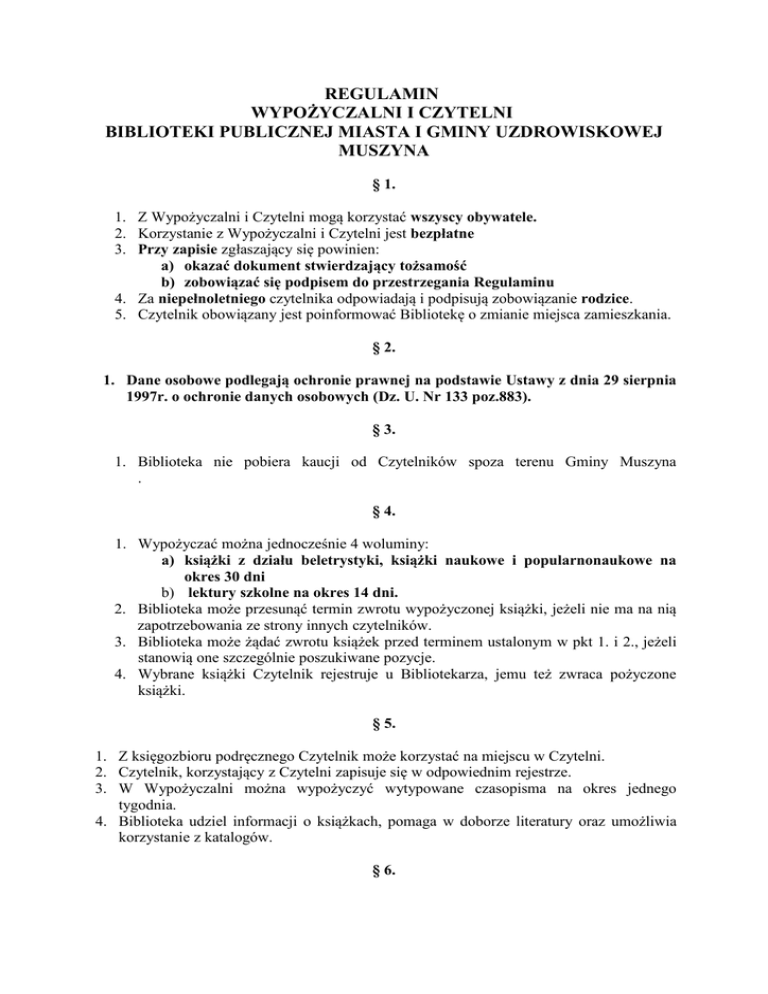 REGULAMIN WYPOŻYCZALNI I CZYTELNI BIBLIOTEKI PUBLICZNEJ MIASTA I GMINY UZDROWISKOWEJ MUSZYNA § 1. 1. Z Wypożyczalni i Czytelni mogą korzystać wszyscy obywatele. 2. Korzystanie z Wypożyczalni i Czytelni jest bezpłatne 3. Przy zapisie zgłaszający się powinien: a) okazać dokument stwierdzający tożsamość b) zobowiązać się podpisem do przestrzegania Regulaminu 4. Za niepełnoletniego czytelnika odpowiadają i podpisują zobowiązanie rodzice. 5. Czytelnik obowiązany jest poinformować Bibliotekę o zmianie miejsca zamieszkania. § 2. 1. Dane osobowe podlegają ochronie prawnej na podstawie Ustawy z dnia 29 sierpnia 1997r. o ochronie danych osobowych (Dz. U. Nr 133 poz.883). § 3. 1. Biblioteka nie pobiera kaucji od Czytelników spoza terenu Gminy Muszyna . § 4. 1. Wypożyczać można jednocześnie 4 woluminy: a) książki z działu beletrystyki, książki naukowe i popularnonaukowe na okres 30 dni b) lektury szkolne na okres 14 dni. 2. Biblioteka może przesunąć termin zwrotu wypożyczonej książki, jeżeli nie ma na nią zapotrzebowania ze strony innych czytelników. 3. Biblioteka może żądać zwrotu książek przed terminem ustalonym w pkt 1. i 2., jeżeli stanowią one szczególnie poszukiwane pozycje. 4. Wybrane książki Czytelnik rejestruje u Bibliotekarza, jemu też zwraca pożyczone książki. § 5. 1. Z księgozbioru podręcznego Czytelnik może korzystać na miejscu w Czytelni. 2. Czytelnik, korzystający z Czytelni zapisuje się w odpowiednim rejestrze. 3. W Wypożyczalni można wypożyczyć wytypowane czasopisma na okres jednego tygodnia. 4. Biblioteka udziel informacji o książkach, pomaga w doborze literatury oraz umożliwia korzystanie z katalogów. § 6. 1. Czytelnik jest zobowiązany do szanowania książek będących własnością społeczną, powinien też zwrócić uwagę na stan książki przed jej wypożyczeniem. Zauważone uszkodzenia należy zgłosić bibliotekarzowi. 2. Za szkody wynikłe ze zgubienia, uszkodzenia lub zniszczenia książek odpowiada Czytelnik. 3. Wysokość odszkodowania ustala Dyrektor Biblioteki. 4. Na sumy wpłacone z tytułu zgubienia lub uszkodzenia książki Biblioteka wydaje Czytelnikowi pokwitowanie. § 7. 1. Za przetrzymywanie książki ponad ustalony termin określony w § 4. pkt.1 Biblioteka pobiera opłaty w kwocie 0, 30 zł za każdy dzień. Za wysłanie upomnienia Biblioteka pobiera opłatę w wysokości 1,50 zł. 2. Biblioteka ma prawo odmówić korzystania ze zbiorów w sytuacji, kiedy czytelnik posiada zaległości w pozostałych Filiach Biblioteki Gminnej. 3. Wypożyczenie może nastąpić po uregulowaniu zaległości. 4. Czytelnik, do którego Biblioteka wysyła upomnienia, pokrywa ich całkowite koszty oraz jeśli zachodzi taka potrzeba konieczne koszty egzekucji. 5. Jeśli Czytelnik mimo upomnień odmawia zwrotu wypożyczonej książki lub uiszczenia należnych opłat, biblioteka ma prawo dochodzić swych roszczeń na drodze prawnej. 6. Za szkody wynikłe z zagubienia lub zniszczenia książki odpowiada czytelnik lub opiekunowie czytelnika niepełnoletniego. 7. Czytelnik jest zobowiązany odkupić bibliotece w zamian za książkę zagubioną lub zniszczoną identyczny jej egzemplarz, ewentualnie za zgodą bibliotekarza przekazać książkę przydatną w bibliotece i będącą w dobrym stanie technicznym i estetycznym. 8. Jeżeli występują obiektywne trudności do spełnienia pkt.7, Czytelnik jest zobowiązany wpłacić odszkodowanie za książkę zniszczoną lub zagubioną. Wartość odszkodowania ustala Bibliotekarz, uwzględniając aktualną wartość rynkową zagubionej książki. 9. W przypadku straty książki treściowo atrakcyjnej, poszukiwanej i niezbędnej w bibliotece, wartość odszkodowania należnego bibliotece jest zwielokrotniona do wartości antykwarycznej. 10. Biblioteka podpisała umowę ze Śląską Agencją Finansową „SAF-Windykacja”, która ma prawo w imieniu Biblioteki egzekwować należności za przetrzymywanie książek. § 8. 1. Czytelnik, niestosujący się do przepisów niniejszego Regulaminu, może być czasowo, a w szczególnych wypadkach, na stałe pozbawiony prawa do korzystania z Wypożyczalni i Czytelni. 2. Decyzję w tej sprawie podejmuje Dyrektor Biblioteki Dyrektor Biblioteki Sylwia Rypel