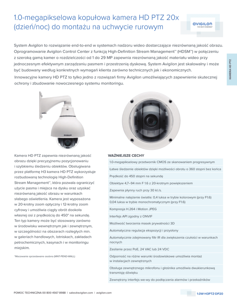 1.0-megapikselowa kopułowa kamera HD PTZ 20x (dzień/noc) do montażu na uchwycie rurowym System Avigilon to rozwiązanie end-to-end w systemach nadzoru wideo dostarczające niezrównaną jakość obrazu. z szeroką gamą kamer o rozdzielczości od 1 do 29 MP zapewnia niezrównaną jakość materiału wideo przy jednoczesnym efektywnym zarządzaniu pasmem i przestrzenią dyskową. System Avigilon jest skalowalny i może być budowany według konkretnych wymagań klienta zarówno technicznych jak i ekonomicznych. Innowacyjne kamery HD PTZ to tylko jedno z rozwiązań firmy Avigilon umożliwiających zapewnienie skutecznej ochrony i zbudowanie nowoczesnego systemu monitoringu. Kamera HD PTZ zapewnia niezrównaną jakość obrazu dzięki precyzyjnemu pozycjonowaniu i szybkiemu śledzeniu obiektów. Obsługiwana przez platformę H3 kamera HD PTZ wykorzystuje rozbudowaną technologię High-Definition Stream Management™, która pozwala ograniczyć użycie pasma i miejsca na dysku oraz uzyskać niezrównaną jakość obrazu w warunkach słabego oświetlenia. Kamera jest wyposażona w 20-krotny zoom optyczny i 12-krotny zoom cyfrowy i umożliwia ciągły obrót dookoła własnej osi z prędkością do 450° na sekundę. Ten typ kamery może być stosowany zarówno w środowisku wewnętrznym jak i zewnętrznym, w szczególności na obszarach rozległych min. w galeriach handlowych, lotniskach, zakładach petrochemicznych, kasynach i w monitoringu miejskim. *Mocowanie sprzedawane osobno (MNT-PEND-WALL) WAŻNIEJSZE CECHY 1.0-megapikselowy przetwornik CMOS ze skanowaniem progresywnym Łatwe śledzenie obiektów dzięki możliwości obrotu o 360 stopni bez końca Prędkość do 450 stopni na sekundę Obiektyw 4,7–94 mm F 1.6 z 20-krotnym powiększeniem Zapewnia płynny ruch przy 30 kl./s. Minimalne natężenie światła: 0,4 luksa w trybie kolorowym (przy F1.6) 0,04 luksa w trybie monochromatycznym (przy F1.6) Kompresja H.264 i Motion JPEG Interfejs API zgodny z ONVIF Możliwość tworzenia masek prywatności 3D Automatyczna regulacja ekspozycji i przysłony Automatycznie zdejmowany filtr IR dla zwiększenia czułości w warunkach nocnych Zasilanie przez PoE, 24 VAC lub 24 VDC Odporność na różne warunki środowiskowe umożliwia montaż w instalacjach zewnętrznych Obsługa zewnętrznego mikrofonu i głośnika umożliwia dwukierunkową transmisję dźwięku Zewnętrzny interfejs we-wy do podłączania alarmów i przekaźników POMOC TECHNICZNA 00 800 4567 8988 | [email protected] | avigilon.com 1.0W-H3PTZ-DP20 KAMERA HD PTZ Oprogramowanie Avigilon Control Center z funkcją High-Definition Stream Management™ (HDSM™) w połączeniu Dane techniczne KAMERA SIEĆ Przetwornik obrazu WDR 1/2,8" CMOS ze skanowaniem progresywnym Liczba aktywnych pikseli 1280 (H) x 720 (V) Rozmiary matrycy 4,8 mm (H) x 2,7 mm (V) (0,189" (H) x 0,106" (V)) Minimalne natężenie światła Zakres dynamiczny 0,4 luksa (przy F1.6) w trybie kolorowym; 0,04 luksa (przy F1.6) w trybie monochromatycznym 100 dB Obiektyw Obiektyw 4,7–94 mm F 1.6 z 20-krotnym powiększeniem i autofocusem Kąt widzenia 2,9° - 55,2° Metoda kompresji obrazu H.264 (MPEG-4 Part 10/AVC), Motion JPEG Szybkość odświeżania obrazu Przesyłanie strumieniowe 30 (wszystkie rozdzielczości) Skalowanie rozdzielczości Do 352 x 240 Detekcja ruchu Regulowana czułość i próg Sterowanie elektroniczną migawką Regulacja przysłony Automatyczne, ręczne (1/6 do 1/8000 s) Zmiana trybu (dzień/noc) Automatyczna, ręczna Redukcja migotania 50 Hz, 60 Hz Balans bieli Automatyczny, ręczny Liczba stref prywatności Do 4 stref, obsługa masek 3D Wstępne ustawienia 100 nazwanych ustawień wstępnych Trasy patrolowe 10 nazwanych stref patrolowych Metoda kompresji dźwięku G.711 PCM 8 kHz Wejście audio Wejście liniowe Wyjście audio Wejście liniowe Wyjście wideo NTSC/PAL Zewnętrzne porty I/O 2 Alarm In, 2 Alarm Out Standard sieci 100BASE-TX Typ okablowania CAT5 Złącze RJ-45 API Zabezpieczenia Protokoły transmisji strumieniowej [3.4] 85.87 ELEKTRYCZNE [8.9] Ø226 3,9 kg (8,6 lbs) Kopuła Akrylowa, bezbarwna Korpus Aluminiowy Obudowa Mocowanie na uchwycie rurowym Wykończenie [3.4] Warstwa proszkowa cool85.87 gray 2 Nachylenie 186°, 0,05–360°/s Obrót 360°, ciągły, 0,05–450°/s Źródło zasilania Prąd zmienny: 24 V +/-10% Prąd stały 24 V +/-10% Temperatura pracy PoE: zgodność z IEEE 802.3at Class 4 PoE Plus 55 W przy zasilaniu prądem przemiennym 44 W przy zasilaniu prądem stałym 25,5 W przy zasilaniu PoE zgodnym z IEEE 802.3at Class 4 Wodoodporne złącze 2-stykowe Temperatura przechowywania -45°C do + 50°C z zasilaniem zewnętrznym -30 °C do + 50°C z zasilaniem IEEE 802.3at Class 4 PoE Plus –10 °C do +70 °C Wilgotność powietrza 20–80% (wilgotność względna, bez skraplania) Bezpieczeństwo UL 60950 CVV CB Scheme CSA 60950 C-Tick Klasa IK09 odporności Odporność na warunki pogodowe IP66 na uderzenia FCC Part 15 Subpart B Class B EN 55022 Class B IC ICES-003 Class B EN 55024 Class B EN 61000-4-4 EN 61000-4-11 EN 61000-4-2 EN 61000-4-5 EN 61000-4-3 EN 61000-4-6 Emisja elektromagnetyczna Odporność elektromagnetyczna [11.8] 299.77 [3.4] 85.87 1 1/2” Ochrona hasłem, szyfrowanie HTTPS, uwierzytelnianie MD5, uwierzytelnianie WS, dziennik dostępu użytkowników. IPv4, HTTP, HTTPS, SOAP, DNS, NTP, RTSP, RTCP, RTP, TCP, UDP, IGMP, ICMP, DHCP, Zeroconf, ARP, LLDP RTP/UDP, RTP/UDP multicast, RTP/RTSP/TCP, RTP/RTSP/HTTP/TCP, RTP/ RTSP/HTTPS/TCP, HTTP [11.8] [11.8] 226 mm x 299,77 mm 299.77 (8,9" x 11,8") Środowisko Informacje dotyczące zamówienia [3.4] 85.87 Automatyczna, ręczna Waga Złącze zasilania certyfikaty Multi-stream H.264 i Motion JPEG Wymiary (średnica x wys.) Pobór mocy warunki środowiskowe [8.9] Ø226 [8.9] Zgodność z ONVIF (www.onvif.org) Ø226 Protokół MECHANICZNE Wymiary zewnętrzne 1.0W-H3PTZ-DP20 1.0-megapikselowa kopułowa kamera HD PTZ 20x (dzień/noc) do montażu na uchwycie rurowym MNT-PEND-WALL