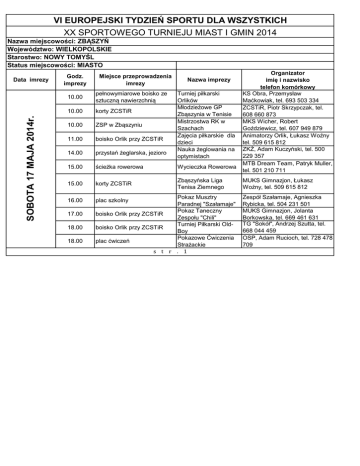 VI EUROPEJSKI TYDZIEŃ SPORTU DLA WSZYSTKICH XX SPORTOWEGO TURNIEJU MIAST I GMIN 2014 Nazwa miejscowości: ZBĄSZYŃ Województwo: WIELKOPOLSKIE Starostwo: NOWY TOMYŚL Status miejscowości: MIASTO SOBOTA 17 MAJA 2014r. Data imrezy Godz. imprezy Miejsce przeprowadzenia imrezy Nazwa imprezy 10.00 pełnowymiarowe boisko ze sztuczną nawierzchnią 10.00 korty ZCSTiR 10.00 ZSP w Zbąszyniu 11.00 boisko Orlik przy ZCSTiR 14.00 przystań żeglarska, jezioro 15.00 ścieżka rowerowa Wycieczka Rowerowa 15.00 korty ZCSTiR Zbąszyńska Liga Tenisa Ziemnego 16.00 plac szkolny 17.00 18.00 18.00 Turniej piłkarski Orlików Młodzieżowe GP Zbąszynia w Tenisie Ziemnym RK w Mistrzostwa Szachach Zajęcia piłkarskie dla dzieci Nauka żeglowania na optymistach Pokaz Musztry Paradnej "Szałamaje" Pokaz Taneczny boisko Orlik przy ZCSTiR Zespołu "Chili" Turniej Piłkarski Oldboisko Orlik przy ZCSTiR Boy Pokazowe Ćwiczenia plac ćwiczeń Strażackie s t r . 1 Organizator imię i nazwisko telefon komórkowy KS Obra, Przemysław Maćkowiak, tel. 693 503 334 ZCSTiR, Piotr Skrzypczak, tel. 608 660 873 MKS Wicher, Robert Goździewicz, tel. 607 949 879 Animatorzy Orlik, Łukasz Woźny tel. 509 615 812 ZKŻ, Adam Kuczyński, tel. 500 229 357 MTB Dream Team, Patryk Muller, tel. 501 210 711 MUKS Gimnazjon, Łukasz Woźny, tel. 509 615 812 Zespół Szałamaje, Agnieszka Rybicka, tel. 504 231 501 MUKS Gimnazjon, Jolanta Borkowska, tel. 669 461 631 TG "Sokół", Andrzej Szutta, tel. 668 044 459 OSP, Adam Rucioch, tel. 728 478 709 NIEDZIELA, 18 MAJA 2014r. Data imrezy Godz. imprezy Miejsce przeprowadzenia imrezy Nazwa imprezy Organizator imię i nazwisko telefon komórkowy 10.00 przystań żeglarska, jezioro Mini-Regaty Żeglarskie ZKŻ, Adam Kuczyński, tel. 500 w Klasie Optymist 229 357 10.00 korty ZCSTiR Zbąszyńska Liga Tenisa Ziemnego 11.00 boisko Orlik przy ZCSTiR Rekreacyjne Rozgrywki MUKS Gimnazjon, Łukasz Koszykówki Krzyżański, tel. 887 244 773 13.00 przedszkole i okolice 15.00 16.00 16.00 10.00 16.00 16.00 Rodzinny Spacer z Dziećmi "Poznajemy przyrodę" Łazienki Zbąszyń-Nowa Wieś- Rajd Rowerowy Zbąszyń "Sokołów" Popołudnie z Tenisem korty ZCSTiR Ziemnym Rozgrywki Rodzinne w boisko Orlik przy ZCSTiR Piłkę Nożną Gminne Zawody plac ćwiczeń Strażackie Rozgrywki Piłkarskie boisko Orlik przy ZS Nr 2 dla Niezrzeszonych Rozgrywki Piłki Nożnej boisko KS Płomień Młodzików s t r . 2 MUKS Gimnazjon, Łukasz Woźny, tel. 509 615 812 Przedszkole "Strzyżewo", Renata Hauser, tel. 600 010 336 TG "Sokół", Bogdan Prętki, tel. 693 790 154 ZCSTiR, Piotr Skrzypczak, tel. 608 660 873 Animatorzy Orlik, Łukasz Woźny tel. 509 615 812 OSP, Adam Rucioch, tel. 728 478 709 Animatorzy Orlik, Wiesław Ciepielewski, tel. 663 846 095 KS Płomień, Przemysław Borkowski, tel. 784 490 534 PONIEDZIAŁEK 19 MAJA 2014r. Data imrezy Godz. imprezy Miejsce przeprowadzenia imrezy Organizator imię i nazwisko telefon komórkowy Przedszkole Samorządowe, "Z Piłką na Wesoło" Bernadeta Łukaszewska, tel. 661 633 955 "Gimnastyka to Przedszkole "Świat Malucha", Zabawa" Kamila Bok, tel. 685 377 594 Gminne Zawody 4-boju ZSP, Ryszard Frasz, tel. 606 970 Lekkoatletycznego 871 Nazwa imprezy 8.00 ogród przedszkolny 9.00 przedszkole 9.00 boisko szkolne 10.00 plac zabaw Turniej Sprawnościowy Przedszkole "Strzyżewo", Renata Hauser, tel. 600 010 336 10.00 hala ZCSTiR Turniej Unihokeja Dziewcząt Szkół Gimnazjalnych MUKS Gimnazjon, Bartosz Wojtal, tel. 509 654 886 12.00 plac zabaw 12.00 13.00 15.00 15.00 15.00 15.00 15.00 13.30 15.00 16.00 16.00 19.00 20.00 10.00 11.00 Przedszkole "Lipowy Zakątek", Gry i Zabawy Sportowe Sylwia Szczepaniak, tel. 608 023 275 ZSP, Maciej Wawrzyński, tel. 506 boisko szkolne Mini Olimpiada 743 329 ZSP, Filip Jankowiak, tel. 693 boisko KS Płomień Turniej ringo 778 774 Ćwiczenia i Nauka Zespół REGO, Regina Gołek, tel. zck Tańca 694 652 954 Zbąszyńska Szkółka ZCSTiR, Filip Jankowiak, tel. 639 hala ZCSTiR Sportowa 778 774 Koszykówka Dziewcząt Turniej Piłki Nożnej dla Animatorzy Orlik, Wiesław Dziewcząt Szkół boisko Orlik przy ZS Nr 2 Ciepielewski, tel. 663 846 095 Gimnazjalnych i Ponadgimnazjalnych Gimnastyka WTZ, Dawid Moska, tel. 693 230 WTZ, sala gimnastyczna Korekcyjna dla 915 Seniorów Rozgrywki Piłki WTZ, Stanisław Chlebowski, tel. WTZ, boisko Siatkowej 609 248 920 PKS MOS, Łukasz Woźny, tel. hala ZCSTiR Zajęcia z Siatkówki 509 615 812 Zajęcia Taneczne MUKS Gimnazjon, Jolanta hala ZCSTiR Zespołu Chili Borkowska, tel. 669 461 631 Popołudnie z Tenisem ZCSTiR, Piotr Skrzypczak, tel. korty ZCSTiR Ziemnym 608 660 873 KS Obra, sekcja bokserska, Pierwszy Krok sala sportowa ZCSTiR Tomasz Bartczak, tel. 609 707 Bokserski-Walki 644 Sekcja taekwondo, Jarosław sala sportowa ZCSTiR Walki Taekwondo Przybyła, tel. 507 795 623 Akademia Reisa, PR9, Tomasz Śliwa, tel. 600 919 boisko Orlik przy ZS Nr 2 Zajęcia Piłkarskie dla 646 Dzieci Mistrzostwa w ZS Nr 1, Tomasz Śliwa, tel. 600 plaża "Łazienki" Siatkówce Plażowej ZS 919 646 Nr 1 w Zbąszyniu Spacer z kijkami SOSW, Marcin Kluj, tel. 605 782 park miejski Nordic Walking 960 s t r . 3 WTOREK, 20 MAJA 2014r. Data imrezy Godz. imprezy Miejsce przeprowadzenia imrezy Nazwa imprezy Organizator imię i nazwisko telefon komórkowy 8.30 ogród przedszkolny Zestaw Ćwiczeń GimnastycznychRytmika Przedszkole "Lipowy Zakątek", Aneta Wachowska, tel. 68 3869 100 9.00 ogród przedszkolny Tor Przeszkód dla Wszystkich Grup Przedszkole Samorządowe, Mirosława Przybylska, tel. 604 392 064 10.00 plac przedszkolny 10.00 11.00 11.00 11.30 11.30 12.30 15.00 16.00 17.00 17.00 18.00 19.00 "Do Biegu, Gotów, Start" Zabawy Sportowe z teren przedszkola Elementami Współzawodnictwa Turniej Piłki Nożnej dla Chłopców Szkół boisko Orlik przy ZS Nr 2 Gimnazjalnych i Ponadgimnazjalnych boisko szkolne i tereny przyszkolne Biegi Przełajowe Przedszkole "Świat Malucha", Kamila Bok, tel. 685 377 594 Przedszkole "Stafanowo", Małgorzata Irzyńska, te