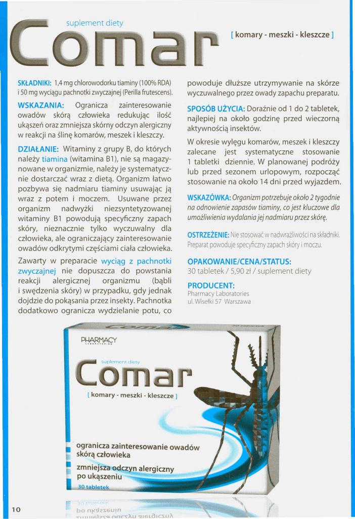 SKŁADNIKI: 1A mg chlorowodorku tiaminy (100% RDA) i SOmg wyciągu pachnotki zwyczajnej (Perilla frutescens). powoduje dłuższe utrzymywanie na skórze wyczuwalnego przez owady zapachu preparatu. WSKAZANIA: Ogranicza zainteresowanie owadów skórą człowieka redukując ilość ukąszeń oraz zmniejsza skórny odczyn alergiczny w reakcji na ślinę komarów, meszek i kleszczy. SPOSÓB UŻYCIA: Doraźnie od 1 do 2 tabletek, najlepiej na około godzinę przed wieczorną aktywnością insektów. DZIAŁANIE: Witaminy z grupy B, do których należy tiamina (witamina B1), nie są magazynowane w organizmie, należy je systematycznie dostarczać wraz z dietą. Organizm łatwo pozbywa się nadmiaru tiaminy usuwając ją wraz z potem i moczem. Usuwane przez organizm nadwyżki niezsyntetyzowanej witaminy B1 powodują specyficzny zapach skóry, nieznacznie tylko wyczuwalny dla człowieka, ale ograniczający zainteresowanie owadów odkrytymi częściami ciała człowieka. Zawarty w preparacie wyciąg z pachnotki zwyczajnej nie dopuszcza do powstania reakcji alergicznej organizmu (bąbli i swędzenia skóry) w przypadku, gdy jednak dojdzie do pokąsania przez insekty. Pachnotka dodatkowo ogranicza wydzielanie potu, co • ogranicza zainteresowanie skórą człowieka zmniejsza odczyn alergiczny po ukąszeniu W okresie wylęgu komarów, meszek i kleszczy zalecane jest systematyczne stosowanie 1 tabletki dziennie. W planowanej podróży lub przed sezonem urlopowym, rozpocząć stosowanie na około 14 dni przed wyjazdem. WSKAZÓWKA: Organizm potrzebuje okolo 2 tygodnie na odnowienie zapasów tiaminy, co jest kluczowe dla umożliwienia wydalania jej nadmiaru przez skórę. OSTRZEŻENIE: Nie stosować w nadwrażliwości na składniki. Preparat powoduje specyficzny zapach skóry i moczu. OPAKOWANIE/CENA/STATUS: 30 tabletek 15,90 zł 1 suplement diety PRODUCENT: Pharmacy Laboratories ul. Wisełki 57 Warszawa owadów