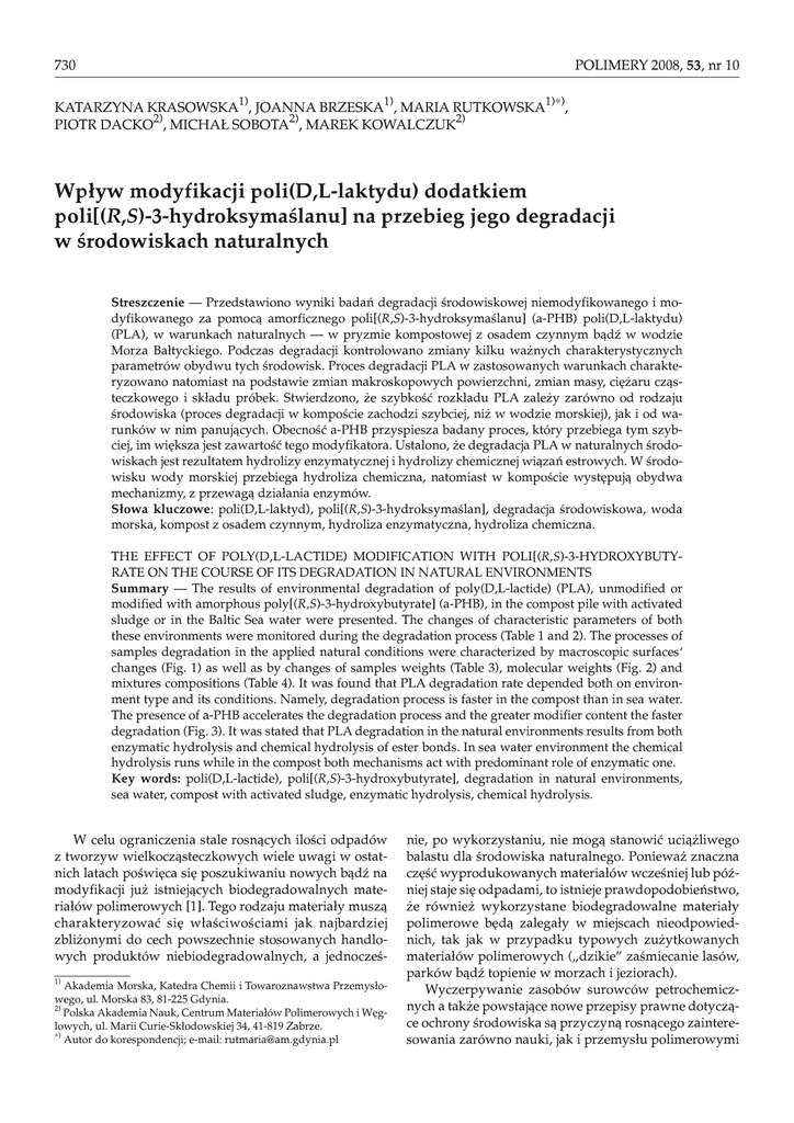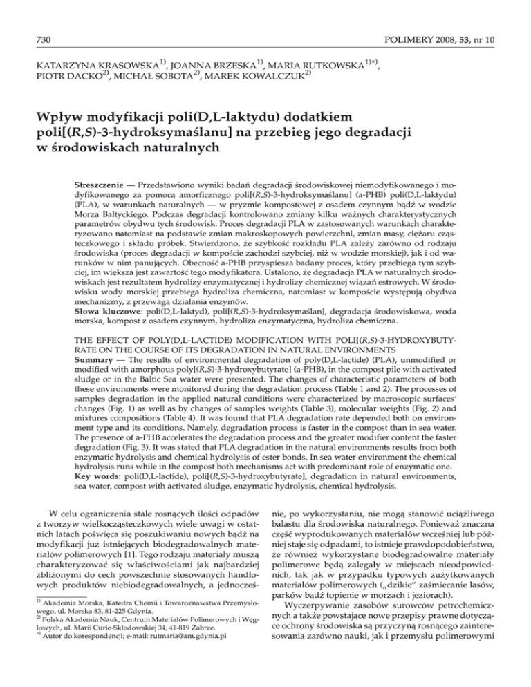 POLIMERY 2008, 53, nr 10 730 KATARZYNA KRASOWSKA1), JOANNA BRZESKA1), MARIA RUTKOWSKA1)∗), PIOTR DACKO2), MICHA£ SOBOTA2), MAREK KOWALCZUK2) Wp³yw modyfikacji poli(D,L-laktydu) dodatkiem poli[(R,S)-3-hydroksymaœlanu] na przebieg jego degradacji w œrodowiskach naturalnych Streszczenie — Przedstawiono wyniki badañ degradacji œrodowiskowej niemodyfikowanego i modyfikowanego za pomoc¹ amorficznego poli[(R,S)-3-hydroksymaœlanu] (a-PHB) poli(D,L-laktydu) (PLA), w warunkach naturalnych — w pryzmie kompostowej z osadem czynnym b¹dŸ w wodzie Morza Ba³tyckiego. Podczas degradacji kontrolowano zmiany kilku wa¿nych charakterystycznych parametrów obydwu tych œrodowisk. Proces degradacji PLA w zastosowanych warunkach charakteryzowano natomiast na podstawie zmian makroskopowych powierzchni, zmian masy, ciê¿aru cz¹steczkowego i sk³adu próbek. Stwierdzono, ¿e szybkoœæ rozk³adu PLA zale¿y zarówno od rodzaju œrodowiska (proces degradacji w kompoœcie zachodzi szybciej, ni¿ w wodzie morskiej), jak i od warunków w nim panuj¹cych. Obecnoœæ a-PHB przyspiesza badany proces, który przebiega tym szybciej, im wiêksza jest zawartoœæ tego modyfikatora. Ustalono, ¿e degradacja PLA w naturalnych œrodowiskach jest rezultatem hydrolizy enzymatycznej i hydrolizy chemicznej wi¹zañ estrowych. W œrodowisku wody morskiej przebiega hydroliza chemiczna, natomiast w kompoœcie wystêpuj¹ obydwa mechanizmy, z przewag¹ dzia³ania enzymów. S³owa kluczowe: poli(D,L-laktyd), poli[(R,S)-3-hydroksymaœlan], degradacja œrodowiskowa, woda morska, kompost z osadem czynnym, hydroliza enzymatyczna, hydroliza chemiczna. THE EFFECT OF POLY(D,L-LACTIDE) MODIFICATION WITH POLI[(R,S)-3-HYDROXYBUTYRATE ON THE COURSE OF ITS DEGRADATION IN NATURAL ENVIRONMENTS Summary — The results of environmental degradation of poly(D,L-lactide) (PLA), unmodified or modified with amorphous poly[(R,S)-3-hydroxybutyrate] (a-PHB), in the compost pile with activated sludge or in the Baltic Sea water were presented. The changes of characteristic parameters of both these environments were monitored during the degradation process (Table 1 and 2). The processes of samples degradation in the applied natural conditions were characterized by macroscopic surfaces‘ changes (Fig. 1) as well as by changes of samples weights (Table 3), molecular weights (Fig. 2) and mixtures compositions (Table 4). It was found that PLA degradation rate depended both on environment type and its conditions. Namely, degradation process is faster in the compost than in sea water. The presence of a-PHB accelerates the degradation process and the greater modifier content the faster degradation (Fig. 3). It was stated that PLA degradation in the natural environments results from both enzymatic hydrolysis and chemical hydrolysis of ester bonds. In sea water environment the chemical hydrolysis runs while in the compost both mechanisms act with predominant role of enzymatic one. Key words: poli(D,L-lactide), poli[(R,S)-3-hydroxybutyrate], degradation in natural environments, sea water, compost with activated sludge, enzymatic hydrolysis, chemical hydrolysis. W celu ograniczenia stale rosn¹cych iloœci odpadów z tworzyw wielkocz¹steczkowych wiele uwagi w ostatnich latach poœwiêca siê poszukiwaniu nowych b¹dŸ na modyfikacji ju¿ istniej¹cych biodegradowalnych materia³ów polimerowych [1]. Tego rodzaju materia³y musz¹ charakteryzowaæ siê w³aœciwoœciami jak najbardziej zbli¿onymi do cech powszechnie stosowanych handlowych produktów niebiodegradowalnych, a jednoczeœ1) Akademia Morska, Katedra Chemii i Towaroznawstwa Przemys³owego, ul. Morska 83, 81-225 Gdynia. 2) Polska Akademia Nauk, Centrum Materia³ów Polimerowych i Wêglowych, ul. Marii Curie-Sk³odowskiej 34, 41-819 Zabrze. ∗) Autor do korespondencji; e-mail: [email protected] nie, po wykorzystaniu, nie mog¹ stanowiæ uci¹¿liwego balastu dla œrodowiska naturalnego. Poniewa¿ znaczna czêœæ wyprodukowanych materia³ów wczeœniej lub póŸniej staje siê odpadami, to istnieje prawdopodobieñstwo, ¿e równie¿ wykorzystane biodegradowalne materia³y polimerowe bêd¹ zalega³y w miejscach nieodpowiednich, tak jak w przypadku typowych zu¿ytkowanych materia³ów polimerowych („dzikie” zaœmiecanie lasów, parków b¹dŸ topienie w morzach i jeziorach). Wyczerpywanie zasobów surowców petrochemicznych a tak¿e powstaj¹ce nowe przepisy prawne dotycz¹ce ochrony œrodowiska s¹ przyczyn¹ rosn¹cego zainteresowania zarówno nauki, jak i przemys³u polimerowymi POLIMERY 2008, 53, nr 10 731 materia³ami biodegradowalnymi uzyskanymi z surowców odnawialnych [2, 3]. Dlatego te¿ polilaktyd (PLA) uznano za polimer przysz³oœci, mo¿e on byæ bowiem wytwarzany z surowców nie tylko petrochemicznych, ale równie¿ z odnawialnych (kwas mlekowy); dodatkowy, bardzo istotny impuls do rozwoju badañ stanowi jego biodegradowalnoœæ. Przewiduje siê, ¿e w najbli¿szym czasie zwiêkszy siê wykorzystanie polilaktydu w ga³êziach przemys³u wytwarzaj¹cych elementy wyposa¿enia wnêtrz, materia³y higieniczne, materia³y ochronne w budownictwie i rolnictwie, sieci rybackie a tak¿e pojemniki na odpady komunalne, produkty jednorazowego u¿ytku oraz materia³y do opakowañ [4]. W badaniach dotycz¹cych modyfikacji PLA, prowadz¹cych do poprawy w³aœciwoœci i zwiêkszenia jego konkurencyjnoœci na rynku biodegradowalnych materia³ów polimerowych, zwrócono uwagê na mo¿liwoœæ wykorzystania w charakterze efektywnego modyfikatora polilaktydu amorficznego poli[(R,S)-3-hydroksymaœlanu] (a-PHB), syntetyzowanego na drodze polimeryzacji β-butyrolaktonu wobec aktywowanych inicjatorów anionowych [5]. Z opublikowanych ju¿ wyników badañ wiadomo, ¿e degradacja polilaktydu w warunkach biotycznych i abiotycznych mo¿e byæ katalizowana zarówno enzymatycznie, jak i chemicznie jednak mechanizmy takich procesów znacznie siê ró¿ni¹ [6—9]. Degradacja enzymatyczna przebiega tylko na
