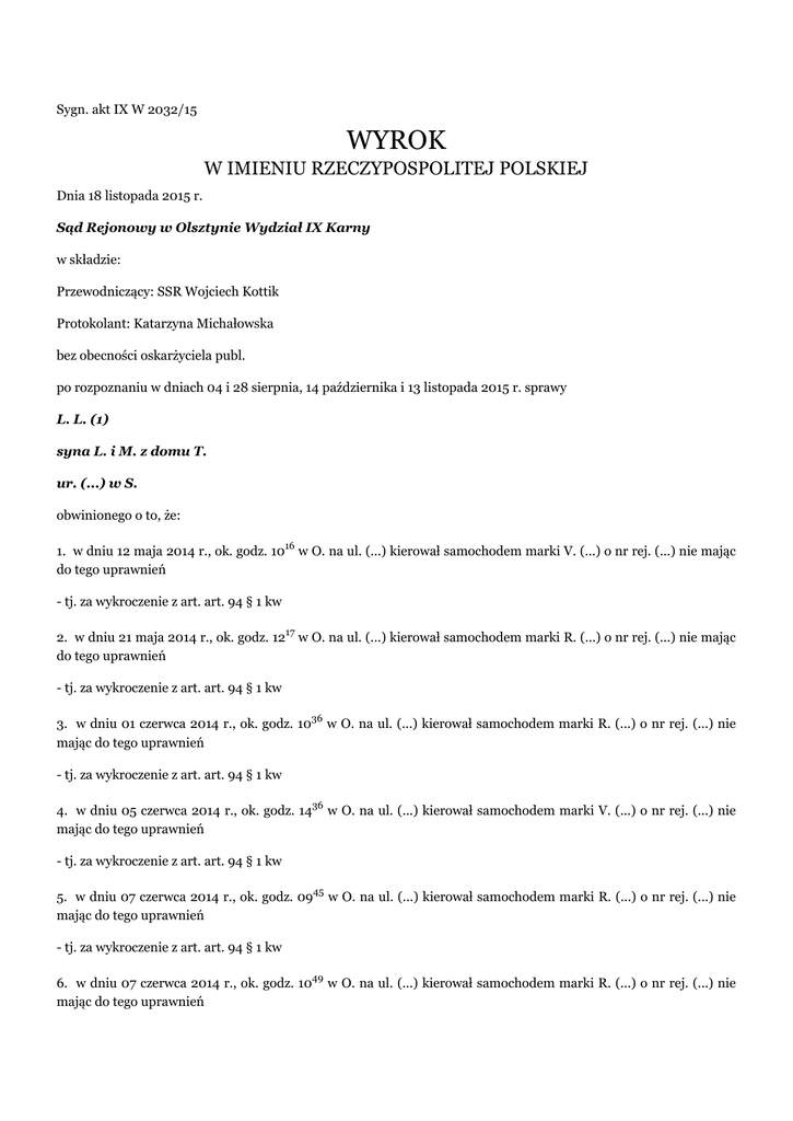 Sygn. akt IX W 2032/15 WYROK W IMIENIU RZECZYPOSPOLITEJ POLSKIEJ Dnia 18 listopada 2015 r. Sąd Rejonowy w Olsztynie Wydział IX Karny w składzie: Przewodniczący: SSR Wojciech Kottik Protokolant: Katarzyna Michałowska bez obecności oskarżyciela publ. po rozpoznaniu w dniach 04 i 28 sierpnia, 14 października i 13 listopada 2015 r. sprawy L. L. (1) syna L. i M. z domu T. ur. (...) w S. obwinionego o to, że: 1. w dniu 12 maja 2014 r., ok. godz. 1016 w O. na ul. (...) kierował samochodem marki V. (...) o nr rej. (...) nie mając do tego uprawnień - tj. za wykroczenie z art. art. 94 § 1 kw 2. w dniu 21 maja 2014 r., ok. godz. 1217 w O. na ul. (...) kierował samochodem marki R. (...) o nr rej. (...) nie mając do tego uprawnień - tj. za wykroczenie z art. art. 94 § 1 kw 3. w dniu 01 czerwca 2014 r., ok. godz. 1036 w O. na ul. (...) kierował samochodem marki R. (...) o nr rej. (...) nie mając do tego uprawnień - tj. za wykroczenie z art. art. 94 § 1 kw 4. w dniu 05 czerwca 2014 r., ok. godz. 1436 w O. na ul. (...) kierował samochodem marki V. (...) o nr rej. (...) nie mając do tego uprawnień - tj. za wykroczenie z art. art. 94 § 1 kw 5. w dniu 07 czerwca 2014 r., ok. godz. 0945 w O. na ul. (...) kierował samochodem marki R. (...) o nr rej. (...) nie mając do tego uprawnień - tj. za wykroczenie z art. art. 94 § 1 kw 6. w dniu 07 czerwca 2014 r., ok. godz. 1049 w O. na ul. (...) kierował samochodem marki R. (...) o nr rej. (...) nie mając do tego uprawnień - tj. za wykroczenie z art. art. 94 § 1 kw ORZEKA: I. obwinionego L. L. (1) uznaje za winnego popełnienia zarzucanych mu czynów z art. 94 § 1 kw i za to na podstawie art. 94 § 1 kw w zw. z art. 9 § 2 kw skazuje go na karę 3000,- (trzy tysiące) złotych grzywny; II. na podstawie art. 624 § 1 kpk w zw. z art. 119 kpw zwalnia obwinionego od kosztów postępowania i opłaty. UZASADNIENIE Sąd ustalił, następujący stan faktyczny: Obwiniony L. L. (1) - mieszkaniec O. aktualnie nie pracuje zawodowo na stałe i jak deklaruje utrzymuje się z zasiłków(...) w O.. Utrzymywał się w przeszłości i najprawdopodobniej nadal utrzymuje się z prac dorywczych jako hydraulik. W działalności tej użytkował samochód osobowy m-ki V. (...),(...), koloru (...) o nr rej. (...) a później również samochód osobowy m-ki R. (...) o nr rej. (...). Obwiniony w przeszłości posiadał uprawnienia do kierowania pojazdami mechanicznym kategorii A i B. Wyrokiem Sądu Rejonowego w O. z dnia 17 września 2009 r. obwiniony został skazany za przestępstwo z art. 178 a §1 kk. Wyrokiem tym orzeczono wobec niego m. in. zakaz prowadzenia wszelkich pojazdów mechanicznych na okres 2 lat, zaliczając jednocześnie na poczet tego zakazu okres zatrzymania dokumentu prawa jazdy od 17 czerwca 2009 r. L. L. (1) do dnia dzisiejszego nie odzyskał uprawnień do kierowania pojazdami mechanicznymi, twierdząc, że na przeszkodzie stał stan jego zdrowia. Pomimo nieposiadania uprawnień L. L. (1) kierował nadal pojazdami mechanicznymi, był zatrzymywany nawet do kontroli drogowych, w trakcie których legitymował się podrobionym(...) prawem jazdy, które miał uzyskać według jego zapewnień 16.06.2010 r. na terenieR. L. (1). Dokument ten został zakwestionowany i zatrzymany obwinionemu przez funkcjonariusza Straży Granicznej podczas przekraczania granicy RP na przejściu granicznym w B. we wrześniu 2014 r. Do grudnia 2010 r. obwiniony pozostawał w związku partnerskim z D. D. mieszkającą na (...) tego samego budynku przy ul. (...). Po tym jak obwiniony związał się z kolejną partnerką – H. S. (1) była konkubina popadła w konflikt z obwinionym. D. D. posiada działkę ogrodniczą w tym samym kompleksie ogrodów działkowych i tym samym bardzo często, niemal codziennie widuje obwinionego. Wiedziała też doskonale, że utracił on uprawnienia do kierowania a jego stan zdrowia nie pozwala mu na ich odzyskanie. W jej ocenie L. L. (1), ze względu na wadę wzroku i schorzenia neurologiczne, kierując samochodem stwarza zagrożenie bezpieczeństwa w ruchu drogowym. Dlatego też podejrzewając, że kieruje on pojazdami mimo braku uprawnień w maju 2014 r., zaczęła obserwować obwinionego w momentach gdy widziała należące do niego pojazdy i w miarę możliwości nagrywać aparatem kierowanie przez niego tymi samochodami. Między innymi w dniu 12 maja 2014 r. ok. godz. 1016 zaobserwowała jak L. L. (1) podjechał samochodem m – ki V. (...) o nr rej. (...) pod blok przy ul. (...) i udał się na podwórko. Po chwili wrócił, wsiadł do pojazdu i odjechał w nieznanym kierunku. Sytuację tę D. D. nagrała za pomocą aparatu w telefonie komórkowym. W dniu 21 maja 2014 r., około godz. 1100 obwiniony przebywał na działce ogrodniczej i tam zauważyła go D. D.. L. L. (1) wiedząc, że jest obserwowany, drzwiami od strony pasażera wsiadł do samochodu marki R. (...) o nr rej. (...) a następnie przesiadł się na fotel kierowcy i odjechał. W dniu 1 czerwca 2014 r., około godz. 1035 L. L. (1) ponownie przyjechał na działkę kierując samochodem m – ki R. (...), pasażerem była jego konkubina H. S. (1). Gdy zobaczyli, że na swojej działce jest D. D., zamienili się miejscami i dopiero wtedy wyszli z samochodu. W dniu 5 czerwca 2014 r. o godz. 1437 obwiniony kierując samochodem m – ki V. (...) przyjechał na stację benzynową przy hipermarkecie (...) przy ul. (...) w O.. Tam, kiedy oczekiwał w kolejce do zatankowania autogazu zaobserwowała go, oczekująca na pobliskim przestanku autobusowym D. D., która zawiadomiła o tym fakcie Policję. Pobyt L. L. na tej stacji benzynowej został zarejestrowany przez kamery monitoringu stacji. W dniu 7 czerwca 2014 r. ok. godz. 0945 L. L. (1) kierując samochodem m –ki R. (...) przyjechał ponownie na działkę ogrodniczą, a następnie około godz. 1049 odjechał pod blok przy ul. (...), w którym wówczas mieszkał, pobiegł do mieszkania, za chwilę wrócił i odjechał. Ta 