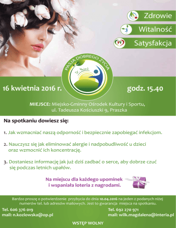 Zdrowie Witalność Satysfakcja 16 kwietnia 2016 r. godz. 15.40 MIEJSCE: Miejsko-Gminny Ośrodek Kultury i Sportu, ul. Tadeusza Kościuszki 9, Praszka Na spotkaniu dowiesz się: 1. Jak wzmacniać naszą odporność i bezpiecznie zapobiegać infekcjom. 2. Nauczysz się jak eliminować alergie i nadpobudliwość u dzieci oraz wzmocnić ich koncentrację. 3. Dostaniesz informację jak już dziś zadbać o serce, aby dobrze czuć się podczas letnich upałów. Na miejscu dla każdego upominek i wspaniała loteria z nagrodami. Bardzo proszę o potwierdzenie przybycia do dnia 10.04.2016 na jeden z podanych niżej numerów tel. lub adresów mailowych. Jest to gwarancja miejsca na spotkaniu. Tel. 606 376 019 mail: [email protected] Tel. 692 270 971 mail: [email protected] WSTĘP WOLNY