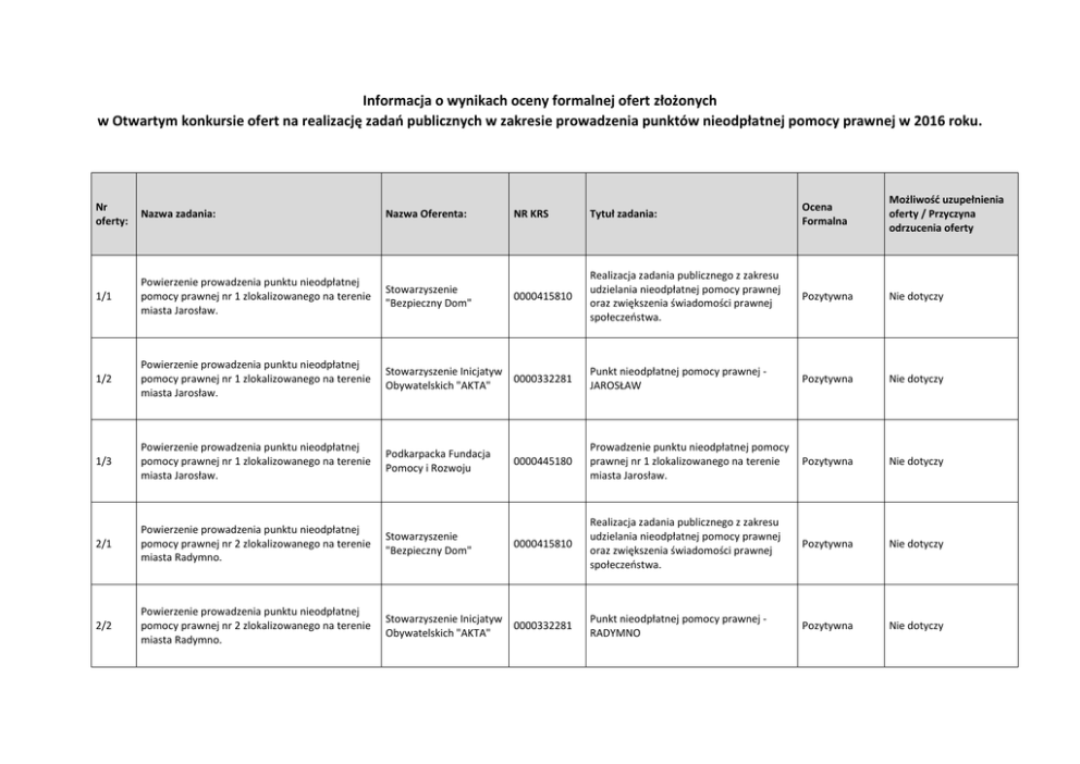 Informacja o wynikach oceny formalnej ofert złożonych w Otwartym konkursie ofert na realizację zadań publicznych w zakresie prowadzenia punktów nieodpłatnej pomocy prawnej w 2016 roku. NR KRS Tytuł zadania: Ocena Formalna Możliwość uzupełnienia oferty / Przyczyna odrzucenia oferty 0000415810 Realizacja zadania publicznego z zakresu udzielania nieodpłatnej pomocy prawnej oraz zwiększenia świadomości prawnej społeczeństwa. Pozytywna Nie dotyczy Stowarzyszenie Inicjatyw 0000332281 Obywatelskich "AKTA" Punkt nieodpłatnej pomocy prawnej JAROSŁAW Pozytywna Nie dotyczy Powierzenie prowadzenia punktu nieodpłatnej pomocy prawnej nr 1 zlokalizowanego na terenie miasta Jarosław. Podkarpacka Fundacja Pomocy i Rozwoju 0000445180 Prowadzenie punktu nieodpłatnej pomocy prawnej nr 1 zlokalizowanego na terenie miasta Jarosław. Pozytywna Nie dotyczy 2/1 Powierzenie prowadzenia punktu nieodpłatnej pomocy prawnej nr 2 zlokalizowanego na terenie miasta Radymno. Stowarzyszenie "Bezpieczny Dom" 0000415810 Realizacja zadania publicznego z zakresu udzielania nieodpłatnej pomocy prawnej oraz zwiększenia świadomości prawnej społeczeństwa. Pozytywna Nie dotyczy 2/2 Powierzenie prowadzenia punktu nieodpłatnej pomocy prawnej nr 2 zlokalizowanego na terenie miasta Radymno. Stowarzyszenie Inicjatyw 0000332281 Obywatelskich "AKTA" Punkt nieodpłatnej pomocy prawnej RADYMNO Pozytywna Nie dotyczy Nr oferty: Nazwa zadania: Nazwa Oferenta: 1/1 Powierzenie prowadzenia punktu nieodpłatnej pomocy prawnej nr 1 zlokalizowanego na terenie miasta Jarosław. Stowarzyszenie "Bezpieczny Dom" 1/2 Powierzenie prowadzenia punktu nieodpłatnej pomocy prawnej nr 1 zlokalizowanego na terenie miasta Jarosław. 1/3 2/3 Powierzenie prowadzenia punktu nieodpłatnej pomocy prawnej nr 2 zlokalizowanego na terenie miasta Radymno. Podkarpacka Fundacja Pomocy i Rozwoju 3/1 Powierzenie prowadzenia punktu nieodpłatnej pomocy prawnej nr 3 zlokalizowanego na terenie gmin: Chłopice, Laszki i Wiązownica. Polskie Stowarzyszenie na Rzecz Osób z Upośledzeniem Umysłowym Koło w Jarosławiu 3/2 Powierzenie prowadzenia punktu nieodpłatnej pomocy prawnej nr 3 zlokalizowanego na terenie gmin: Chłopice, Laszki i Wiązownica. Podkarpacka Fundacja Pomocy i Rozwoju 4 Zarząd Powiatu Jarosławskiego ogłasza otwarty konkurs ofert na realizację zadania publicznego z zakresu udzielania nieodpłatnej pomocy prawnej oaz zwiększania świadomości prawnej społeczeństwa Jarosław, 30 listopada 2015 roku. Stowarzyszenie "Nowa Kultura" 0000445180 Prowadzenie punktu nieodpłatnej pomocy prawnej nr 2 zlokalizowanego na terenie miasta Radymno. Pozytywna Nie dotyczy 0000010902 Powierzenie prowadzenia punktu nieodpłatnej pomocy prawnej nr 3 Pozytywna zlokalizowanego na terenie gmin: Chłopice, Laszki i Wiązownica Nie dotyczy 0000445180 Powierzenie prowadzenia punktu nieodpłatnej pomocy prawnej nr 3 Pozytywna zlokalizowanego na terenie gmin: Chłopice, Laszki i Wiązownica Nie dotyczy Ogłoszenie otwartego konkursu ofert na realizację zadań publicznych w zakresie prowadzenia punktów nieodpłatnej pomocy prawnej w 2016 r. Brak możliwości uzupełnienia oferty. Przyczyna odrzucenia: Oferent nie jest uprawniony do udziału w Konkursie. Nie spełnia warunku określonego w §3 ust. 2 pkt. 1 Ogłoszenia o konkursie. 0000296159 Negatywna. Oferta odrzucona.