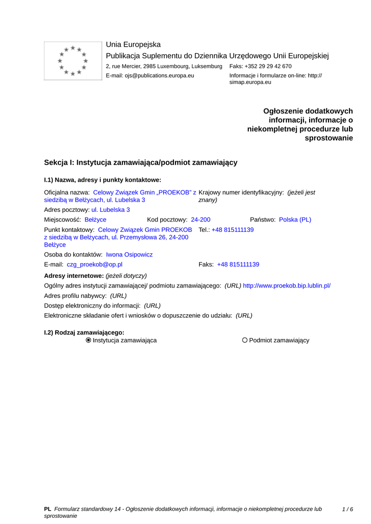 Unia Europejska Publikacja Suplementu do Dziennika Urzędowego Unii Europejskiej 2, rue Mercier, 2985 Luxembourg, Luksemburg Faks: +352 29 29 42 670 E-mail: [email protected] Informacje i formularze on-line: http:// simap.europa.eu Ogłoszenie dodatkowych informacji, informacje o niekompletnej procedurze lub sprostowanie Sekcja I: Instytucja zamawiająca/podmiot zamawiający I.1) Nazwa, adresy i punkty kontaktowe: Oficjalna nazwa: Celowy Związek Gmin „PROEKOB” z Krajowy numer identyfikacyjny: (jeżeli jest siedzibą w Bełżycach, ul. Lubelska 3 znany) _____ Adres pocztowy: ul. Lubelska 3 Miejscowość: Bełżyce Kod pocztowy: 24-200 Punkt kontaktowy: Celowy Związek Gmin PROEKOB z siedzibą w Bełżycach, ul. Przemysłowa 26, 24-200 Bełżyce Państwo: Polska (PL) Tel.: +48 815111139 Osoba do kontaktów: Iwona Osipowicz E-mail: [email protected] Faks: +48 815111139 Adresy internetowe: (jeżeli dotyczy) Ogólny adres instytucji zamawiającej/ podmiotu zamawiającego: (URL) http://www.proekob.bip.lublin.pl/ Adres profilu nabywcy: (URL) _____ Dostęp elektroniczny do informacji: (URL) _____ Elektroniczne składanie ofert i wniosków o dopuszczenie do udziału: (URL) _____ I.2) Rodzaj zamawiającego: Instytucja zamawiająca Podmiot zamawiający PL Formularz standardowy 14 - Ogłoszenie dodatkowych informacji, informacje o niekompletnej procedurze lub sprostowanie 1/6 Sekcja II: Przedmiot zamówienia II.1.1) Nazwa nadana zamówieniu: Budowa Zakładu Zagospodarowania Odpadów w m. Bełżyce dla potrzeb Celowego Związku Gmin PROEKOB z siedzibą w Bełżycach, ul. Lubelska 3 II.1.2) Krótki opis zamówienia lub zakupu: (podano w pierwotnym ogłoszeniu) Przedmiotem zamówienia jest budowa Zakładu Zagospodarowania Odpadów, spełniającego wymagania Najlepszej Dostępnej Techniki (BAT) wraz z budową i montażem linii technologicznych poszczególnych segmentów technologicznych Zakładu, dostawą maszyn budowlanych i transportowych, urządzeń i narzędzi eksploatacyjnych. Zakres zamówienia obejmuje w szczególności: 1.Wykonanie robót, polegających na budowie Zakładu Zagospodarowania Odpadów w skład, którego wchodzić będą następujące obiekty: I.Ob. nr 1 – Dyżurka wagowego, II.Ob. nr 2 – Waga samochodowa, o nośności 60 Mg, III.Ob. nr 3 – Miejsce parkingowe na sprzęt zakładowy - 3 miejsca, IV.Ob. nr 4 – Miejsce parkingowe dla samochodów osobowych - 12 miejsc, V.Ob. nr 5 – Trafostacja, VI.Ob. nr 6 – Separator koalescencyjny wraz z osadnikiem, VII.Ob. nr 7 – Zbiornik bezodpływowy na ścieki sanitarne, VIII.Ob. nr 8 – Zbiornik na ścieki deszczowe, IX.Ob. nr 8 a – Pompownia ścieków deszczowych, X.Ob. nr 9a – Hala sortowni odpadów komunalnych i opakowaniowych, XI.Ob. nr 9b – Zadaszona platforma przyjęć odpadów zmieszanych komunalnych, XII.Ob. nr 9c – Boks zadaszony na odpady opakowaniowe, XIII.Ob. nr 9d – Platforma przyjęć odpadów suchych, XIV.Ob. nr 9e – Boks zadaszony na odpady opakowaniowe, XV.Ob. nr 9f – Boks zadaszony na odpady opakowaniowe, XVI.Ob. nr 10 – Budynek administracyjno – socjalno – sanitarny, XVII.Ob. nr 11– Zadaszone boksy na odpady wielkogabarytowe, XVIII.Ob. nr 12 – Mobilny kontener na odpady niebezpieczne, XIX.Ob. nr 13 – Plac na osady ściekowe, odpady strukturalne i odpady zielone, XX.Ob. nr 14 a - Kompostownia w bioreaktorach, XXI.Ob. nr 14 b - Sterownia, XXII.Ob. nr 14 c - Plac dojrzewania stabilizatu, XXIII.Ob. nr 14d – Place na terenie kompostowni, XXIV.Ob. nr 14 e – Biofiltr, XXV.Ob. nr 15 – Plac tymczasowego deponowania ustabilizowanego materiału, XXVI.Ob. nr 16 – Warsztat naprawczy sprzętu zakładowego wraz z demontażem zużytego sprzętu elektrycznego i elektronicznego, XXVII.Ob. nr 17 – Zieleń ozdobna i trawa, XXVIII.Ob. nr 18 – Plac zieleni izolacyjnej, XXIX.Ob. nr 19 – Place i drogi utwardzone przystosowane do ruchu ciężkiego, XXX.Ob. nr 20 – Ogrodzenie, XXXI.Ob. nr 21 – Zbiornik na ścieki technologiczne, pochodzące z mycia posadzki PL Formularz standardowy 14 - Ogłoszenie dodatkowych informacji, informacje o niekompletnej procedurze lub sprostowanie 2/6 XXXII.Ob. nr 22 - Zbiornik na ścieki technologiczne, pochodzące z mycia posadzki z Ob. nr 13, Ob. nr 14a i Ob. nr 14c, XXXIII.Ob. nr 22 a – Pompownia ścieków z kompostowni, XXXIV.Ob. nr 23 – Zbiorniki na propan dla potrzeb Ob. nr 10 i Ob. nr 16, XXXV.Ob. nr 24 – Miejsca parkingowe dla gości – 4 miejsca, XXXVI.Ob. nr 25 – Zadaszony boks na zużyty sprzęt elektryczny i elektroniczny, XXXVII.Ob. nr 26 – Miejsce kruszenia odpadów budowlanych, XXXVIII.Ob. nr 27 – Zbiornik na wody odpadowe z zamkniętej czaszy kwatery – Ob. nr 106. XXXIX.Ob. nr 28 – Rów opaskowy, XL.Ob. nr 29 – Droga przeciwpożarowa. 2.Rozbiórka istniejących obiektów I.Ob. nr 101 - Brama wjazdowa, II.Ob. nr 102 - Ogrodzenie z siatki stalowej ocynkowanej , III.Ob. nr 103 – Portiernia, IV.Ob. nr 104 - Waga samochodowa, V.Ob. nr 105 - Brodzik dezynfekcyjny. 3.Roboty budowlano – montażowe związane z zamknięciem i rekultywacją istniejącej kwatery składowania odpadów innych niż niebezpieczne i obojętne. 4.Wykonanie przyłącza wodociągowego o długości L = ok. 2500 m, oraz przyłącza elektrycznego o długości L = ok. 1200 m. 5.Przygotowanie niezbędnych świadectw charakterystyki energetycznej dla wykonywanych obiektów. 6.Dokonanie dostaw i montażu maszyn oraz urządzeń wraz z wyposażeniem Zakładu. 7.Przeprowadzenie prób końcowych, czyli rozruch mechaniczny, technologiczny oraz eksploatacyjny Zakładu. 8.Przeszkolenie personelu Zamawiającego w zakresie eksploatacji instalacji technologicznej sortowni i kompostowni. 9.Dostarczenie kompletnej dokumentacji powykonawczej, instrukcji eksploatacji i konserwacji, dokumentacji techniczno – ruchowej (DTR), oceny ryzyka zawodowego dla pracowników zatrudnionych w Zakładzie. 10.Uzyskanie niezbędnych uzgodnień i pozwoleń, wynikających z przepisów prawa budowl