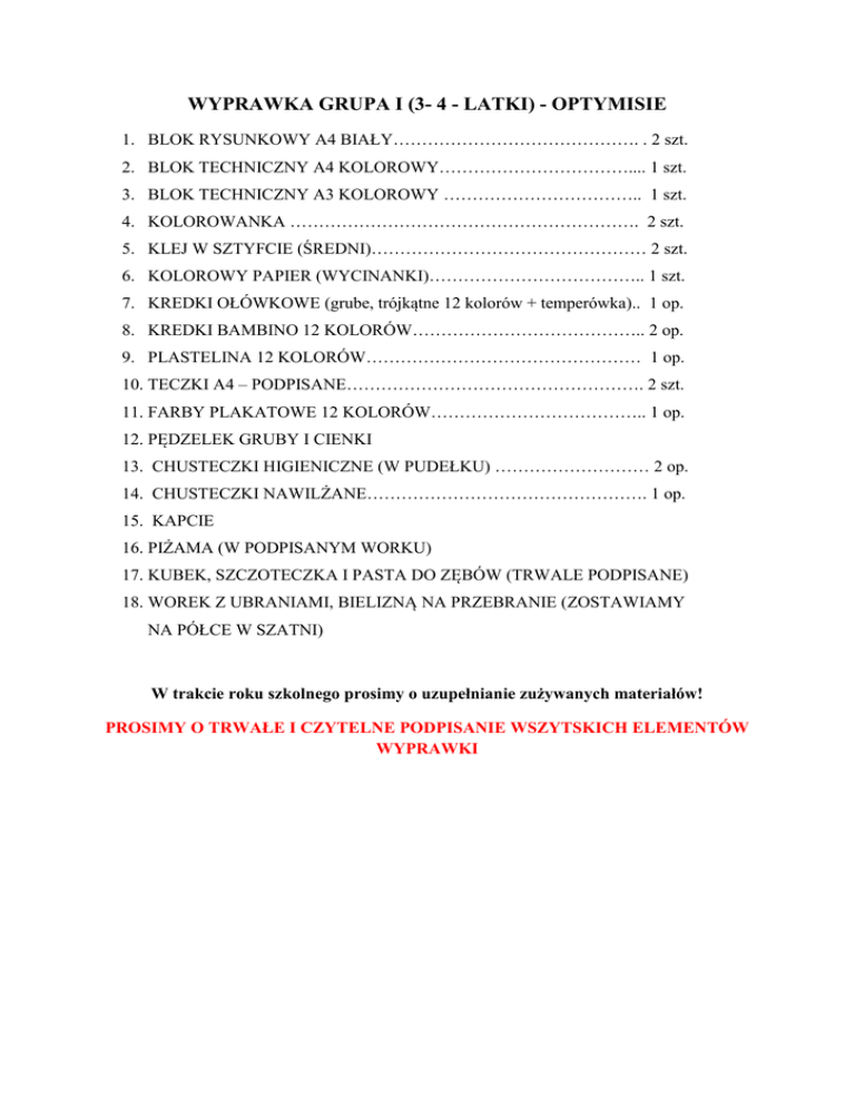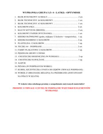 WYPRAWKA GRUPA I (3- 4 - LATKI) - OPTYMISIE 1. BLOK RYSUNKOWY A4 BIAŁY……………………………………. . 2 szt. 2. BLOK TECHNICZNY A4 KOLOROWY…………………………….... 1 szt. 3. BLOK TECHNICZNY A3 KOLOROWY …………………………….. 1 szt. 4. KOLOROWANKA ……………………………………………………. 2 szt. 5. KLEJ W SZTYFCIE (ŚREDNI)………………………………………… 2 szt. 6. KOLOROWY PAPIER (WYCINANKI)……………………………….. 1 szt. 7. KREDKI OŁÓWKOWE (grube, trójkątne 12 kolorów + temperówka).. 1 op. 8. KREDKI BAMBINO 12 KOLORÓW………………………………….. 2 op. 9. PLASTELINA 12 KOLORÓW………………………………………… 1 op. 10. TECZKI A4 – PODPISANE……………………………………………. 2 szt. 11. FARBY PLAKATOWE 12 KOLORÓW……………………………….. 1 op. 12. PĘDZELEK GRUBY I CIENKI 13. CHUSTECZKI HIGIENICZNE (W PUDEŁKU) ……………………… 2 op. 14. CHUSTECZKI NAWILŻANE…………………………………………. 1 op. 15. KAPCIE 16. PIŻAMA (W PODPISANYM WORKU) 17. KUBEK, SZCZOTECZKA I PASTA DO ZĘBÓW (TRWALE PODPISANE) 18. WOREK Z UBRANIAMI, BIELIZNĄ NA PRZEBRANIE (ZOSTAWIAMY NA PÓŁCE W SZATNI) W trakcie roku szkolnego prosimy o uzupełnianie zużywanych materiałów! PROSIMY O TRWAŁE I CZYTELNE PODPISANIE WSZYTSKICH ELEMENTÓW WYPRAWKI