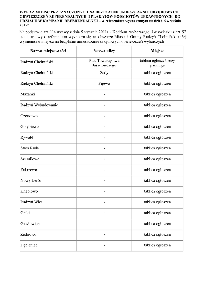 WYKAZ MIEJSC PRZEZNACZONYCH NA BEZPŁATNE UMIESZCZANIE URZĘDOWYCH OBWIESZCZEŃ REFERENDALNYCH I PLAKATÓW PODMIOTÓW UPRAWNIONYCH DO UDZIAŁU W KAMPANII REFERENDALNEJ – w referendum wyznaczonym na dzień 6 września 2015r Na podstawie art. 114 ustawy z dnia 5 stycznia 2011r. - Kodeksu wyborczego i w związku z art. 92 ust. 1 ustawy o referendum wyznacza się na obszarze Miasta i Gminy Radzyń Chełmiński niżej wymienione miejsca na bezpłatne umieszczanie urzędowych obwieszczeń wyborczych Nazwa miejscowości Nazwa ulicy Miejsce Radzyń Chełmiński Plac Towarzystwa Jaszczurczego tablica ogłoszeń przy parkingu Radzyń Chełmiński Sady tablica ogłoszeń Radzyń Chełmiński Fijewo tablica ogłoszeń Mazanki - tablica ogłoszeń Radzyń Wybudowanie - tablica ogłoszeń Czeczewo - tablica ogłoszeń Gołębiewo - tablica ogłoszeń Rywałd - tablica ogłoszeń Stara Ruda - tablica ogłoszeń Szumiłowo - tablica ogłoszeń Zakrzewo - tablica ogłoszeń Nowy Dwór - tablica ogłoszeń Kneblowo - tablica ogłoszeń Radzyń Wieś - tablica ogłoszeń Gziki - tablica ogłoszeń Gawłowice - tablica ogłoszeń Zielnowo - tablica ogłoszeń Dębieniec - tablica ogłoszeń