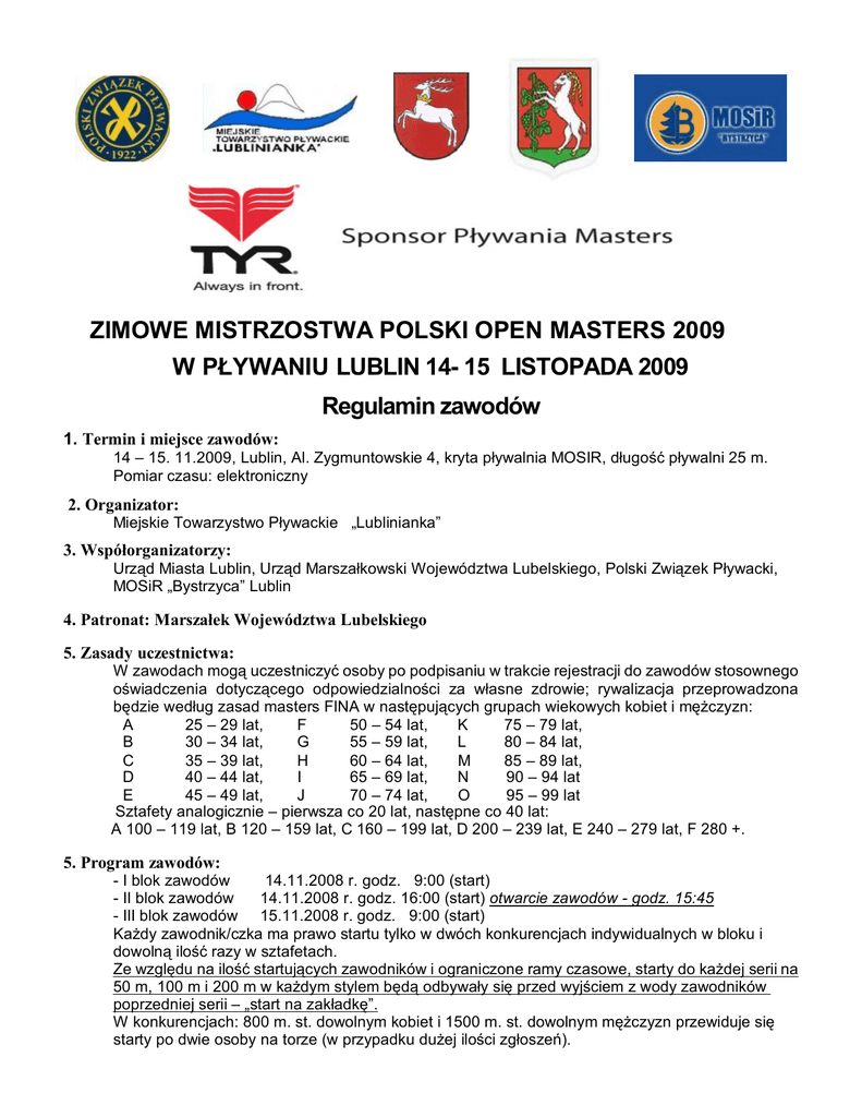ZIMOWE MISTRZOSTWA POLSKI OPEN MASTERS 2009 W PŁYWANIU LUBLIN 14- 15 LISTOPADA 2009 Regulamin zawodów 1. Termin i miejsce zawodów: 14 – 15. 11.2009, Lublin, Al. Zygmuntowskie 4, kryta pływalnia MOSIR, długość pływalni 25 m. Pomiar czasu: elektroniczny 2. Organizator: Miejskie Towarzystwo Pływackie „Lublinianka” 3. Współorganizatorzy: Urząd Miasta Lublin, Urząd Marszałkowski Województwa Lubelskiego, Polski Związek Pływacki, MOSiR „Bystrzyca” Lublin 4. Patronat: Marszałek Województwa Lubelskiego 5. Zasady uczestnictwa: W zawodach mogą uczestniczyć osoby po podpisaniu w trakcie rejestracji do zawodów stosownego oświadczenia dotyczącego odpowiedzialności za własne zdrowie; rywalizacja przeprowadzona będzie według zasad masters FINA w następujących grupach wiekowych kobiet i mężczyzn: A 25 – 29 lat, F 50 – 54 lat, K 75 – 79 lat, B 30 – 34 lat, G 55 – 59 lat, L 80 – 84 lat, C 35 – 39 lat, H 60 – 64 lat, M 85 – 89 lat, D 40 – 44 lat, I 65 – 69 lat, N 90 – 94 lat E 45 – 49 lat, J 70 – 74 lat, O 95 – 99 lat Sztafety analogicznie – pierwsza co 20 lat, następne co 40 lat: A 100 – 119 lat, B 120 – 159 lat, C 160 – 199 lat, D 200 – 239 lat, E 240 – 279 lat, F 280 +. 5. Program zawodów: - I blok zawodów 14.11.2008 r. godz. 9:00 (start) - II blok zawodów 14.11.2008 r. godz. 16:00 (start) otwarcie zawodów - godz. 15:45 - III blok zawodów 15.11.2008 r. godz. 9:00 (start) Każdy zawodnik/czka ma prawo startu tylko w dwóch konkurencjach indywidualnych w bloku i dowolną ilość razy w sztafetach. Ze względu na ilość startujących zawodników i ograniczone ramy czasowe, starty do każdej serii na 50 m, 100 m i 200 m w każdym stylem będą odbywały się przed wyjściem z wody zawodników poprzedniej serii – „start na zakładkę”. W konkurencjach: 800 m. st. dowolnym kobiet i 1500 m. st. dowolnym mężczyzn przewiduje się starty po dwie osoby na torze (w przypadku dużej ilości zgłoszeń). 1 dzień 14.11.2009 - I blok przed południem 1. 3. 5. 7. 9. 11. 13. 15. Rozgrzewka w godzinach od 8.00. do 8.50. Kobiety Mężczyźni 50 m st. dowolnym kobiet 2. 50 m st. dowolnym mężczyzn 50 m st. klasycznym kobiet 4. 50 m st. klasycznym mężczyzn 100 m st. motylkowym kobiet 6. 100 m st. motylkowym mężczyzn 200 m st. dowolnym kobiet 8. 200 m st. dowolnym mężczyzn 200 m st. grzbietowym kobiet 10. 200 m st. grzbietowym mężczyzn 400 m st. zmiennym kobiet 12. 400 m st. zmiennym mężczyzn 4 x 50 m st. dowolnym kobiet 14. 4 x 50 m st. dowolnym mężczyzn 4 x 50 m st. zmiennym MIX 1 dzień 14.11.2009 - II blok po południu 16. 18. 20. 22. 24. 26. 27. Rozgrzewka w godzinach od 15.00. do 15.40. Kobiety Mężczyźni 200 m st. zmiennym kobiet 17. 200 m st. zmiennym mężczyzn 50 m st. motylkowym kobiet 19. 50 m st. motylkowym mężczyzn 50 m st. grzbietowym kobiet 21. 50 m st. grzbietowym mężczyzn 200 m st. klasycznym kobiet 23. 200 m st. klasycznym mężczyzn 4 x 50 m st. zmiennym kobiet 25. 4 x 50 m st. zmiennym mężczyzn 4 x 50 m st. dowolnym MIX 800 m st. dowolnym kobiet 28. 1500 m st. dowolnym mężczyzn 2 dzień 15.11.2009 – III blok przed południem 29. 31. 33. 35. 37. 39. Rozgrzewka w godzinach od 8.00. do 8.50. Kobiety Mężczyźni 200 m st. motylkowym kobiet 30. 200 m st. motylkowym mężczyzn 100 m st. dowolnym kobiet 32. 100 m st. dowolnym mężczyzn 100 m st. grzbietowym kobiet 34. 100 m st. grzbietowym mężczyzn 100 m st. klasycznym kobiet 36. 100 m st. klasycznym mężczyzn 100 m st. zmiennym kobiet 38. 100 m st. zmiennym mężczyzn 400 m st. dowolnym kobiet 40. 400 m st. dowolnym mężczyzn 6. Przepisy techniczne - długość pływalni 25m, 6 torów. - pomiar czasu – elektroniczny, - system zawodów – seriami na czas, - przepisy pływania wg FINA Masters 7. Zgłoszenia Zgłoszenia w formie LENEX File (program Entry Editor – do pobrania i zainstalowania na stronie: http://www.splash-software.ch) lub na załączonym wzorze zgłoszenia imiennego należy przesłać elektronicznie na adres: [email protected] (do czego bardzo zachęcamy) lub listownie na adres: MTP „Lublinianka”, Al. Zygmuntowskie 4, 20-133 Lublin; w terminie do 2 listopada 2009 r. Zaproszenie w formacie LENEX File do pobrania na stronie internetowej http://www.mp.masters.lublin.pl/ lub Masters Polska - http://www.masters.kania.opole.pl/. Wszyscy uczestnicy mają prawo do dwóch startów w każdym bloku. Dodatkowe starty, poza konkursem, po dokonaniu dodatkowej opłaty. Starty na dystansach 800 m i 1500 m st. dowolnym należy potwierdzić osobiście w sekretariacie zawodów (na pływalni) do godz. 12.00 - 14.11.2009 r. 8. Proponowane przez Organizatora zakwaterowanie i wyżywienia: - propozycje zakwaterowania i wynegocjowane przez organizatora ceny (należy osobiście dokonywać rezerwacji i zamówień): 1. Hotel „Huzar” Lublin, ul. Spadochroniarzy 7; www.hotelhuzar.pl, 50 miejsc w pokojach 2 - osobowych w cenach 65 zł/doba/osoba (bez śniadania) na hasło MP Masters 2. Hotel Orbis Accor Mercure Lublin tel.: +48 (0) 81 533 20 61 ceny na hasło masters: 160pln dwójka ze śniadaniem 140pln jedynka ze śniadaniem 9. Nagrody: medale i dyplomy za trzy pierwsze miejsca w każdej konkurencji indywidualnej, dyplomy za pierwsze trzy miejsca w każdej konkurencji sztafetowej. 10. Zasady finansowania: - koszty organizacyjne pokrywa organizator. - koszty uczestnictwa ponoszą uczestnicy: a) opłata startowa dla zawodników zrzeszonych 60 zł od każdego zawodnika płatna b) do 2.11.2009 przelewem na konto: Lukas Bank O/Lublin 52 1940 1076 3021 6183 0000 0000, Po tym terminie opłata startowa w wysokości 80 zł płatna na miejscu. c) opłata startowa dla zawodników niezrzeszonych 70 zł od każdego zawodnika płatna do 2.11.2009 przelewem na konto: Lukas Bank O/Lublin 52 1940 1076 3021 6183 0000 0000, Po tym terminie opłata startowa w wysokości 90 zł płatna na miejscu. d) dodatkowa opłata od każdego zawodnika to 10 zł (obowi