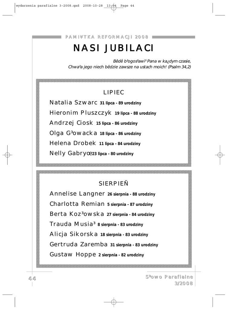 wydarzenia parafialne 3-2008.qxd 2008-10-28 13:54 Page 44 PA M I ¥T K A R E F O R M A C J I 2 0 0 8 NASI JUBILACI Bêdê b³ogos³awi³ Pana w ka¿dym czasie, Chwa³a jego niech bêdzie zawsze na ustach moich! (Psalm 34,2) LIPIEC Natalia Szwarc 31 lipca - 89 urodziny Hieronim Pluszczyk Andrzej Ciosk 19 lipca - 88 urodziny 15 lipca - 86 urodziny Olga G³owacka 18 lipca - 86 urodziny Helena Drobek 11 lipca - 84 urodziny Nelly Gabryœ 23 lipca - 80 urodziny SIERPIEÑ Annelise Langner 26 sierpnia - 88 urodziny Charlotta Remian 5 sierpnia - 87 urodziny Berta Koz³owska 27 sierpnia - 84 urodziny Trauda Musia³ 8 sierpnia - 83 urodziny Alicja Sikorska 18 sierpnia - 83 urodziny Gertruda Zaremba Gustaw Hoppe 44 31 sierpnia - 83 urodziny 2 sierpnia - 82 urodziny S³owo Parafialne 3/2008 wydarzenia parafialne 3-2008.qxd 2008-10-28 13:54 Page 45 I N F O R M AT O R WRZESIEÑ Gertruda Wójcicka 1 wrzeœnia - 97 urodziny Zofia Ma³o¿ewska 19 wrzeœnia - 86 urodziny Jan Essel 2 wrzeœnia - 81 urodziny Anna Leœniak 18 wrzeœnia - 81 urodzin Ewa Kudela 17 wrzeœnia - 80 urodziny PAZDZIERNIK Berta Fiebig 13 paŸdziernika - 96 urodziny Wanda Wójcicka 17 paŸdziernika - 89 urodziny Elza Hryniewiecka Frida Hoppe 8 paŸdziernika - 85 urodziny 27 paŸdziernika - 85 urodziny Eugenia Baryliñska 18 paŸdziernika - 83 urodziny Karin Hebrowska 13 paŸdziernika - 82 urodziny Irena Andrzejczyk 4 paŸdziernika - 81 urodziny Halina Schmidt 17 paŸdziernika - 80 urodziny Drogim Jubilatom wiele zdrowia, radoœci i Bo¿ego b³ogos³awieñstwa na ka¿dy dzieñ ¿ycz¹ Duszpasterze, Rada Parafialna oraz Redakcja S³owa Parafialnego S³owo Parafialne 3/2008 45 wydarzenia parafialne 3-2008.qxd 2008-10-28 13:54 Page 46 PA M I ¥T K A R E F O R M A C J I 2 0 0 8 CHRZEST Œ WIÊTY P RZYJÊ£A Anna Aleksandra LENART ur. 22 lutego 2008 r. we Wroc³awiu chrzest: 31 sierpnia 2008 r. W Z WI¥ZEK M A£¯EÑSKI WST¥PILI CIEŒLAR Ewa Dorota ISSEL Bartosz 12 lipca 2008 r. GÓRKA Anna Agnieszka MAJCHRZAK Maciej Bogus³aw 26 lipca 2008 r. CELUCH Anna Ewa STAWOWSKA Bogus³aw Dariusz 6 wrzeœnia 2008 r. POSPISZY³ Marta KARPUK Rados³aw 11 paŸdziernika 2008 r. Albowiem dok¹d ty pójdziesz i ja pójdê; gdzie ty zamieszkasz i ja zamieszkam; lud twój lud mój, a Bóg twój - Bóg mój (Ksiêga Rut 1,16) 46 S³owo Parafialne 3/2008 wydarzenia parafialne 3-2008.qxd 2008-10-28 13:54 Page 47 I N F O R M AT O R Z ¯ A£OBNEJ K ARTY ŒP. Jerzy Witold ŒP. Anna Gertruda BURCHARDT GRZEŒKOWIAK ur. 23 sierpnia 1932 r. w Zielonej Wsi ur. 15 wrzeœnia 1022 r. w Chur (Szwajcaria) zm. 14 lipca 2008 r. w Gorzeszowie zm. 29 sierpnia 2008 r. we Wroc³awiu POD KRZY¯EM Co niemo¿liwe jest u ludzi, to mo¿liwe jest u Boga. £k 18, 27 Poeta klêcza³ u stóp Krzy¿a, czo³em przyleg³ do gleby. Raniony tragizmem ¿ycia, którego nie móg³ przemóc, poskar¿y³ siê i w rozpaczy zawo³a³: Chryste, ratuj! Uciszy³ siê, zawstydzi³. Rzecz zwyczajna a Bo¿y Syn Cierpi ukrzy¿owany… Dos³ysza³ G³os: Ju¿ ci pomog³em. Powsta³, z d³oñmi na piersi pok³oni³ siê i odszed³. * Aniele Muzo, wdziêczny jestem za udzia³ w utworze. Leon Krzemieniecki (2001) S³owo Parafialne 3/2008 47 wydarzenia parafialne 3-2008.qxd 2008-10-28 13:54 Page 48 PA M I ¥T K A R E F O R M A C J I 2 0 0 8 NA KA¯DY DZIEÑ Nie powinno byæ ¿adnego dnia, W którym musia³byœ powiedzieæ: "Tu nie ma nikogo, kto mnie trzyma" Nie powinno byæ ¿adnego dnia, W którym musia³byœ powiedzieæ: "Tu nie ma nikogo, kto mnie chroni" Nie powinno byæ ¿adnego dnia, W którym musia³byœ powiedzieæ: "Tu nie ma nikogo, kto mnie kocha" Przy Tobie jest Jezus - dzisiaj, jutro I ka¿dego nowego dnia. Jezus Chrystus mówi: “Dana mi jest wszelka moc na niebie i na ziemi. A oto ja jestem z wami po wszystkie dni a¿ do skoñczenia œwiata”. (Mt 28, 18 i 20), Autor nieznany. T³umaczy³ ks. Jan Krzywoñ Hannover 21 czerwca 2008 S£OWO PARAFIALNE Parafii Ewangelicko-Augsburskiej we Wroc³awiu, ul. Kazimierza Wielkiego 29, 50-077 Wroc³aw tel.: (+71) 34 34 730, fax: (+71) 37 23 748 e-mail: [email protected] Redaktor: Marcin Orawski, Redakcja Techniczna: Marcin Orawski, K¹cik dla Dzieci: Iwona Orawska, Projekt i sk³ad ok³adki: Grzegorz Mieczkowski Korekta: Irena Margonasz, Iwona Orawska 48 S³owo Parafialne 3/2008