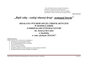 „Być człowiekiem znaczy posiadać kryształową moralność, nieograniczoną tolerancyjność, do pasji posuniętą pracowitość, dążyć do ciągłego uzupełniania swego wykształcenia, pomagać innym." Janusz Korczak „Bądź sobą - szukaj własnej drogi - pomagaj innym" DZIAŁANIA WYCHOWAWCZE I PROFILAKTYCZNE W ZESPOLE SZKÓŁ Z ODDZIAŁAMI INTEGRACYJNYMI im. Janusza Korczaka w Smólniku w roku szkolnym 2016/2017 Podstawa prawna: Szkoła realizuje cele wychowawcze wynikające z: Konstytucji Rzeczypospolitej Polskiej, Powszechnej Deklaracji Praw Człowieka, Konwencji Praw Dziecka, Ustawy o Systemie Oświaty, Kierunków polityki oświatowej państwa w roku szkolnym 2016/2017, Programu Wychowawczego i Programu Profilaktyki. Zespół Szkół z Oddziałami Integracyjnymi im. Janusza Korczaka w Smólniku Strona 1 Wstęp: Naszym głównym celem w roku szkolnym 2016-2017 jest promowanie modelu szkoły, która w swoich działaniach wychowawczych i edukacyjnych dąży do kształtowania wśród uczniów otwartej i prospołecznej postawy oraz wspiera ich aktywność obywatelską, a także umiejętność pracy zespołowej. CELE PROGRAMU Cele główne: Kształtowanie postaw: Wychowanie do wartości, kształtowanie postawy obywatelskiej i patriotycznej. Szkoła wspomaga rozwój uczniów dostosowany do ich indywidualnych sytuacji. Wsparcie wszystkich uczniów ze szczególnym uwzględnieniem dzieci ze specjalnymi potrzebami edukacyjnymi w adaptacji szkolnej oraz podejmowanie działań wspierających, włączających i profilaktycznych na rzecz wszechstronnego rozwoju osobowości ucznia. Edukacja na rzecz bezpieczeństwa uczniów – bezpieczny uczeń w szkole. Kształtowanie postaw angażowania się w pomoc innym. Zespół Szkół z Oddziałami Integracyjnymi im. Janusza Korczaka w Smólniku Strona 2 Cele szczegółowe: Kształtowanie tożsamości narodowej, szacunku do historii, kultury i tradycji, postawy patriotyzmu (szacunku do symboli narodowych). Wyposażanie uczniów w umiejętności niezbędne do przygotowania się do życia w rodzinie, w społeczności lokalnej i w demokratycznym państwie, zgodnie z przekazem tradycji kulturowej i poczucia więzi z otoczeniem społecznym (rodzina, środowisko lokalne, region, państwo). Wyposażenie uczniów w społecznie akceptowany system wartości, wśród których fundament stanowią: odpowiedzialność, poczucie własnej wartości, wytrwałość, uczciwość, szacunek do innych ludzi, wiarygodność, ciekawość poznawcza, kultura osobista, gotowość do uczestniczenia w kulturze, podejmowanie inicjatyw i praca zespołowa, tolerancja, życzliwość, prawda, miłość. Rozwijanie kompetencji wychowawczych umożliwiających tworzenie zdrowego i bezpiecznego środowiska w szkole. Wspieranie uczniów ze specjalnymi potrzebami edukacyjnymi w zależności od ich indywidualnych sytuacji. Inspirowanie uczniów do rozwijania własnych zainteresowań, pasji i własnej twórczości Rozpoznawanie i określanie możliwości szkoły w kontekście potrzeb dziecka. Kształtowanie motywacji i dociekliwości, jako podstawy do pracy nad sobą, odkrywania osobistych możliwości i deficytów. Kształtowanie motywacji i umiejętności niezbędnych do samodzielnego poszukiwania ważnych dla siebie wartości, do hierarchizacji i dokonywania wyborów w każdej sytuacji oraz konstruktywnego, realistycznego określania osobistych celów życiowych, ważnych dla odnalezienia własnego miejsca w świecie. Zwracanie szczególnej uwagi na aspekty zdrowia i bezpieczeństwa w swojej codziennej pracy i innych przedsięwzięciach. Budowanie strategii pracy z dzieckiem przejawiającym zaburzenia zachowania w środowisku szkolnym i rodzinnym. Promowanie działań sprzyjających podejmowaniu działań na rzecz zdrowia własnego i innych ludzi oraz tworzenie zdrowego środowiska. Wypracowywanie reguł bezpiecznego i kulturalnego korzystania z sieci oraz zasad reagowania w sytuacjach cyberprzemocy. Umożliwienie uczniowi zrozumienia przyczyn zachowania agresywnego i poznania sposobów obrony przed agresją, cyberprzemocą. Rozwiązywanie sytuacji problemowych oraz konfliktowych przez negocjowanie, odmowę asertywną z poszanowaniem praw drugiego człowieka. Kształtowanie umiejętności brania na siebie odpowiedzialności za siebie i za efekty swojego postępowania wobec innych. Promowanie zdrowego stylu życia: profilaktyka uzależnień, zgubna moc nałogów, właściwe odżywianie, zdrowie psychiczne. Budowanie dobrej współpracy z rodzicami i pozyskiwanie ich jako sojuszników działań wychowawczych i profilaktycznych prowadzonych przez nauczycieli. Zapewnianie wsparcia dla rodziców i opiekunów dziecka. Zespół Szkół z Oddziałami Integracyjnymi im. Janusza Korczaka w Smólniku Strona 3 Doradztwo zawodowe. Rozwijanie kompetencji czytelniczych wśród dzieci i młodzieży Rozbudzanie zainteresowań matematyczno – przyrodniczych poprzez aktywne nauczanie, lekcje w terenie. Wskazywanie przydatności wiedzy w życiu codziennym. Rozwijanie kompetencji informatycznych PRIORYTETY W ROKU SZKOLNYM 2016/2017: 1. Upowszechnianie czytelnictwa, rozwijanie kompetencji czytelniczych wśród dzieci i młodzieży. 2. Rozwijanie kompetencji informatycznych dzieci i młodzieży. 3. Kształtowanie postaw. Wychowanie do wartości. 4. Rok 2016/2017 rokiem wolontariatu. 5. Bezpieczny uczeń w szkole: Przeciwdziałanie agresji i przemocy. Przeciwdziałanie uzależnieniom. Promocja bezpieczeństwa podczas drogi do i ze szkoły. Promocja zdrowego stylu życia. Promocja bezpieczeństwa w sieci. 6. „ Bądź sobą – szukaj własnej drogi – pomagaj innym” Kształtowanie wśród uczniów postaw patriotycznych i aktywności obywatelskiej. Dobrowolne i świadome angażowanie się w działania na rzecz innych ludzi. Zespół Szkół z Oddziałami Integracyjnymi im. Janusza Korczaka w Smólniku Strona 4 Harmonogram działań ZADANIA Kultywowanie tradycji i rozwijanie kompetencji patriotycznych, hi