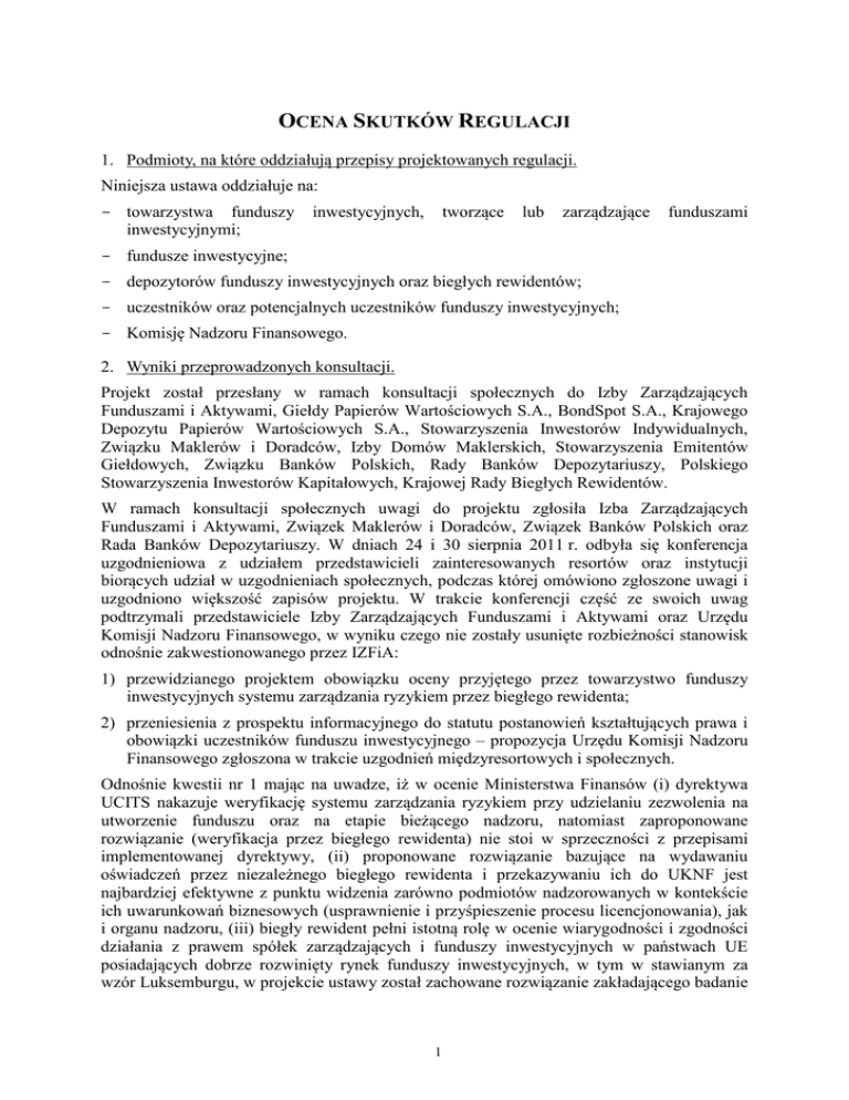 OCENA SKUTKÓW REGULACJI 1. Podmioty, na które oddziałują przepisy projektowanych regulacji. Niniejsza ustawa oddziałuje na: - towarzystwa funduszy inwestycyjnymi; inwestycyjnych, tworzące lub zarządzające funduszami - fundusze inwestycyjne; - depozytorów funduszy inwestycyjnych oraz biegłych rewidentów; - uczestników oraz potencjalnych uczestników funduszy inwestycyjnych; - Komisję Nadzoru Finansowego. 2. Wyniki przeprowadzonych konsultacji. Projekt został przesłany w ramach konsultacji społecznych do Izby Zarządzających Funduszami i Aktywami, Giełdy Papierów Wartościowych S.A., BondSpot S.A., Krajowego Depozytu Papierów Wartościowych S.A., Stowarzyszenia Inwestorów Indywidualnych, Związku Maklerów i Doradców, Izby Domów Maklerskich, Stowarzyszenia Emitentów Giełdowych, Związku Banków Polskich, Rady Banków Depozytariuszy, Polskiego Stowarzyszenia Inwestorów Kapitałowych, Krajowej Rady Biegłych Rewidentów. W ramach konsultacji społecznych uwagi do projektu zgłosiła Izba Zarządzających Funduszami i Aktywami, Związek Maklerów i Doradców, Związek Banków Polskich oraz Rada Banków Depozytariuszy. W dniach 24 i 30 sierpnia 2011 r. odbyła się konferencja uzgodnieniowa z udziałem przedstawicieli zainteresowanych resortów oraz instytucji biorących udział w uzgodnieniach społecznych, podczas której omówiono zgłoszone uwagi i uzgodniono większość zapisów projektu. W trakcie konferencji część ze swoich uwag podtrzymali przedstawiciele Izby Zarządzających Funduszami i Aktywami oraz Urzędu Komisji Nadzoru Finansowego, w wyniku czego nie zostały usunięte rozbieżności stanowisk odnośnie zakwestionowanego przez IZFiA: 1) przewidzianego projektem obowiązku oceny przyjętego przez towarzystwo funduszy inwestycyjnych systemu zarządzania ryzykiem przez biegłego rewidenta; 2) przeniesienia z prospektu informacyjnego do statutu postanowień kształtujących prawa i obowiązki uczestników funduszu inwestycyjnego – propozycja Urzędu Komisji Nadzoru Finansowego zgłoszona w trakcie uzgodnień międzyresortowych i społecznych. Odnośnie kwestii nr 1 mając na uwadze, iż w ocenie Ministerstwa Finansów (i) dyrektywa UCITS nakazuje weryfikację systemu zarządzania ryzykiem przy udzielaniu zezwolenia na utworzenie funduszu oraz na etapie bieżącego nadzoru, natomiast zaproponowane rozwiązanie (weryfikacja przez biegłego rewidenta) nie stoi w sprzeczności z przepisami implementowanej dyrektywy, (ii) proponowane rozwiązanie bazujące na wydawaniu oświadczeń przez niezależnego biegłego rewidenta i przekazywaniu ich do UKNF jest najbardziej efektywne z punktu widzenia zarówno podmiotów nadzorowanych w kontekście ich uwarunkowań biznesowych (usprawnienie i przyśpieszenie procesu licencjonowania), jak i organu nadzoru, (iii) biegły rewident pełni istotną rolę w ocenie wiarygodności i zgodności działania z prawem spółek zarządzających i funduszy inwestycyjnych w państwach UE posiadających dobrze rozwinięty rynek funduszy inwestycyjnych, w tym w stawianym za wzór Luksemburgu, w projekcie ustawy został zachowane rozwiązanie zakładającego badanie 1 przez biegłego rewidenta przyjętych przez towarzystwo funduszy inwestycyjnych zasad zarządzania ryzykiem. Jednocześnie w celu minimalizacji kosztów tego rozwiązania, wprowadzone zostały odpowiednie modyfikacje zakładające zmniejszenie częstotliwości przeprowadzania oceny, czy też zakresu kolejnych ocen. W zakresie rozbieżności nr 2 Ministerstwo Finansów mając na uwadze istniejące ryzyko prawne uznania prospektu informacyjnego za wzorzec umowny w rozumieniu przepisów Kodeksu Cywilnego, wynikające z zawarcia w tym dokumencie szeregu postanowień kształtujących prawa i obowiązki uczestników funduszu inwestycyjnego, wbrew opinii IZFiA przyjęło propozycję UKNF. 3. Wpływ regulacji na sektor finansów publicznych, w tym budżet państwa i budżety jednostek samorządu terytorialnego. Wejście w życie ustawy nie wpłynie na sektor finansów publicznych. Projektowana ustawa nie wiąże się z obciążeniami budżetu państwa oraz budżetów jednostek samorządu terytorialnego. Jednocześnie należy zauważyć, iż projektowane zmiany polegające na wprowadzeniu nowych ram prawnych dla połączeń funduszy inwestycyjnych oraz transgranicznego modelu funduszy podstawowych oraz powiązanych wiązać się będzie z poszerzeniem zakresu obowiązków Komisji Nadzoru Finansowego związanych z „licencjonowaniem” tych procesów, należy jednak zauważyć, iż koszty z tym związane powinny zostać zrównoważone poprzez opłaty ponoszone na rzecz Komisji przez podmioty występujące o nowe zezwolenia. 4. Wpływ regulacji na konkurencyjność gospodarki i przedsiębiorczość, w tym na funkcjonowanie przedsiębiorstw. Przewidziana projektem uproszczona procedura notyfikacji zamiaru zbywania na terytorium państwa goszczącego tytułów uczestnictwa funduszu inwestycyjnego ułatwi transgraniczne zbywanie krajowych funduszy inwestycyjnych otwartych, jak również zagranicznych funduszy inwestycyjnych typu UCITS w Polsce. Zmiana ta zlikwiduje jednocześnie zidentyfikowane na etapie uzgadniania przepisów implementowanej dyrektywy, bariery administracyjne w dostępie funduszy typu UCITS do rynków innych państw członkowskich. Wprowadzenie zmiany polegającej na umożliwieniu zagranicznym spółkom zarządzającym jak i polskim towarzystwom funduszy inwestycyjnych prowadzenia działalności transgranicznej na zasadzie jednolitego paszportu, powinno przyczynić się do redukcji kosztów związanych z procesem zarządzania funduszami inwestycyjnymi typu UCITS. Dzięki tej zmianie rynek funduszy inwestycyjnych będzie oferował inwestorom europejskim większy wybór funduszy osiągających lepsze wyniki. Do obniżenia kosztów funkcjonowania funduszy typu UCITS oraz uproszczenia procesu powinno przyczynić się również wprowadzenie nowych ram prawnych dla poł
