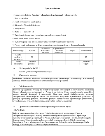 Opis przedmiotu 1. Nazwa przedmiotu: Podstawy ubezpieczeń społecznych i zdrowotnych 2. Kod przedmiotu: 3. Język wykładowy: język polski 4. Kierunek: Zdrowie Publiczne 5. Specjalność: 6. Rok: II Semestr: III 7. Tytuł/stopień oraz imię i nazwisko prowadzącego przedmiot: Dr hab. nauk med. Teresa Kokot 8. Tytuły/stopnie oraz imiona i nazwiska pozostałych członków zespołu: 9. Formy zajęć wchodzące w skład przedmiotu, wymiar godzinowy, forma zaliczenia: Forma zajęć Liczba godzin w semestrze Forma zaliczenia Wykład Ćwiczenia/ Ćwiczenia tablicowe Laboratorium/ Ćwiczenia praktyczne Projekt Seminarium 30 15 Zaliczenie pisemne Ocenianie ciągłe 10. Liczba punktów ECTS: 3 11. Poziom (podstawowy/zaawansowany): 12. Wymagania wstępne: Posiadanie minimum wiedzy na temat ubezpieczenia społecznego i zdrowotnego, rozumienie definicji ubezpieczenie społeczne oraz zabezpieczenie społeczne. 13. Cele kształcenia: Nabycie i pogłębienie wiedzy na temat ubezpieczeń społecznych i zdrowotnych. Poznanie historii ubezpieczeń społecznych w Polsce i na świecie (form początkowych, kierunków zmian, nowych koncepcji i rozwiązań). Nauczanie zasad funkcjonowania systemu ubezpieczenia społecznego w Polsce i na świecie w połączeniu z potrzebami gospodarki i polityką społeczną państwa. Poznanie pionów ubezpieczenia społecznego (chorobowe, wypadkowe, na wypadek bezrobocia, emerytalno-rentowe, rodzinne) 14. Opis treści kształcenia w ramach poszczególnych form zajęć: 14.1. Wykład: Pojęcie zabezpieczenia społecznego. Pojęcie ubezpieczenia społecznego. Funkcje ubezpieczeń społecznych. Rozwój ubezpieczenia społecznego w świecie. Organizacja systemu ubezpieczeń społecznych w Polsce.Instytucje ubezpieczeń - źródła, zasady i reguły finansowania. Ubezpieczenia społeczne w skali międzynarodowej (Międzynarodowa Organizacja Pracy, Międzynarodowe Stowarzyszenie Zabezpieczenia Społecznego, Rada Europy, Unia Europejska, umowy międzynarodowe) 1 14.2. Seminarium: 1.Zapoznanie się z zagadnieniami ogólnymi: pojęcie ubezpieczenia społecznego, prawo ubezpieczenia społecznego, powstanie idei zabezpieczenia społecznego 2. Powstanie ubezpieczenia społecznego i jego podstawowy model. Powstanie systemu zaopatrzenia społecznego. 3. Ubezpieczenia społeczne w Polsce i na świecie 4.Repartycja i kapitalizacja. Waloryzacja i prywatyzacja. 15. Literatura podstawowa: 1.Muszalski W., Ubezpieczenia społeczne. Podręcznik akademicki. Wyd.Naukowe PWN, Warszawa, 2004 2.Wańtoch-Rekowski J., Ustawa o systemie ubezpieczeń społecznych. Komentarz 3.Włodarczyk C., Reformy zdrowotne. Uniwersalny kłopot.Kraków,2003 4.Czupryna A., Paździoch s., Zdrowie publiczne .Kraków,2001 16. Literatura towarzysząca: 1.Świątkowski A.M.,Europejskie prawo socjalne,t.III: Europejskie prawo ubezpieczeń społecznych,Warszawa,2000. 2. Jędrasik-Jankowska I., Ubezpieczenia wypadkowe i chorobowe,Warszawa,2002 3.Zeszyty ubezpieczeń społecznych.ISSN 1734-4980 (wrzesień 2008- maj 2009) 2