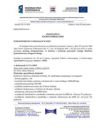 ZNAK: PN-11-2010 Kraków, dnia 05 maja 2009 r. IMIM/DOP/1014/10 WYKONAWCY, KTÓRZY POBRALI SIWZ POWIADOMIENIE O ZMIANACH W SIWZ W postępowaniu prowadzonym na podstawie przepisów ustawy z dnia 29 stycznia 2004 roku Prawo Zamówień Publicznych (Dz. U. z dn. 29 listopada 2007 r. Nr 223, poz.1655) w trybie przetargu przetarg nieograniczony, na dostawę i instalację pozycyjnie czułego detektora promieniowania rentgenowskiego, działając na podstawie art. 38 ust 4 ustawy, uprzejmie Państwa informujemy, iż Zamawiający wprowadził następujące zmiany w SIWZ: 1. dodał punkt 3.1.7.11 SIWZ Tekst, który należy dodać w SIWZ w 3.1.7.11 Do oferty należy dołączyć: Drukarkę: specyfikacja drukarki: Kolorowa, laserowa drukarka formatu A4, spełniająca następujące wymagania: - format papieru - A4 - rozdzielczość druku zarówno w kolorze jak i czarno białego: 1200x600 dpi - zainstalowana pamięć 256 MB - szybkość drukowania mono do 32 stron A4/min - szybkość drukowania w kolorze do 26 stron A4/min - miesięczny cykl pracy do 60000 stron - wydajność standardowa zasobnika z tonerem czarnym do 8000 str. A4 przy 5% pokryciu - wydajność standardowa zasobnika z tonerem kolorowym do 6000 str. A4 przy 5% pokryciu - możliwość druku w sieci LAN - moduł druku dwustronnego - duplex 2. Zmiana w zakresie punktu 3.1.2.3 SIWZ: Tekst którego dotyczy zmiana w SIWZ 3.1.2.3 Jest 3.1.2.3 wydajność dla CrKα1: powyżej 95% Powinno być: 3.1.2.3 wydajność dla CuKα1: powyżej 95% 3. Zmiana w zakresie punktu 13.9 SIWZ: Tekst którego dotyczy zmiana w SIWZ 13.9) Wykonawca zamieszcza ofertę w dwóch kopertach oznaczonych nazwą i adresem Zamawiającego oraz opisanych w następujący sposób: „Oferta na: dostawę i instalację do Instytutu Metalurgii i Inżynierii Materiałowej PAN w Krakowie, pozycyjnie czułego detektor promieniowania rentgenowskiego, NIE OTWIERAĆ przed 10.05.2010 godz. 11:30, znak sprawy: PN–11–2010” 4. Zmiana w zakresie punktu 14.1) i 14.2) SIWZ: Tekst którego dotyczy zmiana w SIWZ: 14.1 Oferty należy składać w siedzibie Zamawiającego, ul. Reymonta 25, Kraków, pokój nr: 225, II piętro do dnia 10.05.2010 do godz. 11:00. W postępowaniu o udzielenie zamówienia zamawiający niezwłocznie zwraca ofertę, która została złożona po terminie 14.2 Otwarcie ofert nastąpi w dniu 10.05.2010 o godz. 11:30, w siedzibie Zamawiającego, sala konferencyjna II piętro