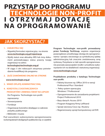 1. ZARJESTRUJ SIĘ! Program Technologie non-profit prowadzony przez Fundację TechSoup, wspiera organizacje pozarządowe umożliwiając dostęp do oprogramo• Wyślij statut oraz aktualny KRS lub inny doku- wania i sprzętu sieciowego za symboliczną opłatę ment poświadczający status prawny twojej administracyjną lub znacznie zredukowaną cenę rynkową. Pozyskane w taki sposób oprogramowaorganizacji na adres: nie pozwala zaoszczędzić środki i umożliwia [email protected] rzystanie ich na działalność statutową organizacji. • W ciągu 5 dni roboczych otrzymasz potwierwww.technologie.org.pl dzenie kwalifikacji do programu • Wypełnij formularz rejestracyjny na stronie www.technologie.org.pl/rejestracja 2. ZŁÓŻ ZAMÓWIENIE ONLINE NA STRONIE www.technologie.org.pl 3. WNIEŚ OPŁATĘ ADMINISTRACYJNĄ 4. KORZYSTAJ Z DOSTARCZONYCH PRODUKTÓW I ZMIENIAJ ŚWIAT NA LEPSZE! Do Programu Technologie non-profit zapraszamy: • Stowarzyszenia • Fundacje • Organizacje kościelne działające w zakresie pożytku publicznego • Biblioteki i muzea Pod warunkiem wykorzystania oprogramowania na komputerach dostępnych publicznie (np. w czytelni) Przykładowe produkty z katalogu Technologie non-profit: • Pakiety biurowe np. Office 2010 w wersji Professional Plus i Standard • Pełny system operacyjny Windows 7 Professional • Oprogramowanie do zarzadzania projektami: Project Professional 2010 • Bazy danych: Access 2010 • Program Księgowy firmy Lefthand • Sprzęt sieciowy Cisco np.: Routery • Regenerowany sprzęt komputerowy od EVK www.technologie.org.pl