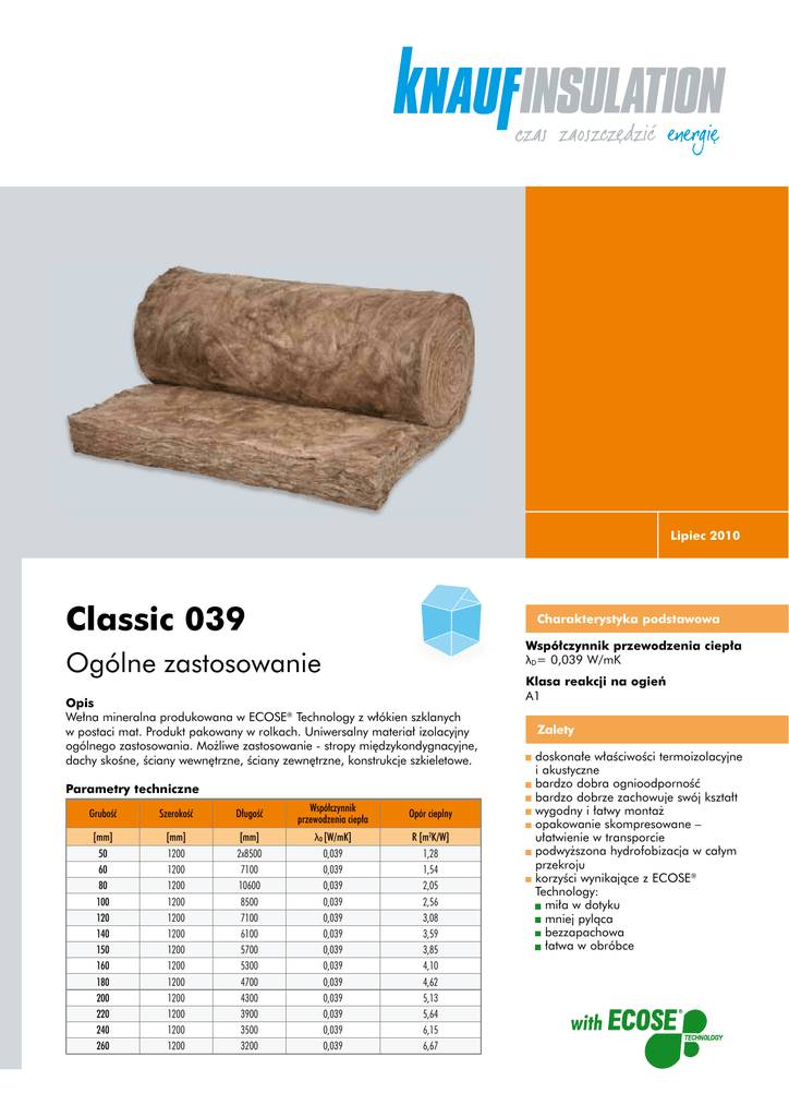 Lipiec 2010 Classic 039 Charakterystyka podstawowa Współczynnik przewodzenia ciepła λD= 0,039 W/mK Ogólne zastosowanie Opis Wełna mineralna produkowana w ECOSE® Technology z włókien szklanych w postaci mat. Produkt pakowany w rolkach. Uniwersalny materiał izolacyjny ogólnego zastosowania. Możliwe zastosowanie - stropy międzykondygnacyjne, dachy skośne, ściany wewnętrzne, ściany zewnętrzne, konstrukcje szkieletowe. Parametry techniczne Grubość Szerokość Długość Współczynnik przewodzenia ciepła Opór cieplny [mm] [mm] [mm] λD [W/mK] R [m2K/W] 50 1200 2x8500 0,039 1,28 60 1200 7100 0,039 1,54 80 1200 10600 0,039 2,05 100 1200 8500 0,039 2,56 120 1200 7100 0,039 3,08 140 1200 6100 0,039 3,59 150 1200 5700 0,039 3,85 160 1200 5300 0,039 4,10 180 1200 4700 0,039 4,62 200 1200 4300 0,039 5,13 220 1200 3900 0,039 5,64 240 1200 3500 0,039 6,15 260 1200 3200 0,039 6,67 Klasa reakcji na ogień A1 Zalety doskonałe właściwości termoizolacyjne i akustyczne bardzo dobra ognioodporność bardzo dobrze zachowuje swój kształt wygodny i łatwy montaż opakowanie skompresowane – ułatwienie w transporcie podwyższona hydrofobizacja w całym przekroju korzyści wynikające z ECOSE® Technology: miła w dotyku mniej pyląca bezzapachowa łatwa w obróbce Classic 039 Parametry techniczne Symbol Wartość Norma Deklarowany współczynnik przewodzenia ciepła λD 0,039 W/mK EN 12 667, EN 12 939 Klasa reakcji na ogień – A1 EN 13 501-1 Klasa tolerancji grubości – T2 EN 823 Wytrzymałość na rozciąganie – > dwukrotny ciężar – Nasiąkliwość wodą przy krótkotrwałym zanurzeniu Wp < 1kg/m2 EN 1609 Nasiąkliwość wodą przy długotrwałym częściowym zanurzeniu Wlp < 3kg/m2 EN 12 087 Współczynnik oporu dyfuzyjnego µ Kod oznaczenia CE Certyfikat zgodności EC Zastosowanie Maty z wełny mineralnej Classic 039 w ECOSE® Technology to materiał ogólnego przeznaczenia. Przeznaczone są do zastosowania jako izolacja cieplna i akustyczna w konstrukcjach ścian z elewacją wentylowaną oraz konstrukcjach ścian szkieletowych drewnianych lub metalowych, jak również jako wypełnienie stropów belkowych oraz konstrukcji dachów skośnych. W konstrukcjach ścian szkieletowych należy od strony wewnętrznej ułożyć paroizolację zabezpieczającą przegrodę przed wilgocią kondensacyjną. Od strony zewnętrznej w konstrukcjach ścian szkieletowych czy w przypadku elewacji wentylowanych zaleca się ułożenie wiatroizolacji w celu eliminacji przewiewania izolacji przez wiatr. W przypadku ścian metalowych kasetowych funkcję bariery paroszczelnej spełnia wewnętrzna okładzina metalowa. Materiał można stosować także w konstrukcjach poziomych (np. stropy drewniane gęstożebrowe, konstrukcje szkieletoworyglowe lub szkieletowe) jako izolację KI-DS/C039/PL-100701 1 EN 12 086 MW-EN 13162-T2-WS-WL(P) EN 13162 0764-CPD-0122 – termiczna i akustyczna układaną między belkami stropów międzykondygnacyjnych. Nad pomieszczeniami o wysokim ciśnieniu pary wodnej (np. podwyższonej temperaturze lub dużej wilgotności względnej) należy stosować folię paroizolacyjną zabezpieczającą materiał izolacyjny przed trwałym zawilgoceniem. Opakowanie Classic 039 jest skompresowany i pakowany w rolkach. Produkt jest dostępny w opakowaniach zbiorczych MPS zabezpieczonych folią PE. Opakowanie ochronne jest opatrzone logiem producenta i etykietą produktu, w której podano podstawowe parametry techniczne wyrobu oraz zalecany podstawowy sposób jego zastosowania. Jakość Knauf Insulation posiada certyfikat jakości dla zintegrowanego systemu zarządzania według norm ISO 9001:2008, EN ISO 14001:2004 oraz OHSAS 18001:2007. Podczas produkcji niniejszego wyrobu nie dochodzi do przekroczenia limitów emisji, które znajdują się pod szczegółową kontrolą działu jakości Knauf Insulation. Naturalna wełna mineralna w ECOSE® Technology to wełna mineralna nowej generacji. Innowacyjna wełna mineralna firmy Knauf Insulation jest produkowana z naturalnie występujących i/lub wtórnych surowców przy wykorzystaniu biotechnologii łączenia włókien bazującej na naturalnych komponentach, wolnej od formaldehydu, fenolu i akrylu, bez dodatku sztucznych barwników oraz substancji rozjaśniających. Dzięki zastosowaniu innowacyjnej substancji spajającej nowa wełna mineralna firmy Knauf Insulation w ECOSE® Technology ma naturalnie brązowy kolor - jest wolna od jakichkolwiek chemicznych barwników Knauf Insulation Sp. z o.o. ul. 17 Stycznia 56 02-146 Warszawa Tel.: +48 22 369 59 00 Faks: +48 22 369 59 10 E-mail: [email protected] Dział Obsługi Klienta Tel.: +48 22 369 59 19 Tel.: +48 22 369 59 20 Tel.: +48 22 369 59 21 Faks: +48 22 369 59 22 E-mail: [email protected] www.knaufinsulation.pl