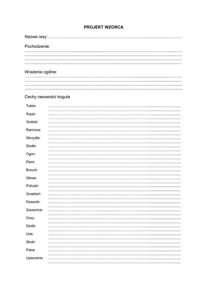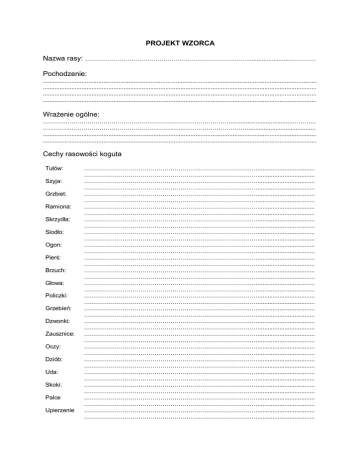 PROJEKT WZORCA Nazwa rasy: ………………………………………………………………………..........................………… Pochodzenie: ................................................................................................................................................................... ................................................................................................................................................................... ................................................................................................................................................................... ................................................................................................................................................................... Wrażenie ogólne: ………………………………………………………………………………….....................................………... …………………………………………………………………………………………........................................ ................................................................................................................................................................... ................................................................................................................................................................... Cechy rasowości koguta Tułów: Szyja: Grzbiet: Ramiona: Skrzydła: Siodło: Ogon: Pierś: Brzuch: Głowa: Policzki: Grzebień: Dzwonki: Zausznice: Oczy: Dziób: Uda: Skoki: Palce Upierzenie ……………………………………………………………………………................................. ……………………………………………………………………………................................. ……………………………………………………………………………................................. ……………………………………………………………………………................................. ……………………………………………………………………………................................. ……………………………………………………………………………................................. ……………………………………………………………………………................................. ……………………………………………………………………………................................. ……………………………………………………………………………................................. ……………………………………………………………………………................................. ……………………………………………………………………………................................. ……………………………………………………………………………................................. ……………………………………………………………………………................................. ……………………………………………………………………………................................. ……………………………………………………………………………................................. ……………………………………………………………………………................................. ……………………………………………………………………………................................. ……………………………………………………………………………................................. ……………………………………………………………………………................................. ……………………………………………………………………………................................. ……………………………………………………………………………................................. ……………………………………………………………………………................................. ……………………………………………………………………………................................. ……………………………………………………………………………................................. ……………………………………………………………………………................................. ……………………………………………………………………………................................. ……………………………………………………………………………................................. ……………………………………………………………………………................................. ……………………………………………………………………………................................. ……………………………………………………………………………................................. ……………………………………………………………………………................................. ……………………………………………………………………………................................. ……………………………………………………………………………................................. ……………………………………………………………………………................................. ……………………………………………………………………………................................. ……………………………………………………………………………................................. …