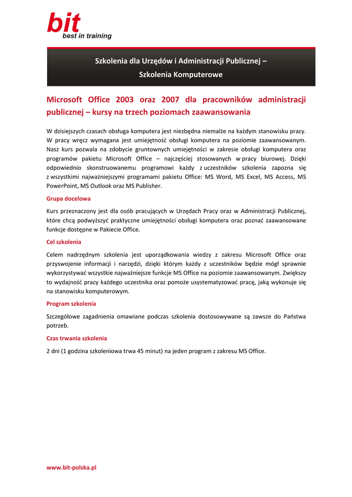 Szkolenia dla Urzędów i Administracji Publicznej – Szkolenia Komputerowe Microsoft Office 2003 oraz 2007 dla pracowników administracji publicznej – kursy na trzech poziomach zaawansowania W dzisiejszych czasach obsługa komputera jest niezbędna niemalże na każdym stanowisku pracy. W pracy wręcz wymagana jest umiejętnośd obsługi komputera na poziomie zaawansowanym. Nasz kurs pozwala na zdobycie gruntownych umiejętności w zakresie obsługi komputera oraz programów pakietu Microsoft Office – najczęściej stosowanych w pracy biurowej. Dzięki odpowiednio skonstruowanemu programowi każdy z uczestników szkolenia zapozna się z wszystkimi najważniejszymi programami pakietu Office: MS Word, MS Excel, MS Access, MS PowerPoint, MS Outlook oraz MS Publisher. Grupa docelowa Kurs przeznaczony jest dla osób pracujących w Urzędach Pracy oraz w Administracji Publicznej, które chcą podwyższyd praktyczne umiejętności obsługi komputera oraz poznad zaawansowane funkcje dostępne w Pakiecie Office. Cel szkolenia Celem nadrzędnym szkolenia jest uporządkowania wiedzy z zakresu Microsoft Office oraz przyswojenie informacji i narzędzi, dzięki którym każdy z uczestników będzie mógł sprawnie wykorzystywad wszystkie najważniejsze funkcje MS Office na poziomie zaawansowanym. Zwiększy to wydajnośd pracy każdego uczestnika oraz pomoże usystematyzowad pracę, jaką wykonuje się na stanowisku komputerowym. Program szkolenia Szczegółowe zagadnienia omawiane podczas szkolenia dostosowywane są zawsze do Paostwa potrzeb. Czas trwania szkolenia 2 dni (1 godzina szkoleniowa trwa 45 minut) na jeden program z zakresu MS Office. www.bit-polska.pl