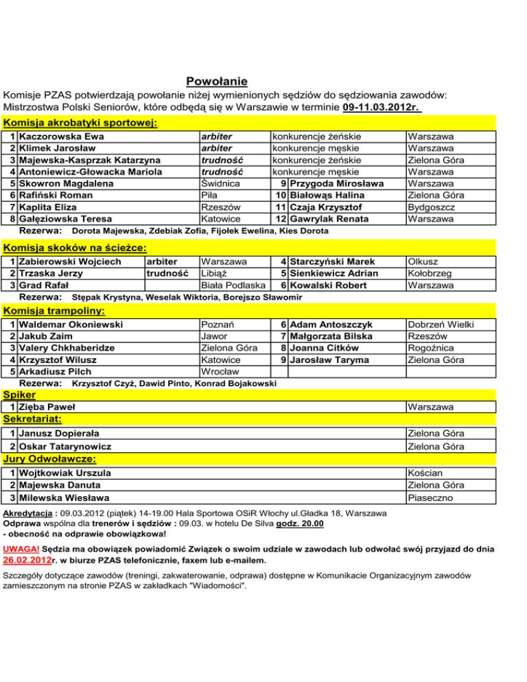 Powołanie Komisje PZAS potwierdzają powołanie niżej wymienionych sędziów do sędziowania zawodów: Mistrzostwa Polski Seniorów, które odbędą się w Warszawie w terminie 09-11.03.2012r. Komisja akrobatyki sportowej: 1 2 3 4 5 6 7 8 Kaczorowska Ewa arbiter konkurencje żeńskie Klimek Jarosław konkurencje męskie arbiter Majewska-Kasprzak Katarzyna konkurencje żeńskie trudność Antoniewicz-Głowacka Mariola trudność konkurencje męskie Skowron Magdalena Świdnica 9 Przygoda Mirosława Rafiński Roman Piła 10 Białowąs Halina Kaplita Eliza Rzeszów 11 Czaja Krzysztof Gałęziowska Teresa Katowice 12 Gawrylak Renata Rezerwa: Dorota Majewska, Zdebiak Zofia, Fijołek Ewelina, Kies Dorota Warszawa Warszawa Zielona Góra Warszawa Warszawa Zielona Góra Bydgoszcz Warszawa Komisja skoków na ścieżce: 1 Zabierowski Wojciech arbiter Warszawa 4 Starczyński Marek 2 Trzaska Jerzy trudność Libiąż 5 Sienkiewicz Adrian 3 Grad Rafał Biała Podlaska 6 Kowalski Robert Rezerwa: Stępak Krystyna, Weselak Wiktoria, Borejszo Sławomir Olkusz Kołobrzeg Warszawa Komisja trampoliny: 1 2 3 4 5 Waldemar Okoniewski Poznań Jakub Zaim Jawor Valery Chkhaberidze Zielona Góra Krzysztof Wilusz Katowice Arkadiusz Pilch Wrocław Rezerwa: Krzysztof Czyż, Dawid Pinto, Konrad Bojakowski 6 7 8 9 Adam Antoszczyk Małgorzata Bilska Joanna Citków Jarosław Taryma Dobrzeń Wielki Rzeszów Rogoźnica Zielona Góra Spiker 1 Zięba Paweł Warszawa Sekretariat: 1 Janusz Dopierała Zielona Góra 2 Oskar Tatarynowicz Zielona Góra Jury Odwoławcze: 1 Wojtkowiak Urszula 2 Majewska Danuta 3 Milewska Wiesława Kościan Zielona Góra Piaseczno Akredytacja : 09.03.2012 (piątek) 14-19.00 Hala Sportowa OSiR Włochy ul.Gładka 18, Warszawa Odprawa wspólna dla trenerów i sędziów : 09.03. w hotelu De Silva godz. 20.00 - obecność na odprawie obowiązkowa! UWAGA! Sędzia ma obowiązek powiadomić Związek o swoim udziale w zawodach lub odwołać swój przyjazd do dnia 26.02.2012r. w biurze PZAS telefonicznie, faxem lub e-mailem. Szczegóły dotyczące zawodów (treningi, zakwaterowanie, odprawa) dostępne w Komunikacie Organizacyjnym zawodów zamieszczonym na stronie PZAS w zakładkach "Wiadomości".