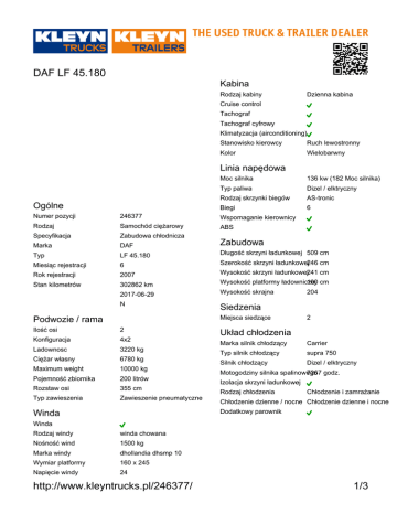 DAF LF 45.180 Kabina Rodzaj kabiny Dzienna kabina Cruise control Tachograf Tachograf cyfrowy Klimatyzacja (airconditioning) Stanowisko kierowcy Ruch lewostronny Kolor Wielobarwny Linia napędowa Ogólne Moc silnika 136 kw (182 Moc silnika) Typ paliwa Dizel / elktryczny Rodzaj skrzynki biegów AS-tronic Biegi 6 Numer pozycji 246377 Wspomaganie kierownicy Rodzaj Samochód ciężarowy ABS Specyfikacja Zabudowa chłodnicza Marka DAF Zabudowa Typ LF 45.180 Długość skrzyni ładunkowej 509 cm Miesiąc rejestracji 6 Szerokość skrzyni ładunkowej246 cm Rok rejestracji 2007 Wysokość skrzyni ładunkowej241 cm Stan kilometrów 302862 km Wysokość platformy ładowniczej 100 cm 2017-06-29 Wysokość skrajna N Siedzenia Miejsca siedzące Podwozie / rama Ilość osi 2 Konfiguracja 4x2 Ladownosc 3220 kg Ciężar własny 6780 kg Maximum weight 10000 kg Pojemność zbiornika 200 litrów Rozstaw osi 355 cm Typ zawieszenia Zawieszenie pneumatyczne 204 2 Układ chłodzenia Marka silnik chłodzący Carrier Typ silnik chłodzący supra 750 Silnik chłodzący Dizel / elktryczny Motogodziny silnika spalinowego 7267 godz. Izolacja skrzyni ładunkowej Rodzaj chłodzenia Chłodzenie i zamrażanie Chłodzenie dzienne / nocne Chłodzenie dzienne i nocne Dodatkowy parownik Winda Winda Rodzaj windy winda chowana Nośność wind 1500 kg Marka windy dhollandia dhsmp 10 Wymiar platformy 160 x 245 Napięcie windy 24 http://www.kleyntrucks.pl/246377/ 1/3 DAF LF 45.180 Ilość osi mm mm Hamulce tarczowe Rodzaj osi skrętnej Mechaniczne Typ zawieszenia Zawieszenie resorowe Wymiar opony 235/75R17,5 Oś skrętna Raport inspekcji Tachograf Kody wyświetlacza Elektryczny Kolumna kierownicу Resory mm mm Hamulce tarczowe Typ zawieszenia Zawieszenie pneumatyczne Wymiar opony 235/75R17,5 Rama Idealny/nowy Hamulce Bardzo dobry Silnik - całość Rozsądny Stan Układ chłodzenia Akceptowalny Układ paliwowy Nie spełnia wymagań Układ wydechowy Układ smarowania Skrzynka biegów Sprzęgło Napęd Układy Obsługa Układ Opony http://www.kleyntrucks.pl/246377/ 2/3 DAF LF 45.180 http://www.kleyntrucks.pl/246377/ 3/3