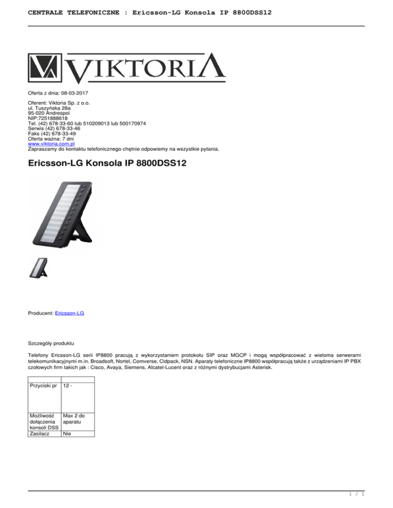 CENTRALE TELEFONICZNE : Ericsson-LG Konsola IP 8800DSS12 Oferta z dnia: 08-03-2017 Oferent: Viktoria Sp. z o.o. ul. Tuszyńska 28a 95-020 Andrespol NIP:7251888618 Tel. (42) 678-33-60 lub 510209013 lub 500170974 Serwis (42) 678-33-46 Faks (42) 678-33-49 Oferta ważna: 7 dni www.viktoria.com.pl Zapraszamy do kontaktu telefonicznego chętnie odpowiemy na wszystkie pytania. Ericsson-LG Konsola IP 8800DSS12 Producent: Ericsson-LG Szczegóły produktu Telefony Ericsson-LG serii IP8800 pracują z wykorzystaniem protokołu SIP oraz MGCP i mogą współpracować z wieloma serwerami telekomunikacyjnymi m.in. Broadsoft, Nortel, Comverse, Cidpack, NSN. Aparaty telefoniczne IP8800 współpracują także z urządzeniami IP PBX czołowych firm takich jak : Cisco, Avaya, Siemens, Alcatel-Lucent oraz z różnymi dystrybucjami Asterisk. Przyciski pr 12 - Możliwość Max 2 do dołączenia aparatu konsoli DSS Zasilacz Nie 1 / 1 Powered by TCPDF (www.tcpdf.org)