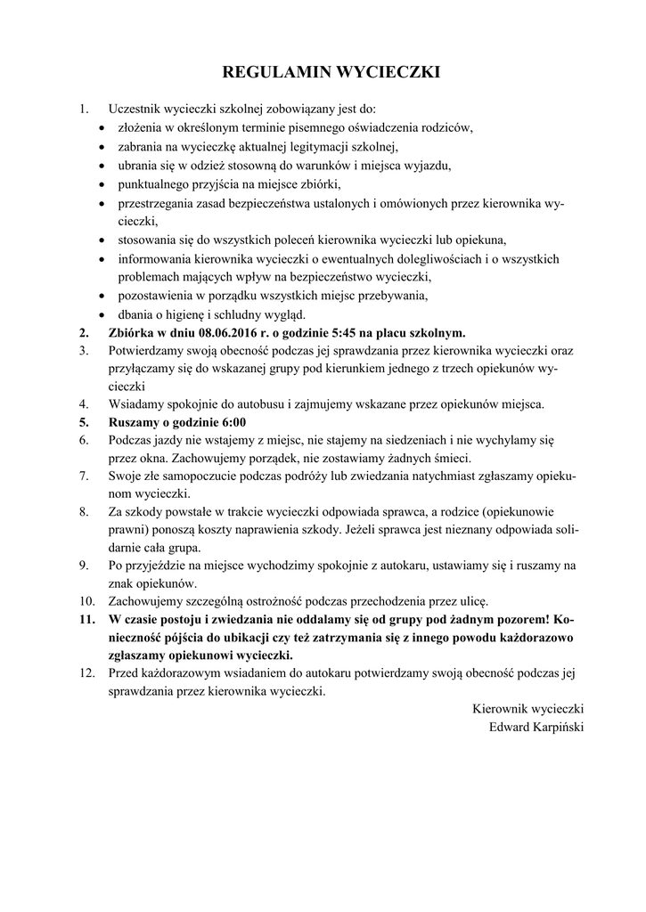 REGULAMIN WYCIECZKI Uczestnik wycieczki szkolnej zobowiązany jest do: złożenia w określonym terminie pisemnego oświadczenia rodziców, zabrania na wycieczkę aktualnej legitymacji szkolnej, ubrania się w odzież stosowną do warunków i miejsca wyjazdu, punktualnego przyjścia na miejsce zbiórki, przestrzegania zasad bezpieczeństwa ustalonych i omówionych przez kierownika wycieczki, stosowania się do wszystkich poleceń kierownika wycieczki lub opiekuna, informowania kierownika wycieczki o ewentualnych dolegliwościach i o wszystkich problemach mających wpływ na bezpieczeństwo wycieczki, pozostawienia w porządku wszystkich miejsc przebywania, dbania o higienę i schludny wygląd. 2. Zbiórka w dniu 08.06.2016 r. o godzinie 5:45 na placu szkolnym. 3. Potwierdzamy swoją obecność podczas jej sprawdzania przez kierownika wycieczki oraz przyłączamy się do wskazanej grupy pod kierunkiem jednego z trzech opiekunów wycieczki 4. Wsiadamy spokojnie do autobusu i zajmujemy wskazane przez opiekunów miejsca. 5. Ruszamy o godzinie 6:00 6. Podczas jazdy nie wstajemy z miejsc, nie stajemy na siedzeniach i nie wychylamy się przez okna. Zachowujemy porządek, nie zostawiamy żadnych śmieci. 7. Swoje złe samopoczucie podczas podróży lub zwiedzania natychmiast zgłaszamy opiekunom wycieczki. 8. Za szkody powstałe w trakcie wycieczki odpowiada sprawca, a rodzice (opiekunowie prawni) ponoszą koszty naprawienia szkody. Jeżeli sprawca jest nieznany odpowiada solidarnie cała grupa. 9. Po przyjeździe na miejsce wychodzimy spokojnie z autokaru, ustawiamy się i ruszamy na znak opiekunów. 10. Zachowujemy szczególną ostrożność podczas przechodzenia przez ulicę. 11. W czasie postoju i zwiedzania nie oddalamy się od grupy pod żadnym pozorem! Konieczność pójścia do ubikacji czy też zatrzymania się z innego powodu każdorazowo zgłaszamy opiekunowi wycieczki. 12. Przed każdorazowym wsiadaniem do autokaru potwierdzamy swoją obecność podczas jej sprawdzania przez kierownika wycieczki. Kierownik wycieczki Edward Karpiński 1.