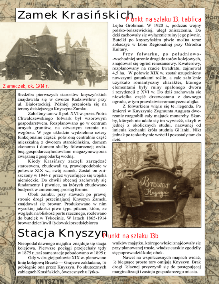 Zamek Krasinskich Punkt na szlaku 13, tablica Zameczek, ok. 1914 r. Siedziba pierwszych starostów knyszyńskich znajdowała się w dworze Radziwiłłów przy ul. Białostockiej. Później przeniosła się na tereny dzisiejszego Knyszyna Zamku. Założony tam w II poł. XVI w. przez Piotra Chwalczewskiego folwark był wzorowym gospodarstwem. Rozplanowano go w centrum ornych gruntów, na otwartym terenie na wzgórzu. W jego układzie wydzielono cztery funkcjonalne części: położoną centralnie część mieszkalną z dworem starościńskim, domem ekonoma i domem służby folwarcznej; ozdobną; gospodarczą hodowlano-magazynową oraz związaną z gospodarką wodną. Kiedy Krasińscy zaczęli zarządzać starostwem, zbudowali tu, prawdopodobnie w połowie XIX w., swój zamek. Został on zniszczony w 1944 r. przez wycofujące się wojska niemieckie. Do chwili obecnej zachowały się fundamenty i piwnice, na których zbudowano budynek w zmienionej, prostej formie. Obok zamku, przy stawach po prawej stronie drogi przecinającej Knyszyn Zamek, znajdował się browar. Produkowano w nim wysokiej jakości piwo typu pilzner, które, ze względu na bliskość portu rzecznego, rozlewano do butelek w Tykocinie. W latach 1865-1914 browar dzierżawił żydowski przedsiębiorca Lejba Grobman. W 1920 r., podczas wojny polsko-bolszewickiej, uległ zniszczeniu. Do dziś zachowały się wyłącznie ruiny jego piwnic. Butelki po knyszyńskim piwie można teraz zobaczyć w Izbie Regionalnej przy Ośrodku Kultury. Przy folwarku, po południowo-wschodniej stronie drogi do torów kolejowych, znajdował się ogród renesansowy. Kwaterowy, rozplanowany na rzucie kwadratu, zajmował 4,5 ha. W połowie XIX w. został uzupełniony nowszymi gatunkami roślin, a całe założenie uzyskało romantyczny charakter, którego elementami były ruiny spalonego dworu i rezydencji z XVI w. Do dziś zachowała się niewielka część drzewostanu z dawnego ogrodu, w tym prawdziwie romantyczna alejka. Z folwarkiem wiąże się też legenda. Po śmierci w Knyszynie Zygmunta Augusta dworzanie rozgrabili cały majątek monarchy. Skarby, których nie udało się im wywieźć, ukryli w jednej z okolicznych studni, nazwanej od imienia kochanki króla studnią Giżanki. Nikt jednak po te skarby nie wrócił i pozostały tam do dziś. Stacja Knyszyn Punkt na szlaku 13b Nieopodal dawnego majątku znajduje się stacja kolejowa. Pierwsze pociągi przejechały tędy w 1875 r., zaś samą stację pobudowano w 1895 r. Gdy w drugiej połowie XIX w. planowano linię kolejową Brześć — Grajewo zakładano, że pobiegnie ona przez Knyszyn. Po skutecznych zabiegach Krasińskich, ówczesnych użytko- wników majątku, którego włości znajdowały się przy planowanej trasie, władze carskie zgodziły się poprowadzić kolej obok. Nawet na współczesnych mapach widać, że biegnące prosto tory omijają Knyszyn. Brak drogi żelaznej przyczynił się do postępującej marginalizacji i zastoju gospodarczego miasta.
