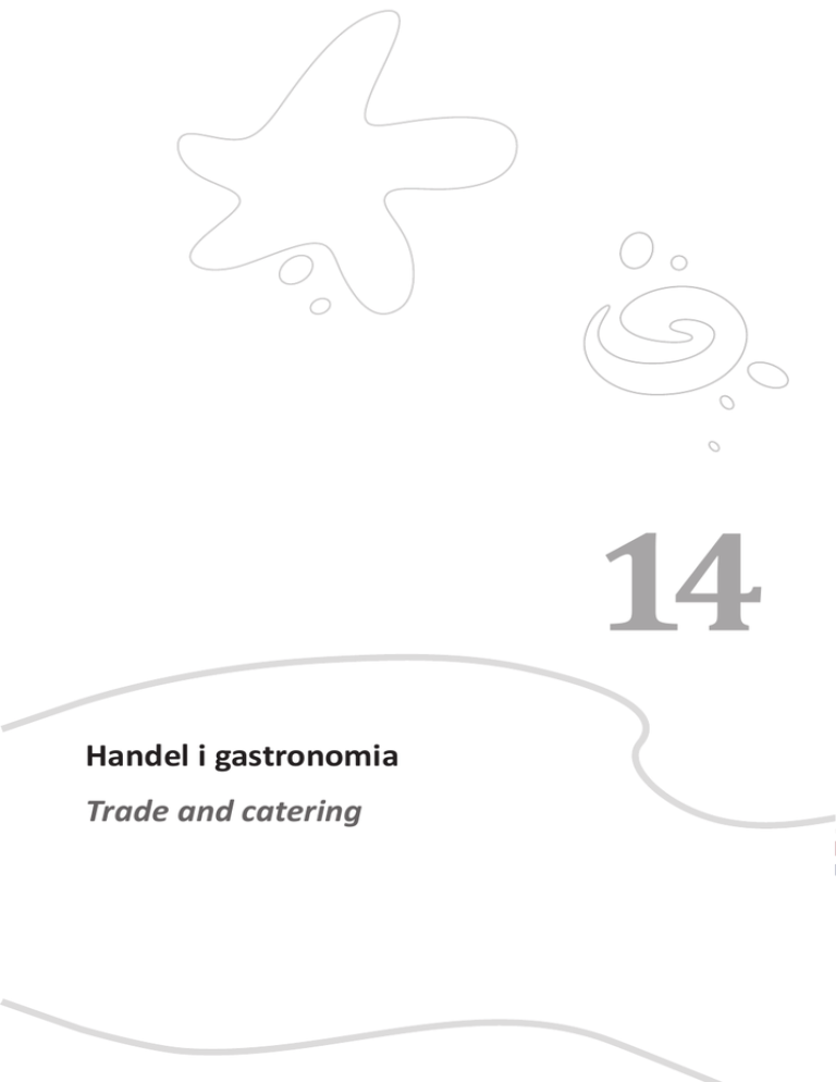 14 Handel i gastronomia Trade and catering HANDEL I GASTRONOMIA 226 UWAGI OGÓLNE GENERAL NOTES 1. Informacje w dziale dotyczą jednostek gospodarki narodowej prowadzących działalność handlową, w których liczba pracujących przekracza 9 osób. Przez przedsiębiorstwa handlowe rozumie się podmioty gospodarcze, których podstawowym rodzajem działalności jest sprzedaż towarów, zaliczana zgodnie z Polską Klasyfikacją Działalności do sekcji "Handel hurtowy i detaliczny; naprawa pojazdów samochodowych, włączając motocykle". 2. Dane o pracujących oraz liczbie sklepów w podziale na rodzaje specjalizacji opracowano na podstawie klas Polskiej Klasyfikacji Działalności; podziału dokonano na postawie przeważającego udziału danej grupy towarów w sprzedaży ogółem. Sklepy podaje się łącznie z aptekami ogólnodostępnymi. 3. Podziału sklepów według form organizacyjnych dokonano na podstawie wielkości powierzchni sprzedażowej sklepów i rodzaju sprzedawanych w nich towarów. Domy towarowe i handlowe są to sklepy wielodziałowe, prowadzące sprzedaż szerokiego i uniwersalnego asortymentu, głównie towarów nieżywnościowych, o powierzchni sal sprzedażowych: domy towarowe – 2000 m2 i więcej, domy handlowe – od 600 do 1999 m2, mogą również prowadzić pomocniczą działalność gastronomiczną i usługową. Supermarkety są to sklepy o powierzchni sprzedażowej od 400 m2 do 2499 m2 prowadzące sprzedaż głównie w systemie samoobsługowym, oferujące szeroki asortyment artykułów żywnościowych oraz artykuły nieżywnościowe częstego zakupu. Hipermarkety są to sklepy o powierzchni sprzedażowej od 2500 m2 prowadzące sprzedaż głównie w systemie samoobsługowym, oferujące szeroki asortyment artykułów żywnościowych i nieżywnościowych częstego zakupu, zwykle z parkingiem samochodowym. Sklepy powszechne są to sklepy prowadzące sprzedaż głównie towarów żywnościowych codziennego użytku, o powierzchni sal sprzedażowych od 120 do 399 m2. Sklepy wyspecjalizowane są to sklepy prowadzące sprzedaż szerokiego asortymentu artykułów do kompleksowego zaspokojenia określonych potrzeb, np. ubioru, wyposażenia mieszkań, sklepy motoryzacyjne, meblowe, sportowe itp. Do innych sklepów zaliczono sklepy o powierzchni sal sprzedażowych do 119 m2. 1. Information in this chapter, concerns entities of the national economy conducting trade activity, employing more 9 persons. Trade enterprises are understood as economic entities, the basic activity of which is the sale of commodities, classified accordance with NACE rev. 2 in the section “Wholesale and retail trade; repair of motor vehicles and motorcycles”. 2. Data regarding employment as well as the number of stores according to types of specialization are compiled according to NACE classes; the division was made on the basis of the predominant share of a given group of goods in total sales. Shops include public pharmacies. 3. The division of stores by organizational form was made on the basis of the area of the sales floor and the types of goods sold. Department stores and trade stores are stores divided into separate departments, each selling a broad and universal assortment, particularly non-foodstuff goods, with a sales area of 2000 m2 and more for department stores and from 600 to 1999 m2 for trade stores, they may also conduct support food and service activities. Supermarkets are stores with a sales area from 400 to 2499 m2, selling goods in a selfservice system and offering a wide assortment of foodstuff goods and frequently bought nonfoodstuff goods. Hypermarkets are stores with a sales area 2500 m2 and more, selling goods in a self-service system and offering a wide assortment of foodstuff goods and frequently bought non-foodstuff goods, usually with a parking place. Grocery stores are stores primarily selling foodstuff goods for daily consumption, with a sales area from 120 to 399 m2. Specialized stores are stores selling a wide assortment of articles to fully meet specific needs, (e.g. clothing, home furnishings, car parts, furniture, sporting goods, etc.). Other stores include stores with a sales area up to 119 m2. 4. Catering establishments include permanent and seasonal catering establishments and outlets, the scope of activity of which is the preparation and sale of meals and beverages for on-site and take-out consumption. Seasonal catering establishments are open for a certain period of time and operate not longer than six months in a calendar year. Portable retail sales points and vending machines are not treated as catering establishments. 5. Trade warehouses (wholesale and retail) are the organizational and functional units of economic entities engaged in the turnover of commodities. A warehouse is an entity designated for storing commodities, occupying separate storage space, equipped with the technical and organizational means as well as with the personnel to service these means and, in addition, registrating amount and the changes in stocks. 6. Data regarding trade and catering activity are compiled on the basis of reporting. TRADE AND CATERING 4. Do placówek gastronomicznych zaliczono zakłady i punkty gastronomiczne stałe i sezonowe, których przedmiotem działalności jest przygotowanie oraz sprzedaż posiłków i napojów do spożycia na miejscu i na wynos. Sezonowe placówki gastronomiczne uruchamiane są okresowo i działają nie dłużej niż sześć miesięcy w roku kalendarzowym. Do placówek gastronomicznych nie zalicza się ruchomych punktów sprzedaży detalicznej i automatów sprzedażowych. 5. Magazyny handlowe (hurtu i detalu) są jednostkami organizacyjno-funkcjonalnymi podmiotów gospodarczych zajmujących się obrotem towarów. Magazynem jest jednostka przeznaczona do magazynowania towarów, zajmująca wyodrębnioną przestrzeń magazynową, wyposażona w środki techniczne i organizacyjne, dysponująca personelem do obsługi tych środków oraz prowadz