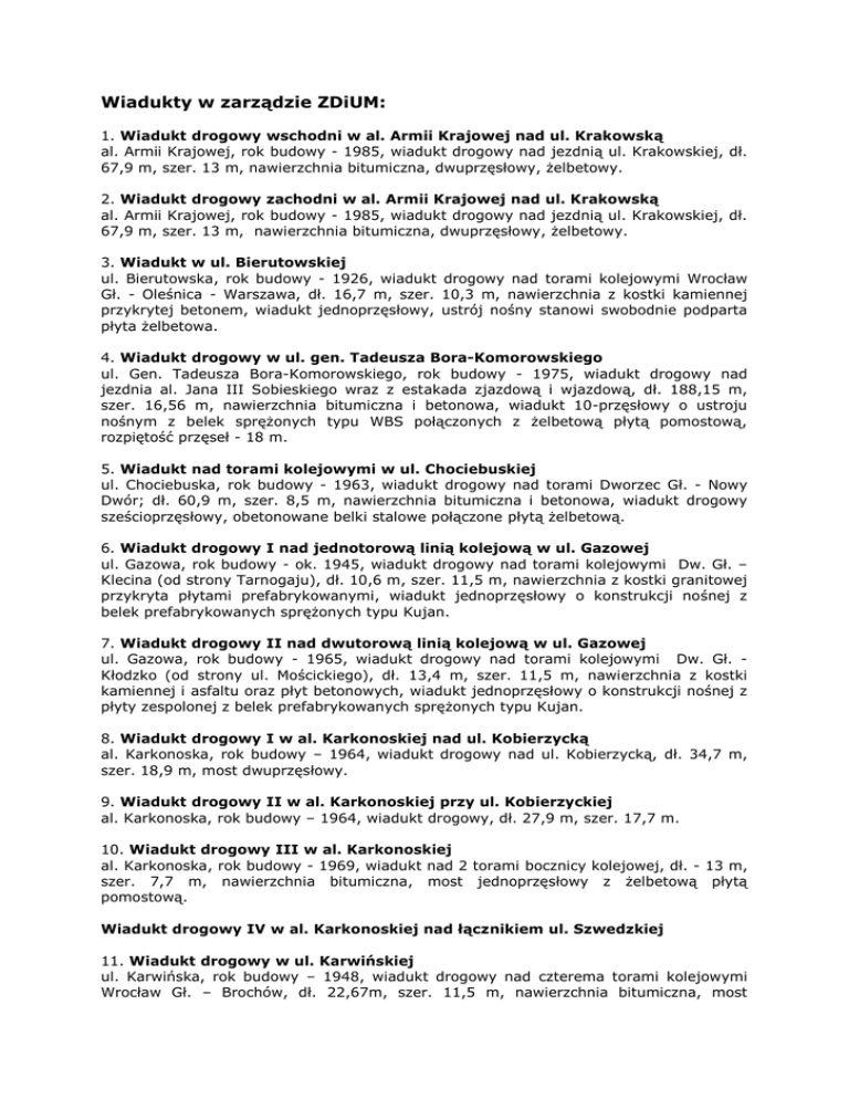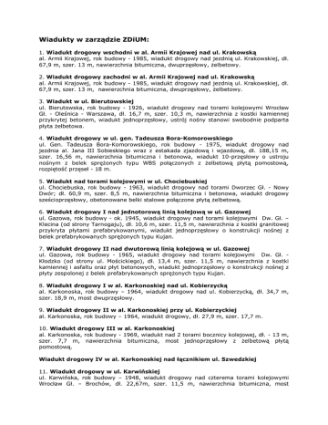 Wiadukty w zarządzie ZDiUM: 1. Wiadukt drogowy wschodni w al. Armii Krajowej nad ul. Krakowską al. Armii Krajowej, rok budowy - 1985, wiadukt drogowy nad jezdnią ul. Krakowskiej, dł. 67,9 m, szer. 13 m, nawierzchnia bitumiczna, dwuprzęsłowy, żelbetowy. 2. Wiadukt drogowy zachodni w al. Armii Krajowej nad ul. Krakowską al. Armii Krajowej, rok budowy - 1985, wiadukt drogowy nad jezdnią ul. Krakowskiej, dł. 67,9 m, szer. 13 m, nawierzchnia bitumiczna, dwuprzęsłowy, żelbetowy. 3. Wiadukt w ul. Bierutowskiej ul. Bierutowska, rok budowy - 1926, wiadukt drogowy nad torami kolejowymi Wrocław Gł. - Oleśnica - Warszawa, dł. 16,7 m, szer. 10,3 m, nawierzchnia z kostki kamiennej przykrytej betonem, wiadukt jednoprzęsłowy, ustrój nośny stanowi swobodnie podparta płyta żelbetowa. 4. Wiadukt drogowy w ul. gen. Tadeusza Bora-Komorowskiego ul. Gen. Tadeusza Bora-Komorowskiego, rok budowy - 1975, wiadukt drogowy nad jezdnia al. Jana III Sobieskiego wraz z estakada zjazdową i wjazdową, dł. 188,15 m, szer. 16,56 m, nawierzchnia bitumiczna i betonowa, wiadukt 10-przęsłowy o ustroju nośnym z belek sprężonych typu WBS połączonych z żelbetową płytą pomostową, rozpiętość przęseł - 18 m. 5. Wiadukt nad torami kolejowymi w ul. Chociebuskiej ul. Chociebuska, rok budowy - 1963, wiadukt drogowy nad torami Dworzec Gł. - Nowy Dwór; dł. 60,9 m, szer. 8,5 m, nawierzchnia bitumiczna i betonowa, wiadukt drogowy sześcioprzęsłowy, obetonowane belki stalowe połączone płytą żelbetową. 6. Wiadukt drogowy I nad jednotorową linią kolejową w ul. Gazowej ul. Gazowa, rok budowy - ok. 1945, wiadukt drogowy nad torami kolejowymi Dw. Gł. – Klecina (od strony Tarnogaju), dł. 10,6 m, szer. 11,5 m, nawierzchnia z kostki granitowej przykryta płytami prefabrykowanymi, wiadukt jednoprzęsłowy o konstrukcji nośnej z belek prefabrykowanych sprężonych typu Kujan. 7. Wiadukt drogowy II nad dwutorową linią kolejową w ul. Gazowej ul. Gazowa, rok budowy - 1965, wiadukt drogowy nad torami kolejowymi Dw. Gł. Kłodzko (od strony ul. Mościckiego), dł. 13,4 m, szer. 11,5 m, nawierzchnia z kostki kamiennej i asfaltu oraz płyt betonowych, wiadukt jednoprzęsłowy o konstrukcji nośnej z płyty zespolonej z belek prefabrykowanych sprężonych typu Kujan. 8. Wiadukt drogowy I w al. Karkonoskiej nad ul. Kobierzycką al. Karkonoska, rok budowy – 1964, wiadukt drogowy nad ul. Kobierzycką, dł. 34,7 m, szer. 18,9 m, most dwuprzęsłowy. 9. Wiadukt drogowy II w al. Karkonoskiej przy ul. Kobierzyckiej al. Karkonoska, rok budowy – 1964, wiadukt drogowy, dł. 27,9 m, szer. 17,7 m. 10. Wiadukt drogowy III w al. Karkonoskiej al. Karkonoska, rok budowy - 1969, wiadukt nad 2 torami bocznicy kolejowej, dł. - 13 m, szer. 7,7 m, nawierzchnia bitumiczna, most jednoprzęsłowy z żelbetową płytą pomostową. Wiadukt drogowy IV w al. Karkonoskiej nad łącznikiem ul. Szwedzkiej 11. Wiadukt drogowy w ul. Karwińskiej ul. Karwińska, rok budowy – 1948, wiadukt drogowy nad czterema torami kolejowymi Wrocław Gł. – Brochów, dł. 22,67m, szer. 11,5 m, nawierzchnia bitumiczna, most jednoprzęsłowy, konstrukcja: nośna z 10 typowych sprężonych prefabrykowanych WBS zespolonych żelbetową płytą pomostową. dźwigarów 12. Wiadukt drogowy w ul. Kowalskiej ul. Kowalska, rok budowy - 1978, wiadukt drogowy nad ul. Bolesława Krzywoustego, dł. 106,2 m, szer. 12,72 m, nawierzchnia bitumiczna, wiadukt 7-przęsłowy o konstrukcji monolitycznej płaskiej. 13. Wiadukt drogowy w ul. Bolesława Krzywoustego ul. Bolesława Krzywoustego, rok budowy - 1978, wiadukt nad jezdnią al. Jana III Sobieskiego - wyjazd z Psiego Pola do mostu B. Krzywoustego, dł. 72 m, szer. 12,825 m, nawierzchnia asfaltowo-betonowa, wiadukt 4-przęsłowy o konstrukcji nośnej z belek prefabrykowanych typu Płońsk. 14. Wiadukt drogowy nad torami tramwajowymi w ul. Lotniczej ul. Lotnicza, rok budowy - 1977, dł. 25,6 m, szer. 6,65 m. 15. Wiadukt w ul. Strzegomskiej ul. Strzegomska, rok budowy - 1960, wiadukt drogowy nad torami kolejowymi: Dworzec Gł. - Gądów, dł. 44 m, szer. 6 m, szer. jezdni - 6 m; nawierzchnia bitumiczna; wiadukt drogowy dwuprzęsłowy o konstrukcji kratowej, nitowanej oraz żelbetowej. 16. Wiadukt płn. nad torami kolejowymi w ul. Kosmonautów ul. Lotnicza – ul. Kosmonautów, rok budowy – 2012, dł. całkowita 17,9m, szer. – 17,58m, konstrukcja: strunobeton. Wiadukt płd. nad torami kolejowymi w ul. Kosmonautów 17. Wiadukt drogowy zachodni nad torami kolejowymi w al. Armii Krajowej ul. Krakowska – al. Armii Krajowej, rok budowy – 1976-1978, dł. 78,5 m, szer. 10 m, konstrukcja: stalowa. 18. Wiadukt drogowy wschodni nad torami kolejowymi w al. Armii Krajowej al. Armii Krajowej – ul. Krakowska, rok budowy – 1976-1978, dł. 78,5 m, szer. 10 m, konstrukcja: stalowa. 19. Wiadukt drogowy północny w ul. Lotniczej nad al. Śląską ul. Lotnicza, rok budowy – 2012, dł. 14,8 m, szer. 53,3 m, konstrukcja: strunobeton. 20. Wiadukt drogowy południowy w ul. Lotniczej nad al. Śląską ul. Lotnicza, rok budowy – 2012, dł. 14,37m, szer. 53,3 m, konstrukcja: strunobeton. 21. Wiadukt drogowy północny w ciągu ul. Lotniczej nad esplanadą Stadionu Miejskiego ul. Lotnicza, wiadukt nad ul. Warciańską, rok budowy – 2012, dł. 17,57 m, szer. 49,36 m, konstrukcja: strunobeton. 22. Wiadukt drogowy południowy w ciągu ul. Lotniczej nad esplanadą Stadionu Miejskiego ul. Lotnicza, wiadukt nad ul. Warciańską, rok budowy – 2012, dł. 17,57 m, szer. 49,36 m, konstrukcja: strunobeton. 23. Wiadukt drogowy północny w ul. Kosmonautów nad ul. Szczecińską ul. Kosmonautów, rok budowy – 2012, dł. 74,50 m, szer. 10,50 m, konstrukcja: strunobeton. 24. Wiadukt drogowy południowy w ul. Kosmonautów nad ul. Szczecińską ul. Kosmonautów, rok budowy – 2012, dł. 74,50 m, szer. 10,50 m, konstrukcja: strunobeton. 25. Wiadukt drogowy płn. nad torami kolejowymi i ul. Ćwiczebną w ul. Jana Nowaka-Jeziora